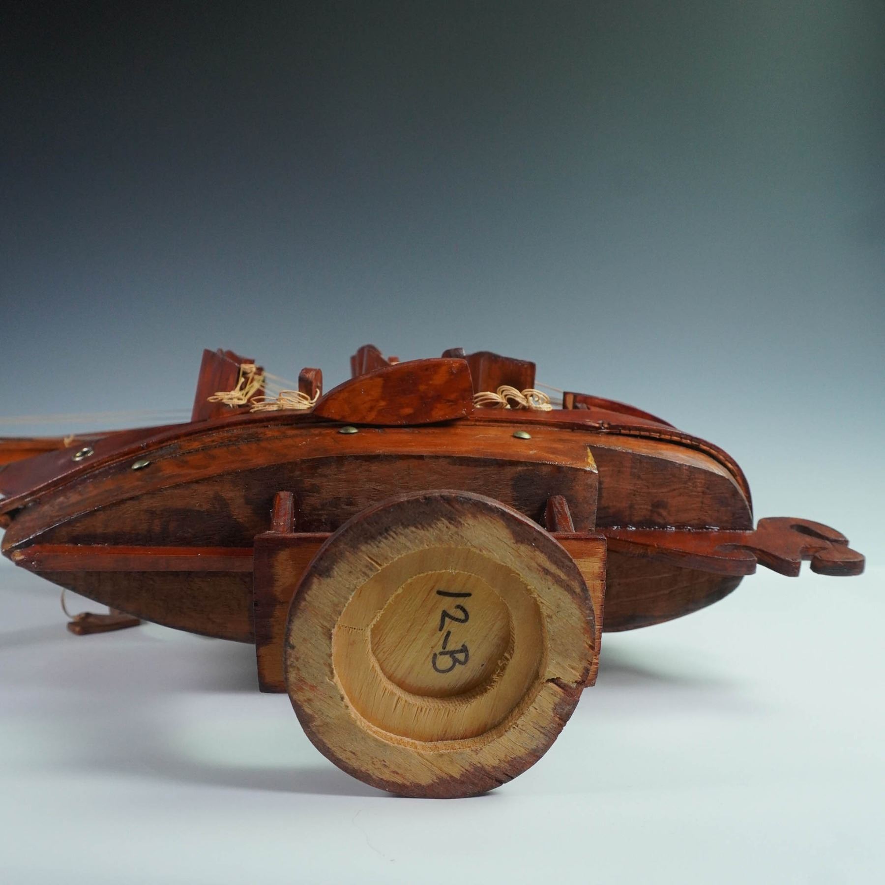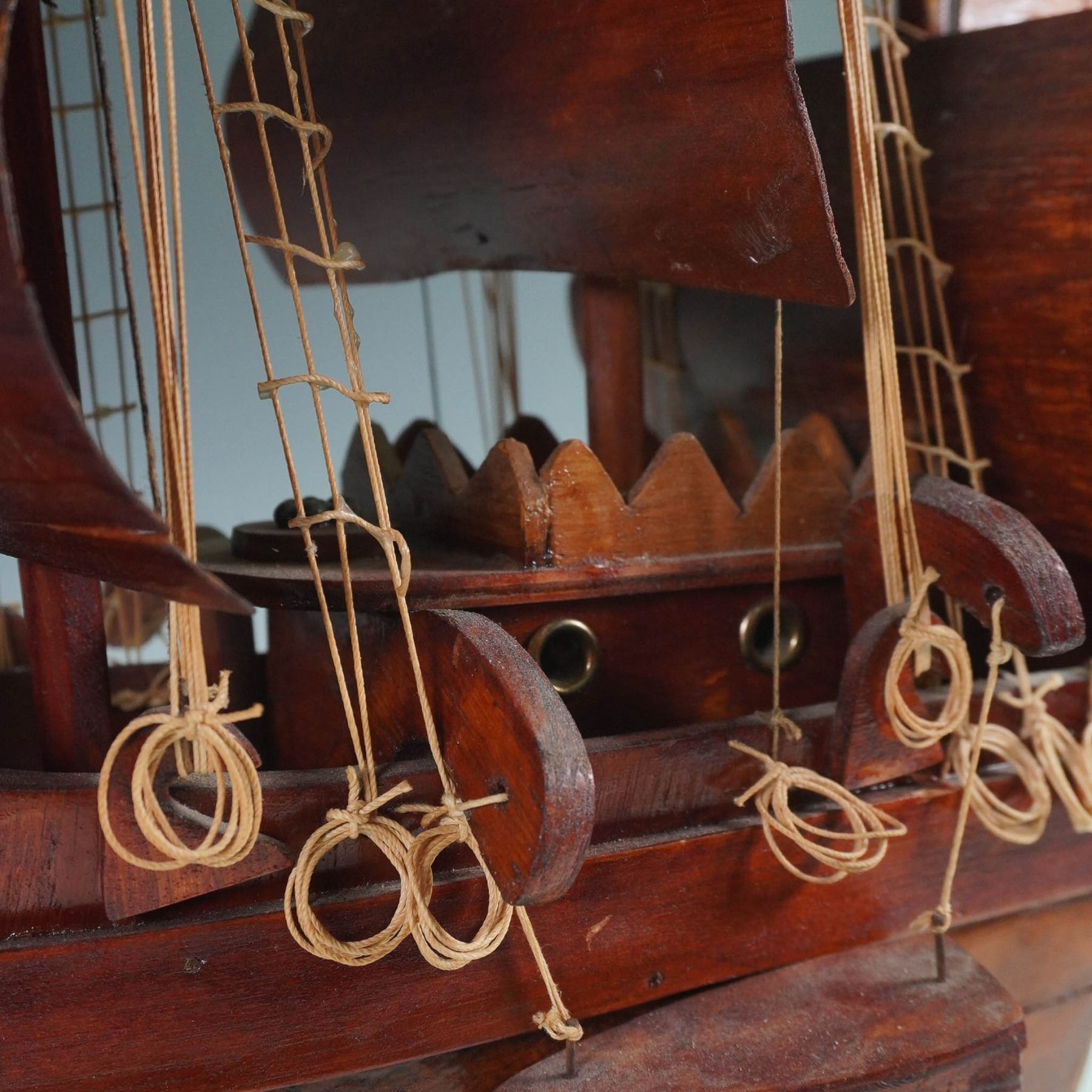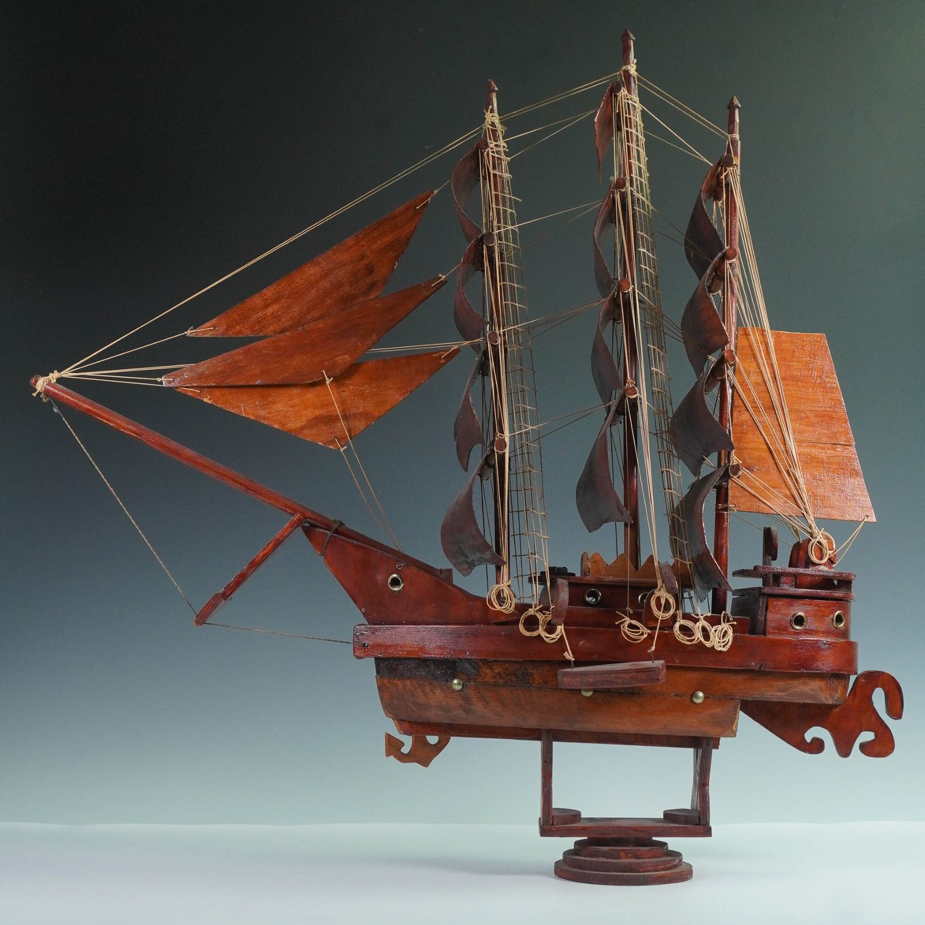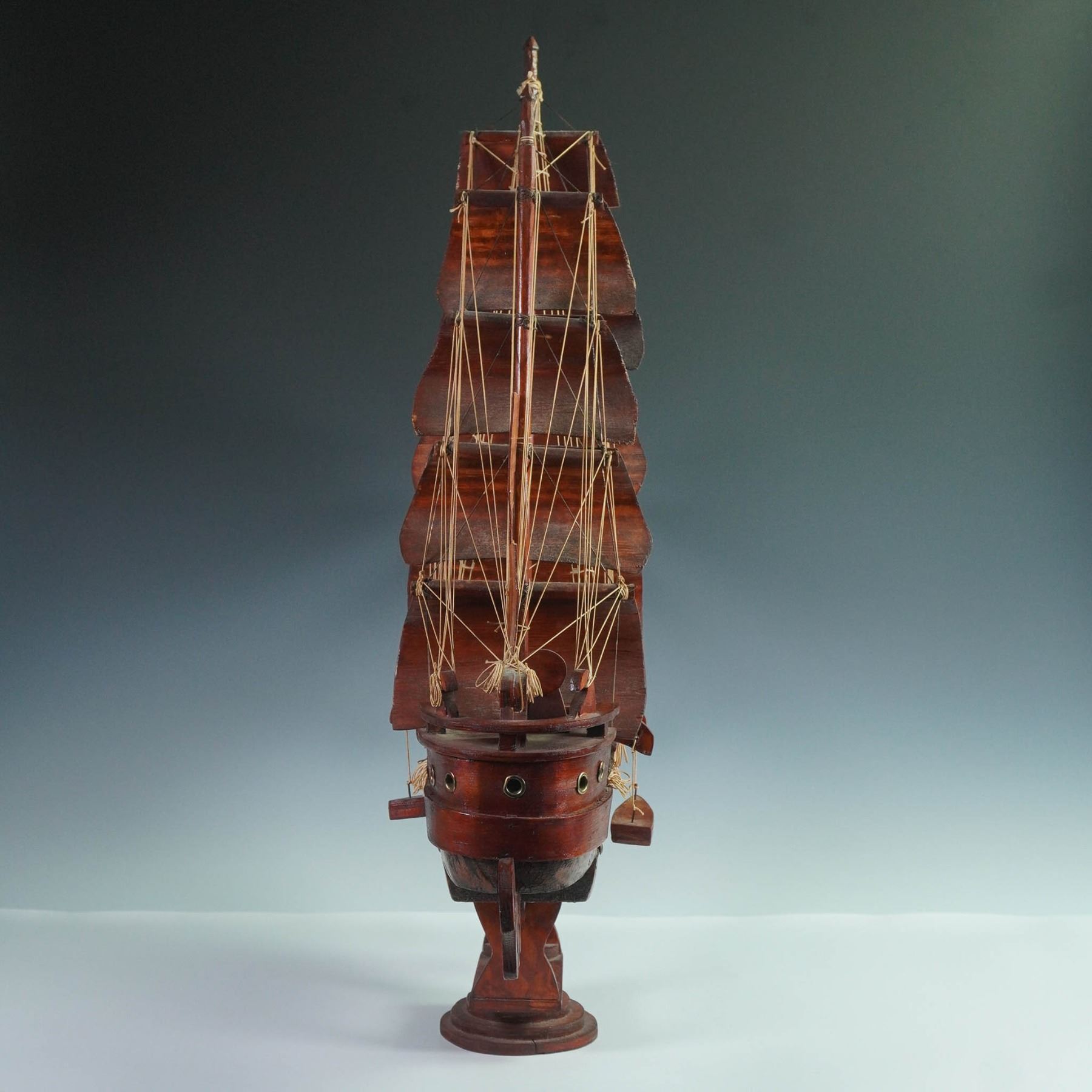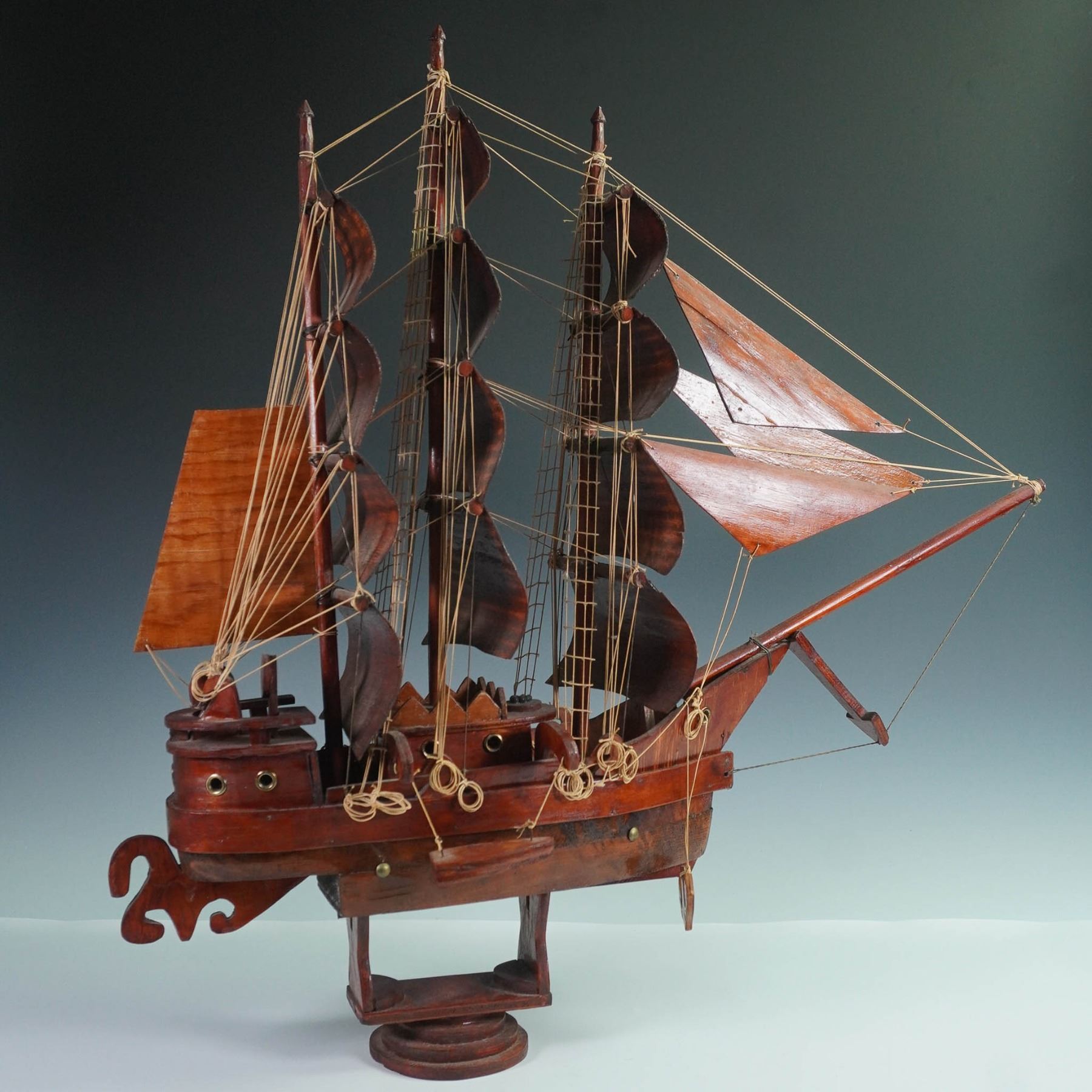 A handcrafted wooden model of a traditional sailing vessel, featuring a multi-mast rig with wooden sails, rigging, and detailed elements. Designed as a decorative piece, the model captures the silhouette and proportions of a classic tall ship, evoking maritime history and nautical craftsmanship.