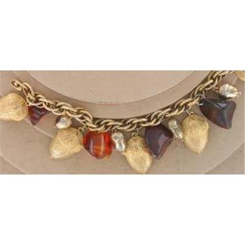 Purchased in Pennsylvania and had a hunch it was bakelite. Simichrome tested. Fantastic chunky gold tone dangling bracelet. Acorns and chunks of Bakelite. While I believe this bracelet must be designer I was not able to locate a name.