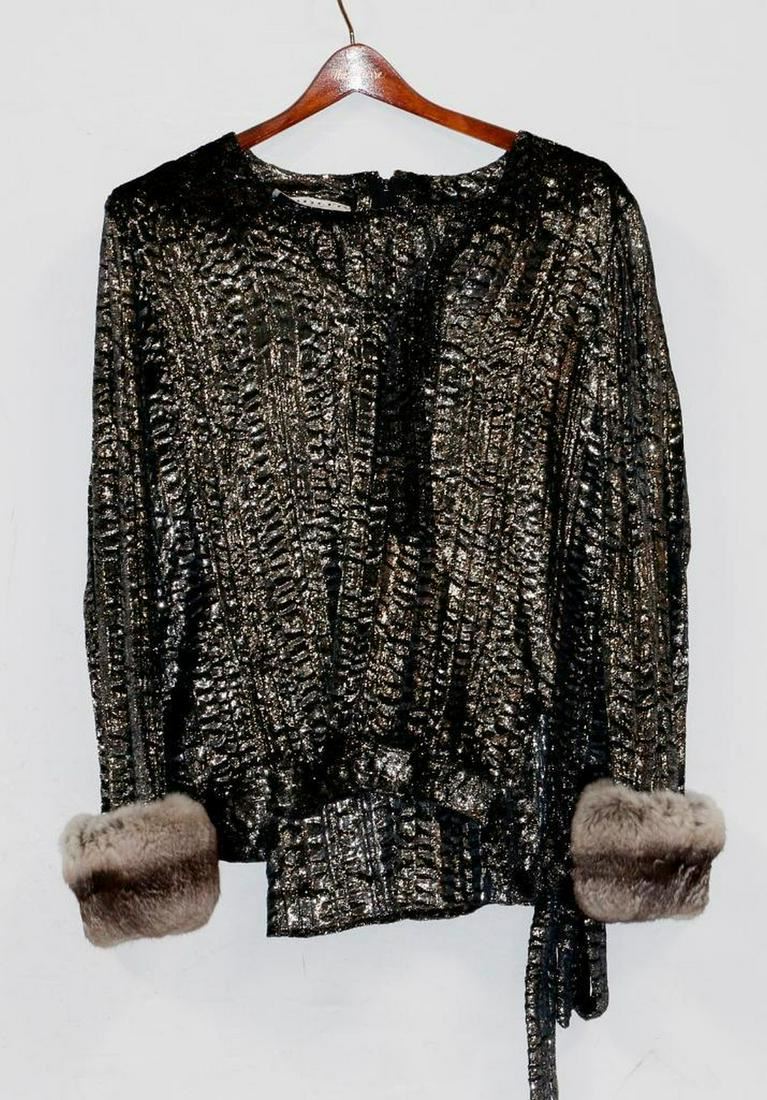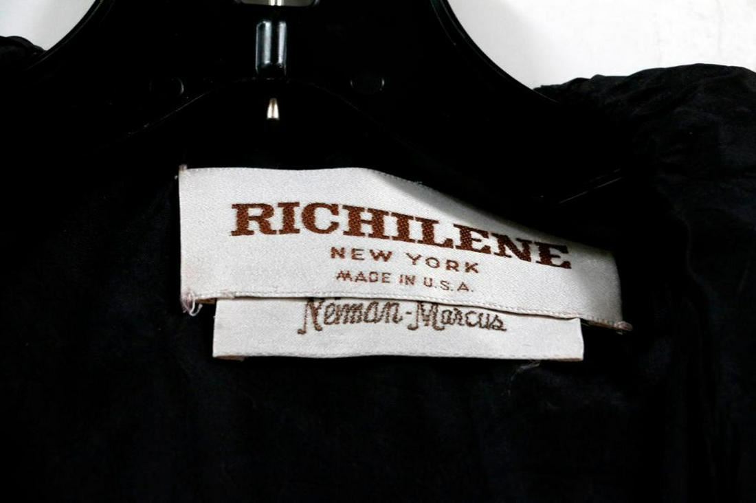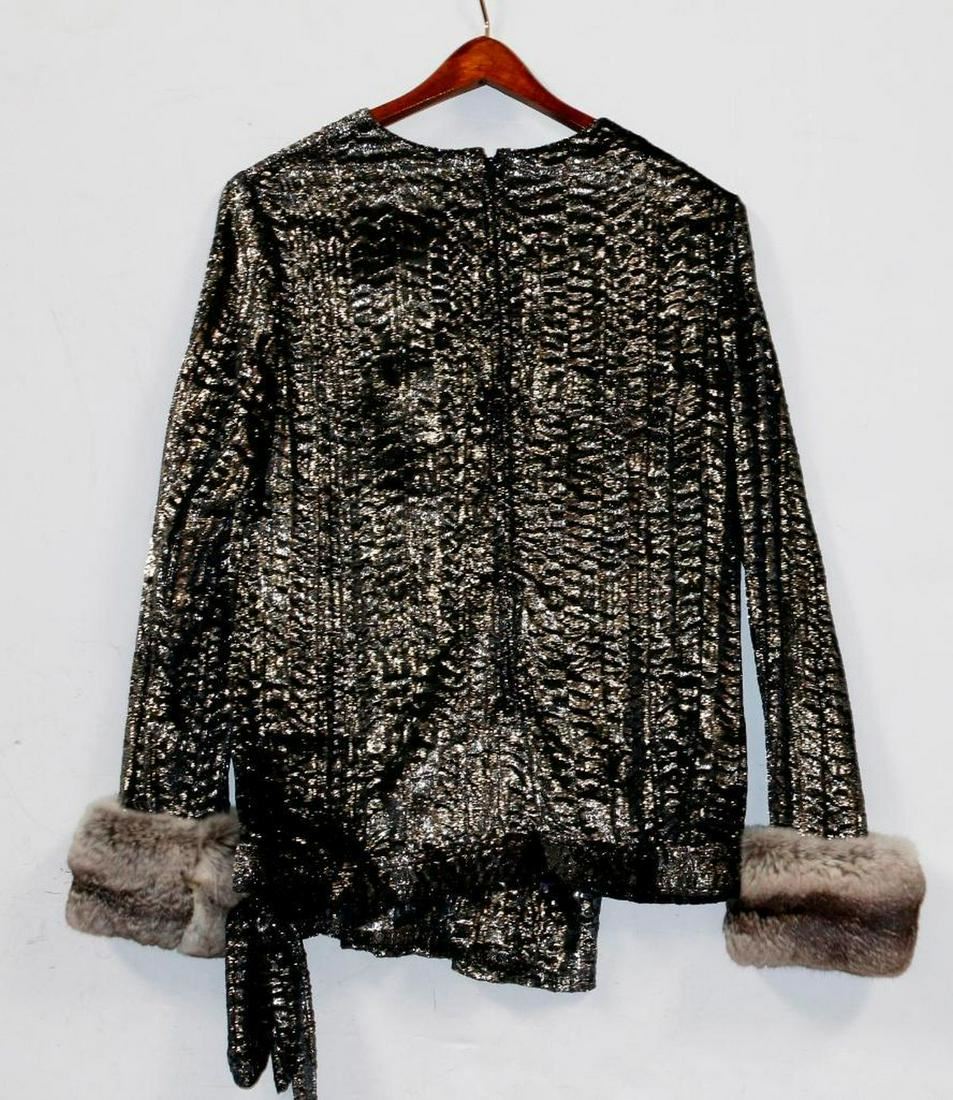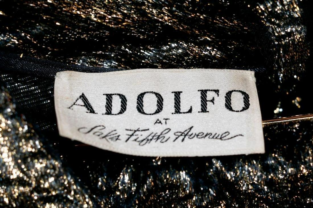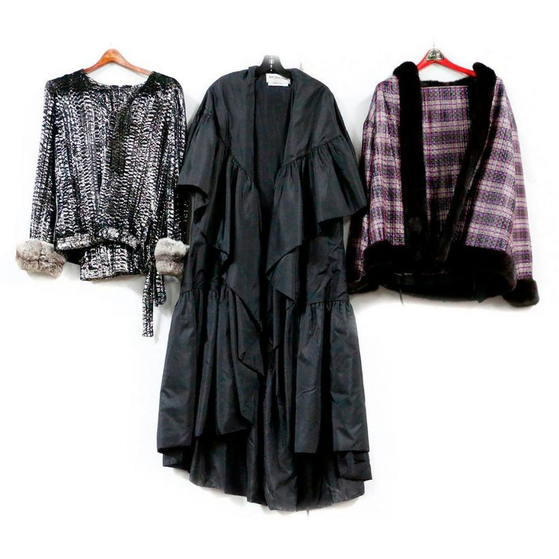 Including: Richilene NY, retailed by Neiman Marcus, black crepe ruffled cape Adolfo at Saks Fifth Avenue black & silver pants set with fur cuffs, no size Adolfo at Saks fifth Avenue pants suit with reversible fur jacket, size 10 Items are sold as is. Please inquire about condition if not otherwise stated.