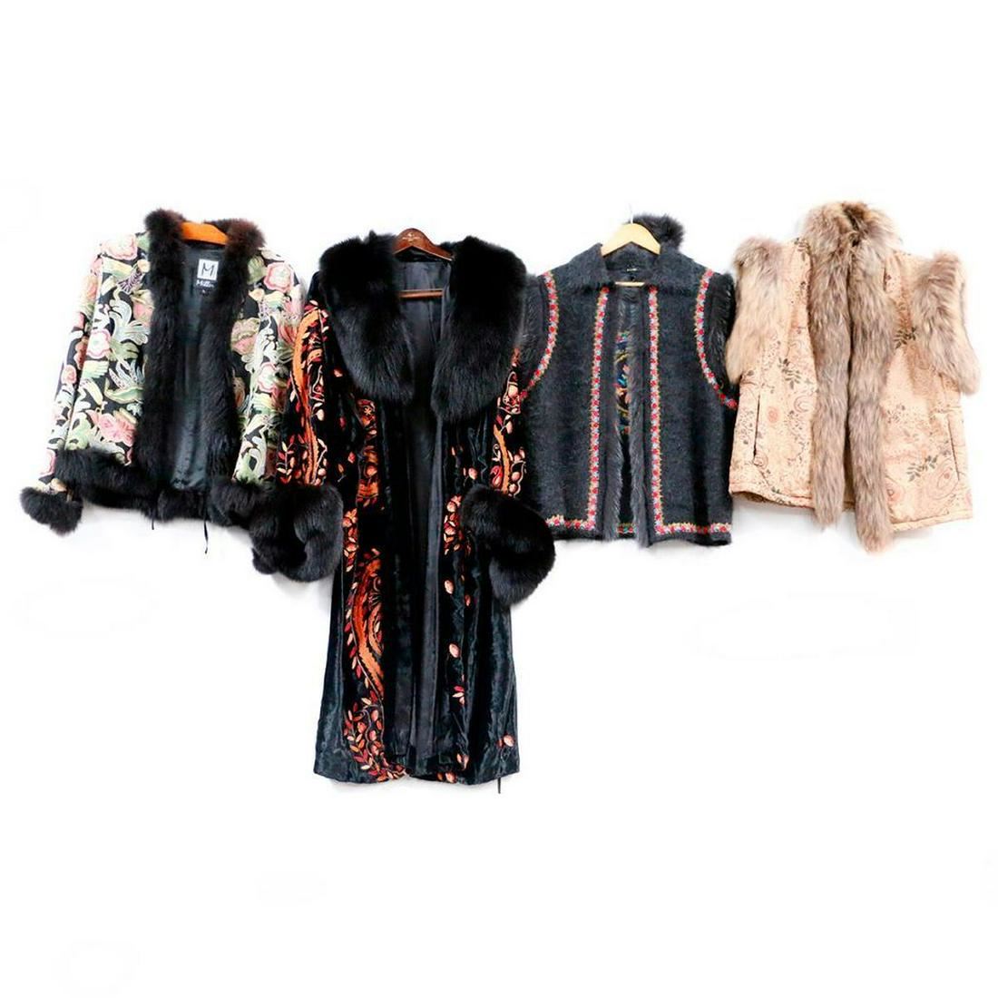 Including: Escada vest, size 44 Miller embroidered jacket, size L Velvet embroidered long coat, no size Autier Italy cotton vest, size 10 Items are sold as is. Please inquire about condition if not otherwise stated.
