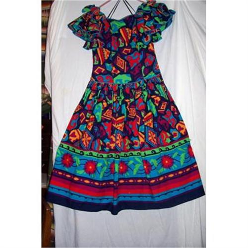 Colorfull, and lovely cotton fabric dress. The kind of cotton that evidently is no more, thick 100% cotton, no synthetics, colorfull mod designs. Off the shoulder dress elasticized, boned bust, very well made. Dress is 40 inches from neck to hem, 34 inches around the bust, armpit to armpit, the waist is 30 inches. A generously gathered skirt, handkerchief hem. In unworn condition, never washed. thanks for shopping in the Land of Enchantment!