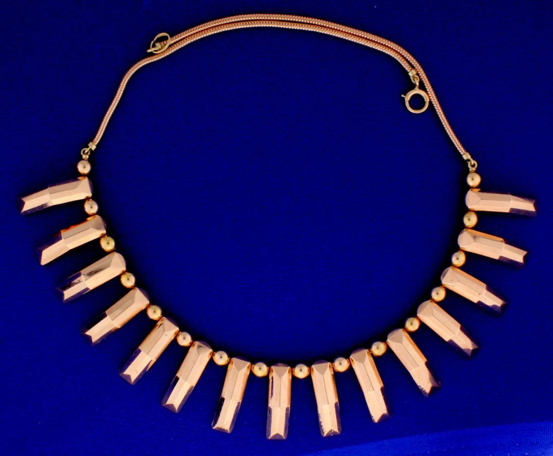 In 14K rose gold the necklace is 17 inches long with snake chain. This is a one of a kind custom made necklace that is a true conversation starter. Pairs with earrings and pin in next lots. 41.4g