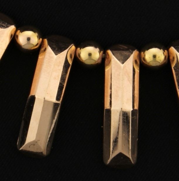 In 14K rose gold the necklace is 17 inches long with snake chain. This is a one of a kind custom made necklace that is a true conversation starter. Pairs with earrings and pin in next lots. 41.4g