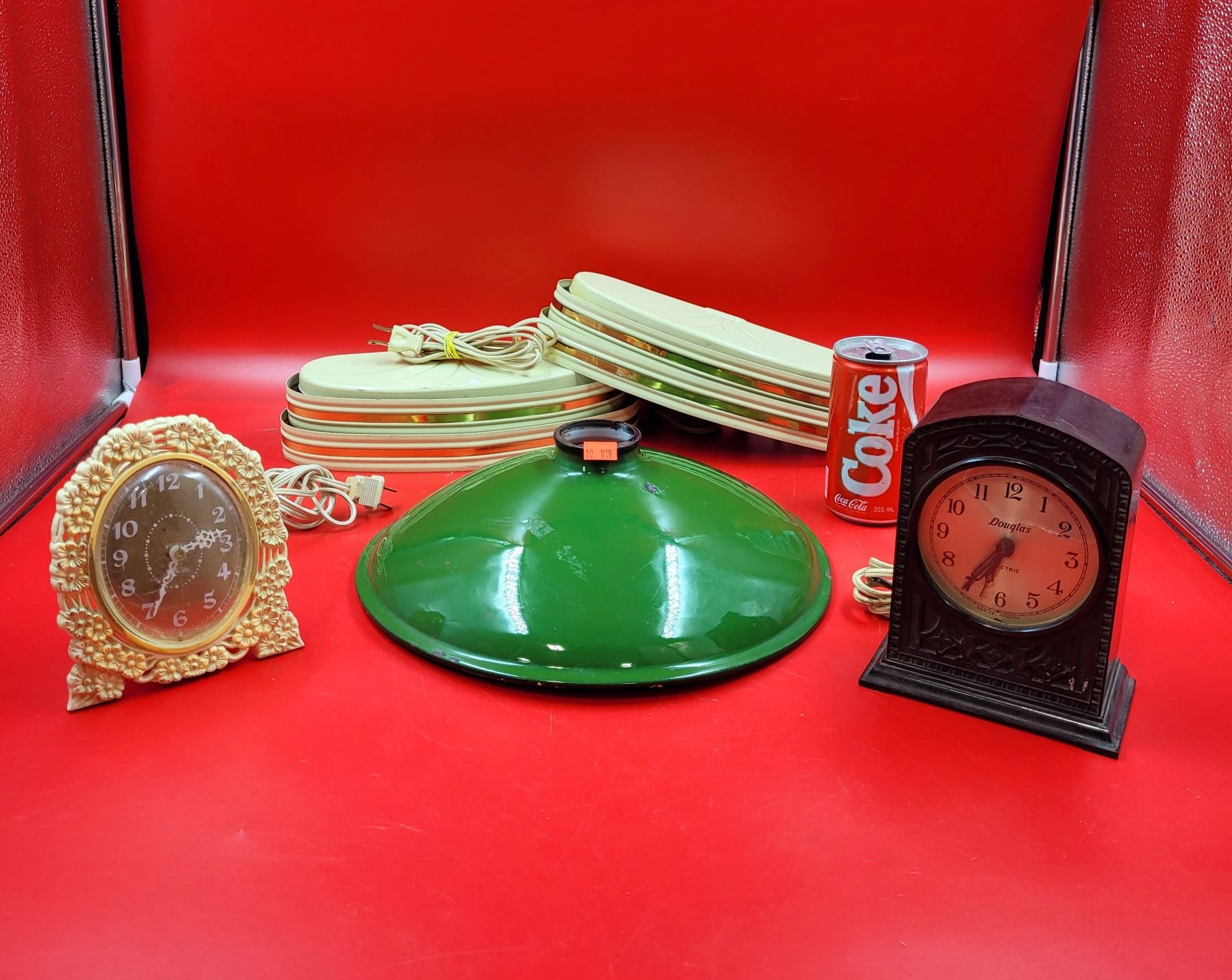 Vintage Desk Clocks, Enamal Gas Station Light Shade and MCM Headboard Lights