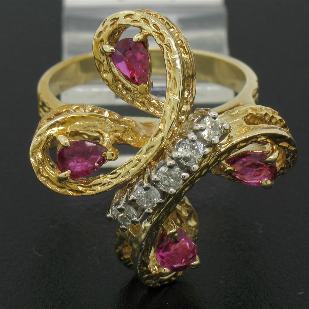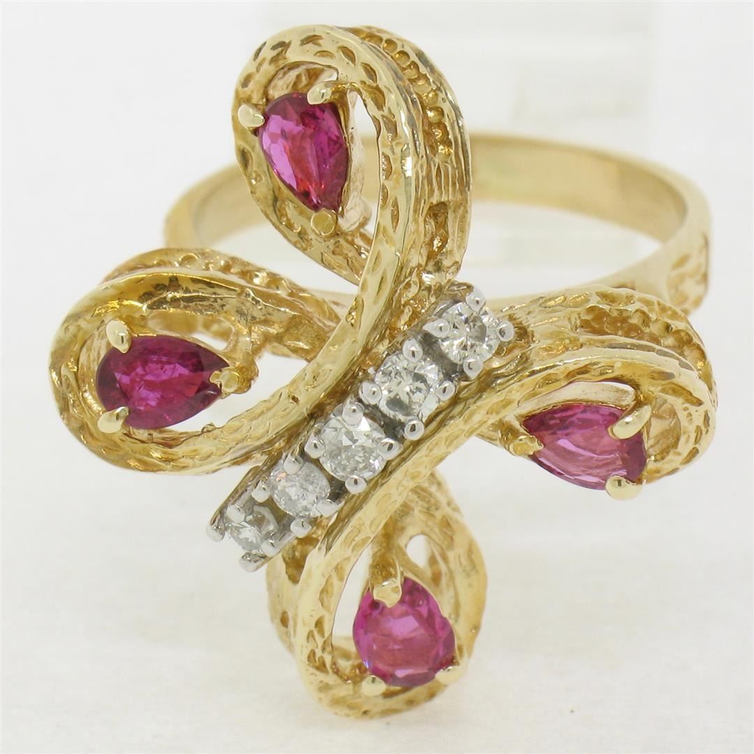 Vintage Detailed 14k Yellow Gold 1.35 ctw Pear Ruby Round Diamond Open Butterfly