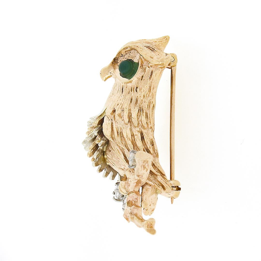 A vintage solid 14k yellow & white gold own brooch, with 2 round cabochon cut natural Chalcedony (2.75mm each), and 3 round brilliant cut natural diamonds (F/G - VS1/VS2 ; 0.09ctw). Measures 28.20x38.40mm and weighs a total of 11.05 grams.