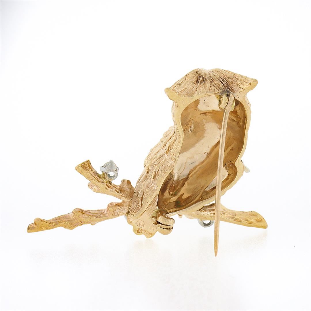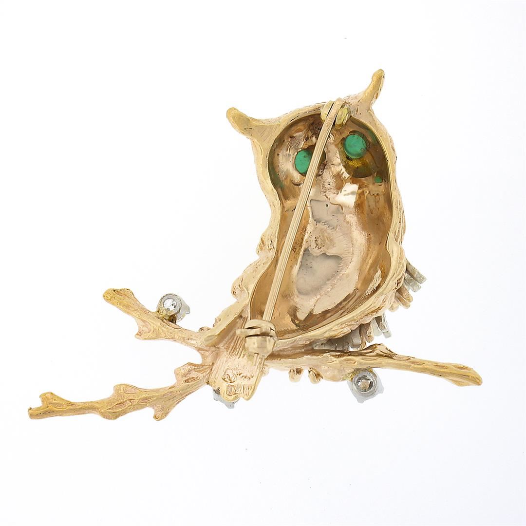 A vintage solid 14k yellow & white gold own brooch, with 2 round cabochon cut natural Chalcedony (2.75mm each), and 3 round brilliant cut natural diamonds (F/G - VS1/VS2 ; 0.09ctw). Measures 28.20x38.40mm and weighs a total of 11.05 grams.