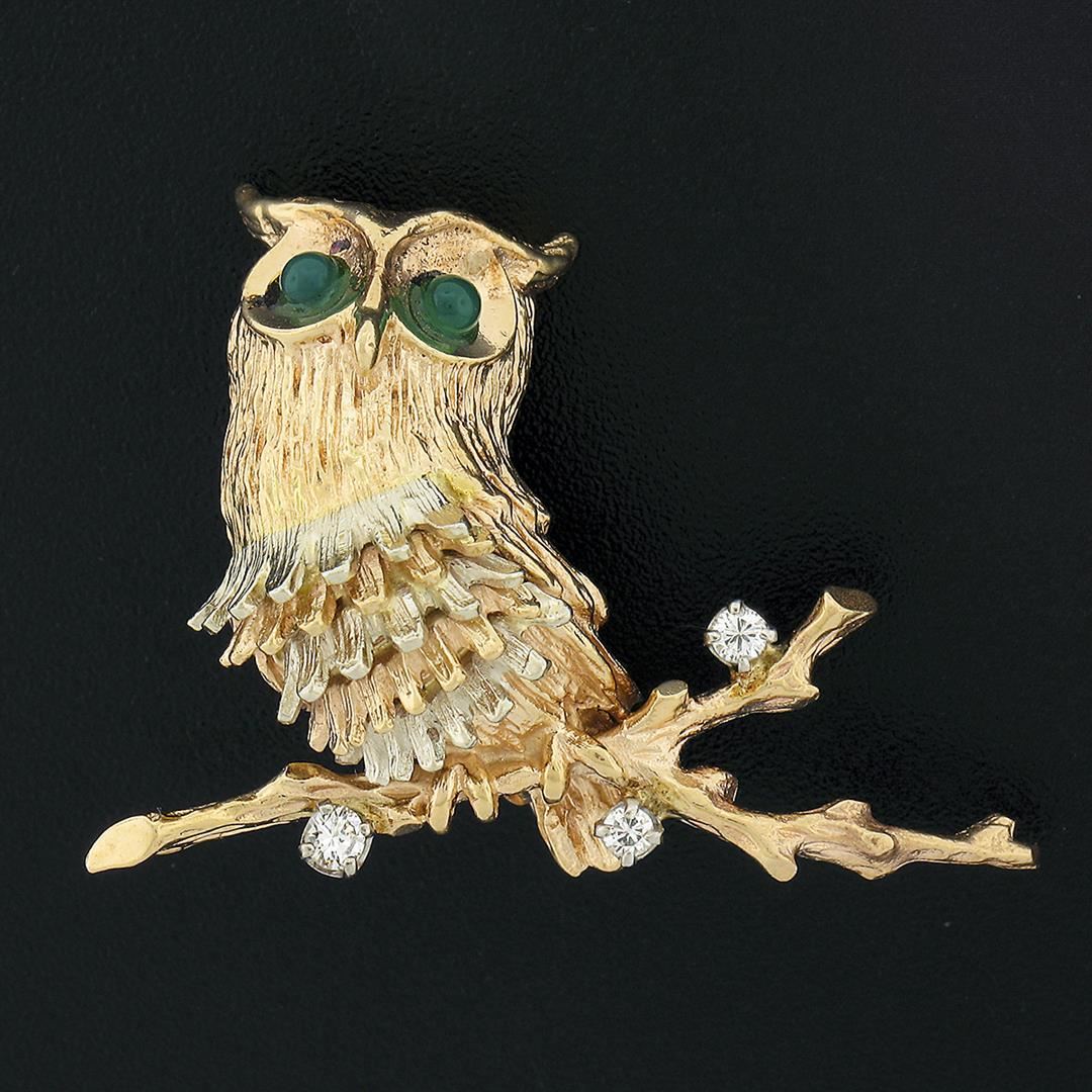 Vintage Detailed Textured 14K TT Gold Diamond & Chalcedony Owl on Branch Brooch
