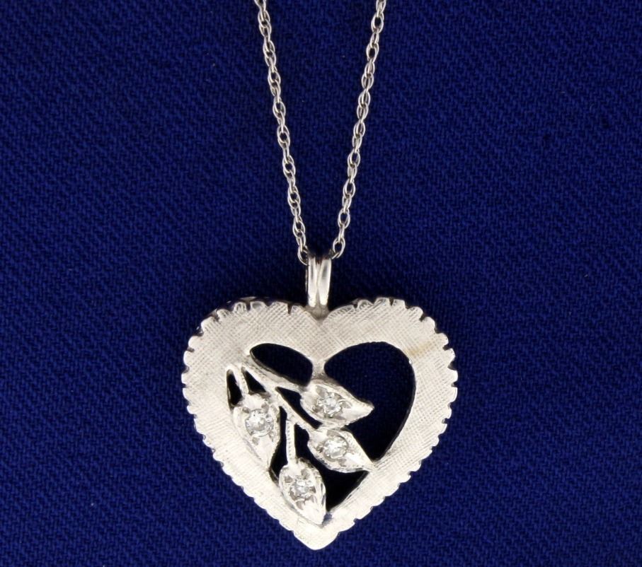 In 14k White Gold. Contains four high quality round brilliant diamonds, .1 ct TW, VS clarity/G color. Pendant is 3/4 inch long with bale. Comes with 14k white gold 18 inch chain. 3.7g