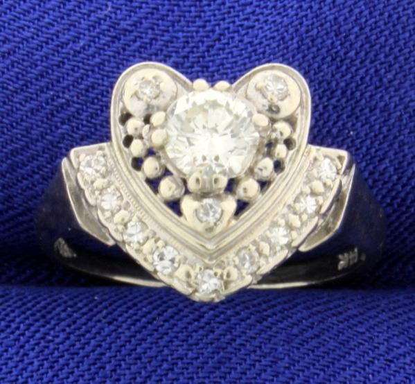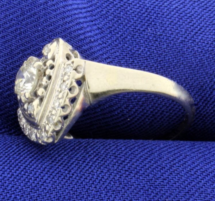 In 14K white gold. Contains a .45ct high quality round brilliant diamond that is VS clarity/I Color with lots of brilliance and sparkle. There are twelve .01ct diamonds surrounding the center stone that are also VS clarity/I color. Size 6 1/2 3.4g