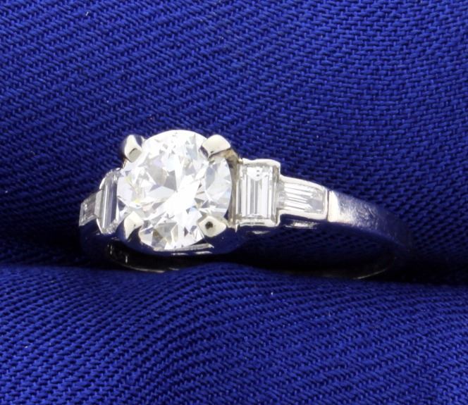 Center Diamond is Round Brilliant, 1.1 ct, VVS clarity, F/G color. Has 4 Baguette cut diamonds surrounding it, total weight of .26 ct. Size 6. 3.2g