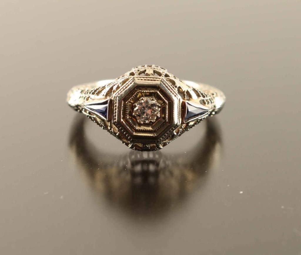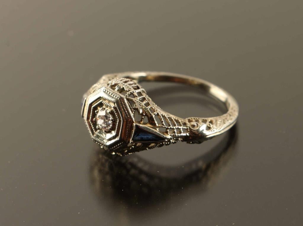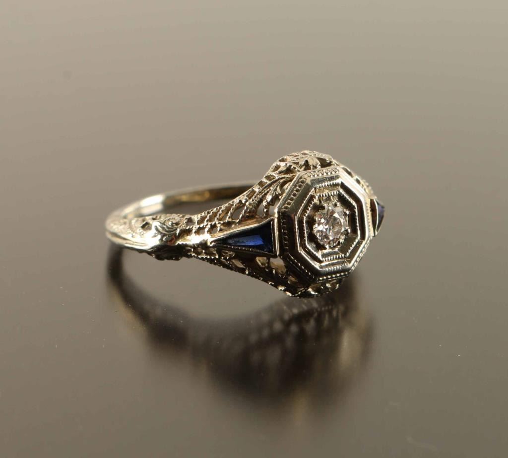 Center round diamond set in beautiful openwork design of 18K white gold with blue triangular topaz stones on each side. Size 5 1/4.