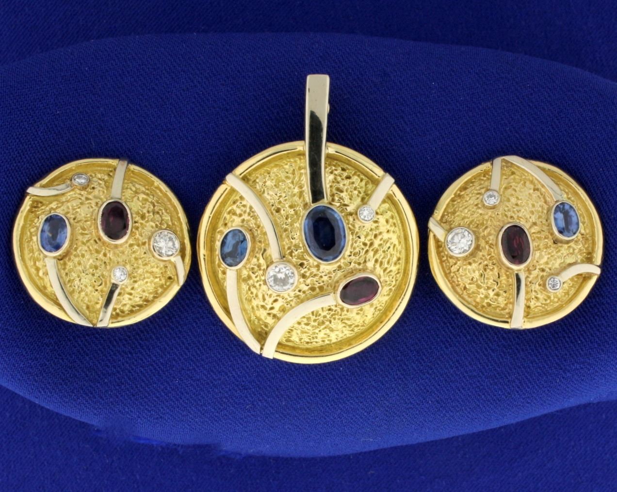 In 14k yellow and white gold. The pendant contains a .25ct and .05ct high quality diamond of VS clarity/F color as well as an 8mm and 5mm high quality natural oval shaped sapphire and a 6mm high quality ruby, all with excellent color and clarity. Pendant bale can open and close to easily add to chain, omega, or pearl strand. Each earring contains a high quality .2ct and two .03ct diamonds as well as a high quality 5.5mm natural sapphire and high quality 6mm natural ruby of equal quality to gems in pendant. Pendant is 1 5/8 inches long and earrings are 1 inch in diameter. Earrings have post backs with French clasp for safety. 35.2g.