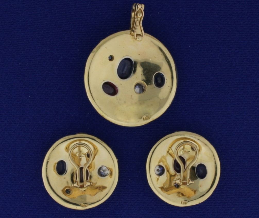 In 14k yellow and white gold. The pendant contains a .25ct and .05ct high quality diamond of VS clarity/F color as well as an 8mm and 5mm high quality natural oval shaped sapphire and a 6mm high quality ruby, all with excellent color and clarity. Pendant bale can open and close to easily add to chain, omega, or pearl strand. Each earring contains a high quality .2ct and two .03ct diamonds as well as a high quality 5.5mm natural sapphire and high quality 6mm natural ruby of equal quality to gems in pendant. Pendant is 1 5/8 inches long and earrings are 1 inch in diameter. Earrings have post backs with French clasp for safety. 35.2g.