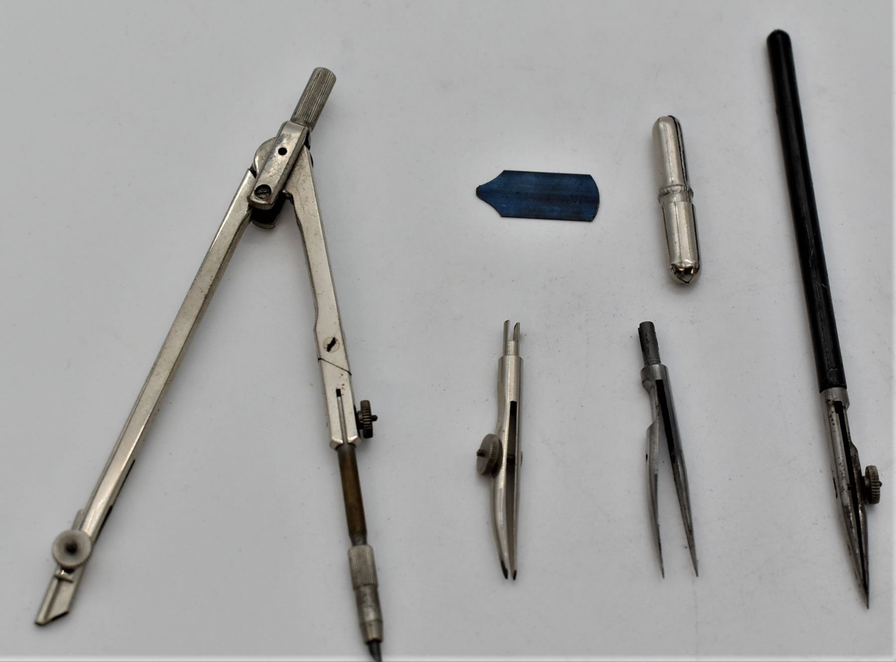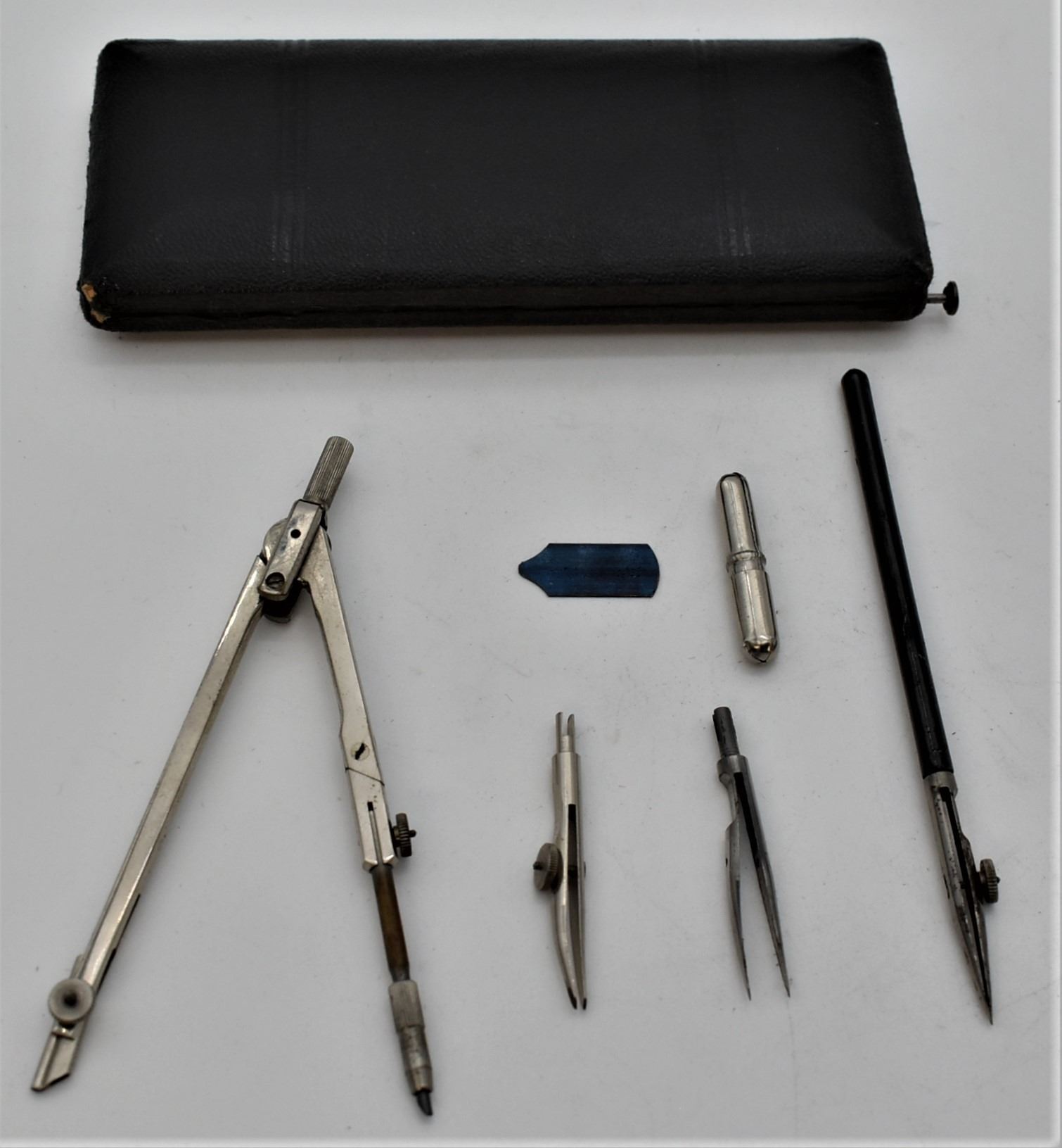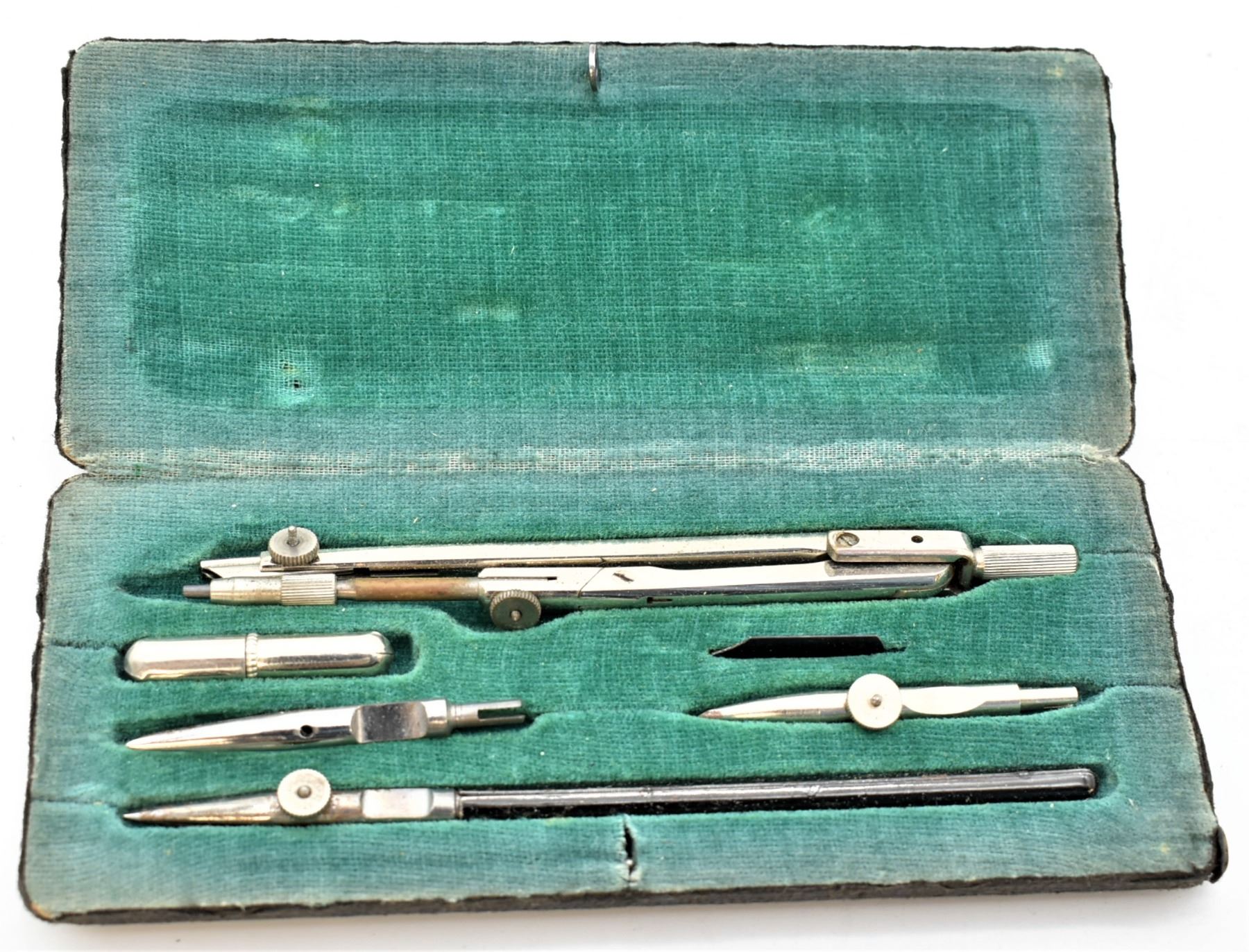 Vintage Eugene Dietzgen WWII U.S. Navy Drafting Navigator's Drafting Tools in Original Navigator's Case, 6 piece set, comes in original green velvet lined storage box, box measures 5.75''L x 2.5''W, compass is marked Dietzgen Germany, the bottom of the case is embossed ''Germany'', ''The navigators case is the older style that uses a push/pull on the right side as the locking mechanism.'' FYI: ''Around 1880, Eugene Dietzgen emigrated from Germany and became a sales distributor for Keuffel & Esser in New York. In 1885, he began to sell mathematical instruments on his own in Chicago. In 1893, his firm started manufacturing instruments under the name Eugene Dietzgen Company.''The navigators case is the older style that uses a push/pull on the right side as the locking mechanism. The case has NAVIGATORS CASE U.S. NAVY printed in gold lettering on top and Eugene Dietzgen Co. on the bottom. The bottom also has GERMANY debossed on the top left corner.The outside of the case is intact but shows wear & age. The hinged portion shows wear but still functional. The inside of the case is lined with green velvet,