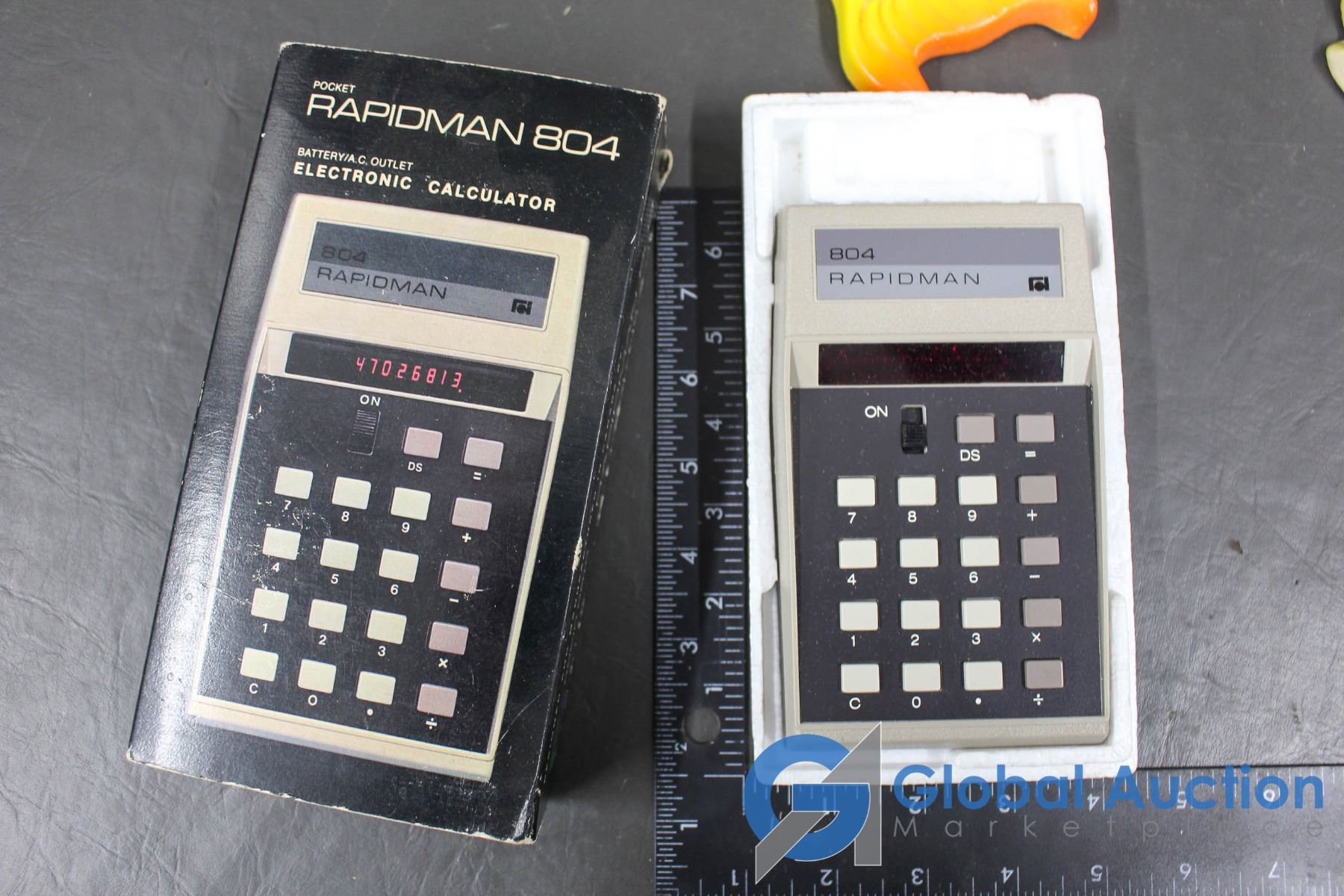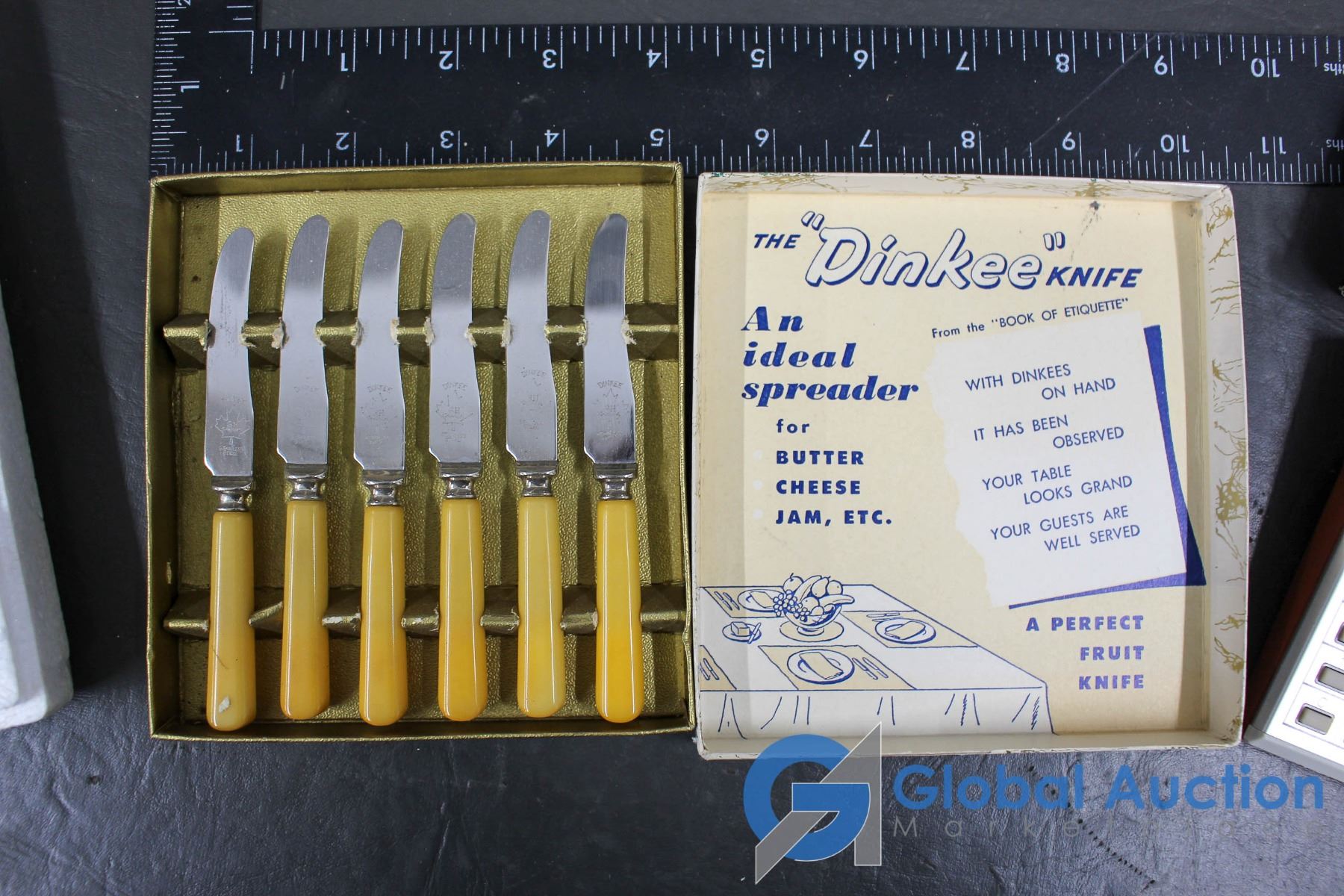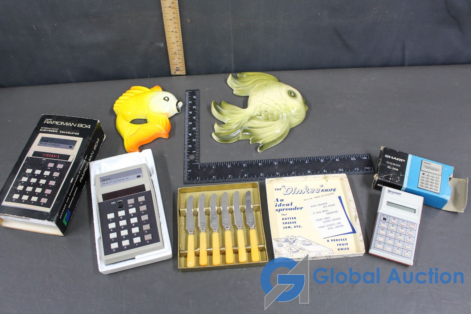 Vintage Dinkee Small Knives, 2 Chalkware Fish, & 2 Vintage Calculators