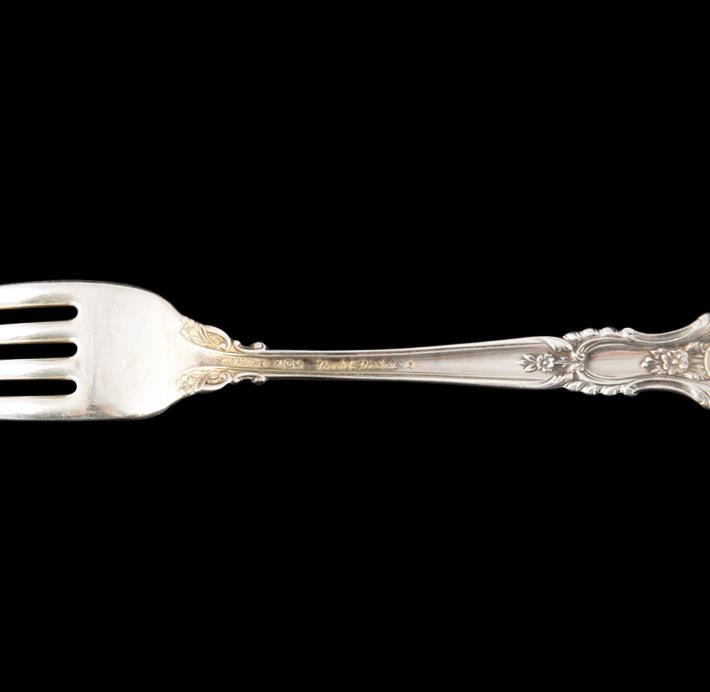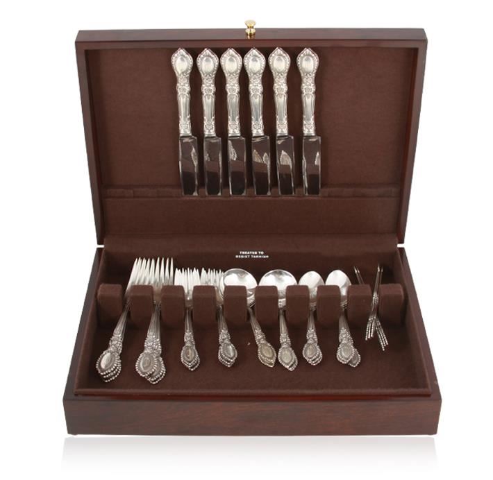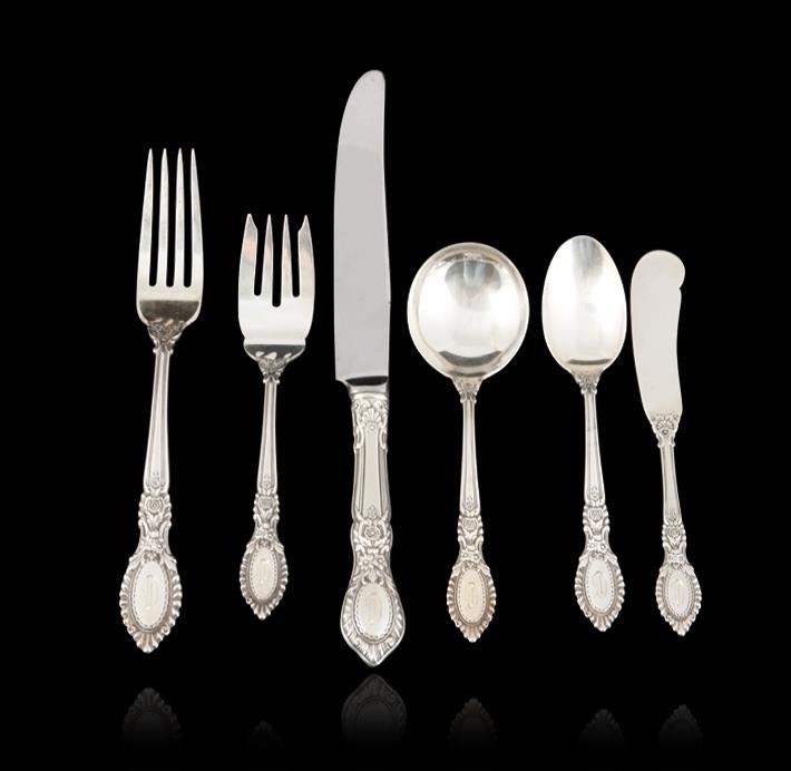This gorgeous sterling silver service for (6) includes the following pieces: (6) 7.75" dinner forks, (6) 6.25" salad forks, (6) 6.00" soup spoons, (6) 6.00" teaspoons, (6) 9.75" dinner knives (stainless blades), (6) 6.00" solid sterling butter spreaders. Comes in a new mahogany chest. Monogramed in period script with an Old English "C". By Reed & Barton in the Guildhall Pattern Circa 1941.