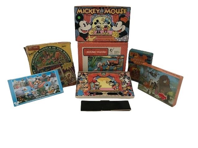 A collection of 7 vintage Disney puzzles. Walt Disney Character picture puzzle in the round (100 pieces), The Ugly Duckling collectible jigsaw puzzle (over 900 pieces), Mickey Mouse puppetforms, Flying Donkey Jigsaw puzzle (over 300 pieces), The Jungle Book puzzle (100 pieces - still wrapped in plastic), Toyland Auto Ride Wash Day Hayloft puzzle (over 400 pieces), and a Disney Parks panoramic puzzle (500 pieces).
