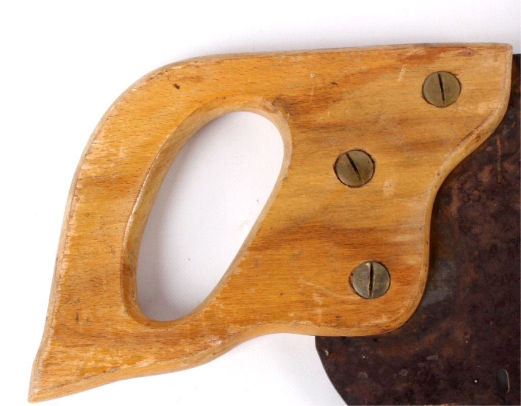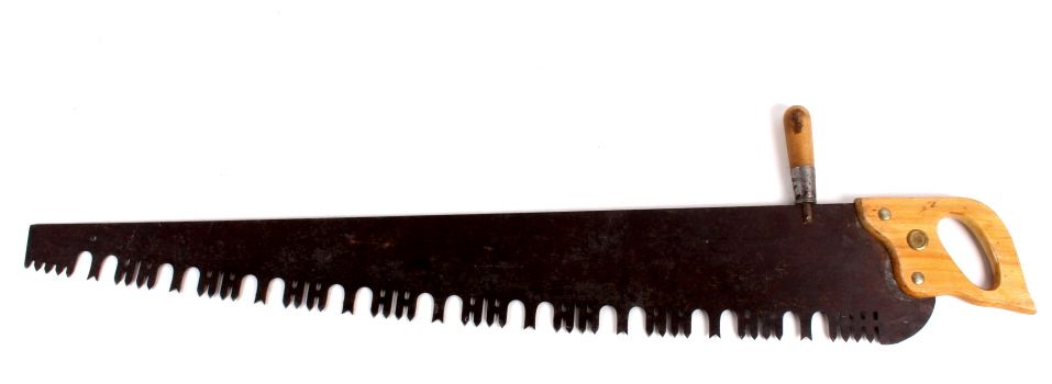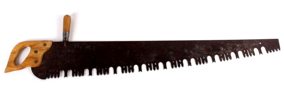 This is a Disston logging saw in great condition and includes all teeth. The saw includes a buddy handle that can be swapped to either end of the blade. Measures 46.5"x11.5".