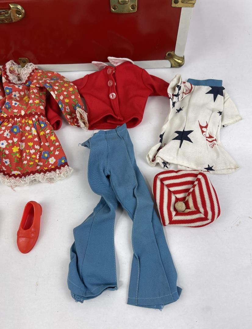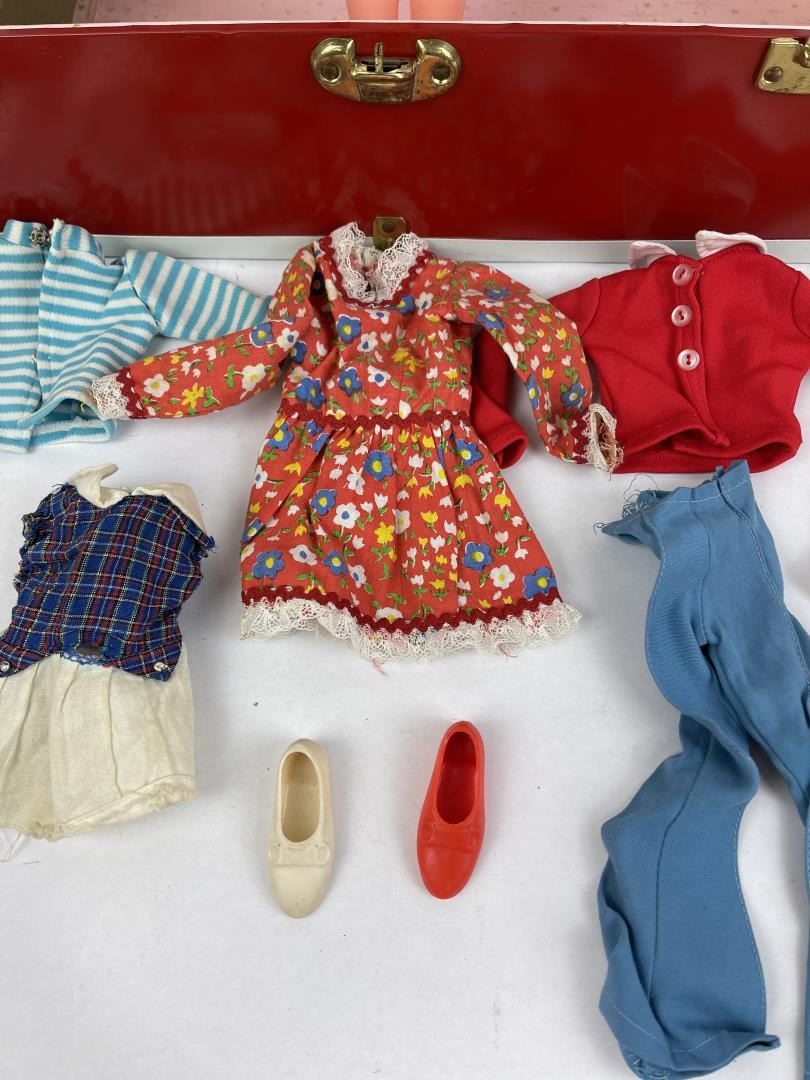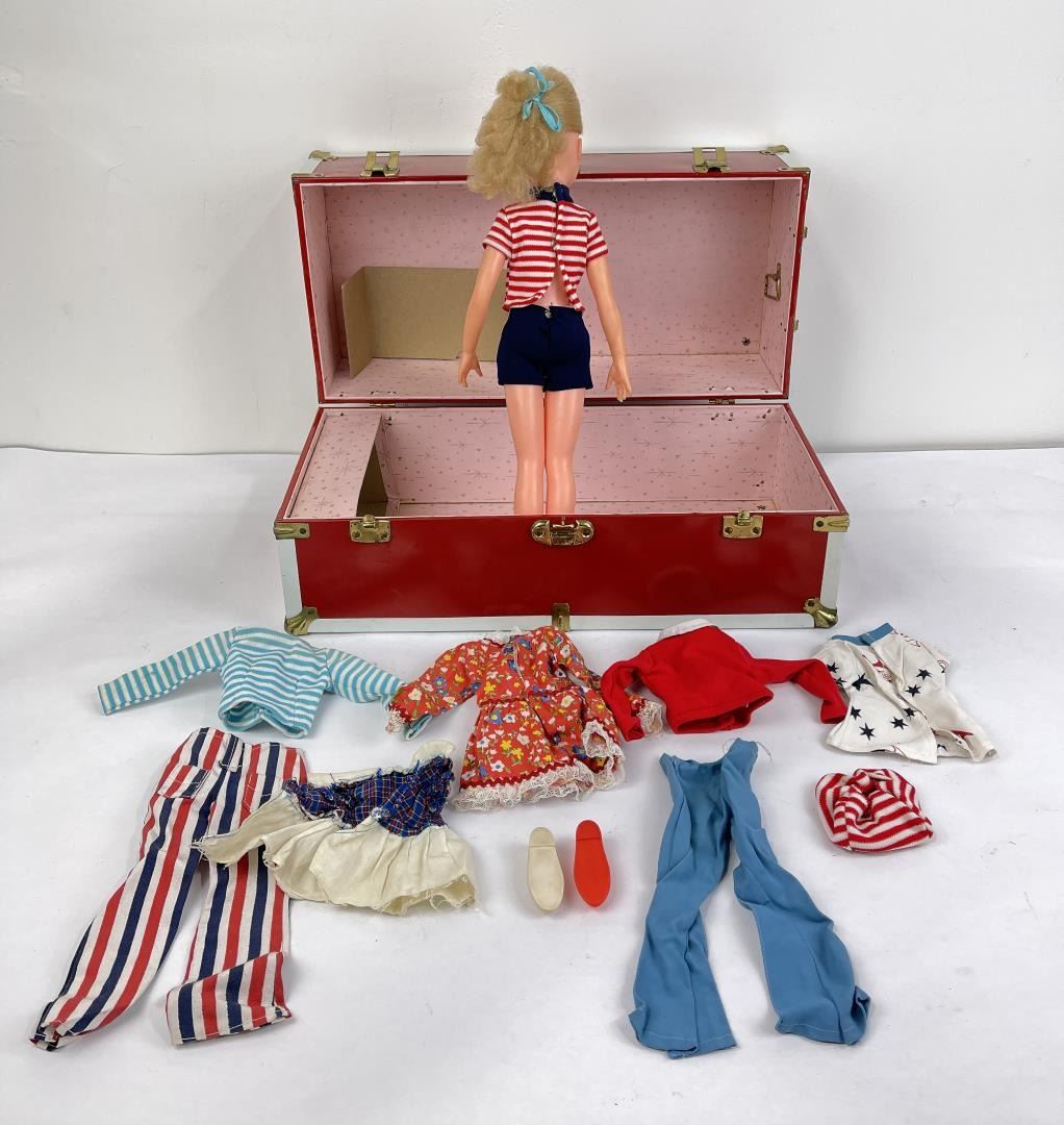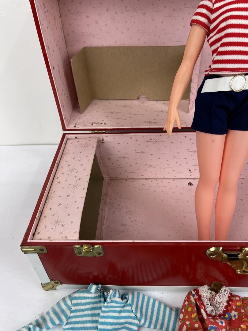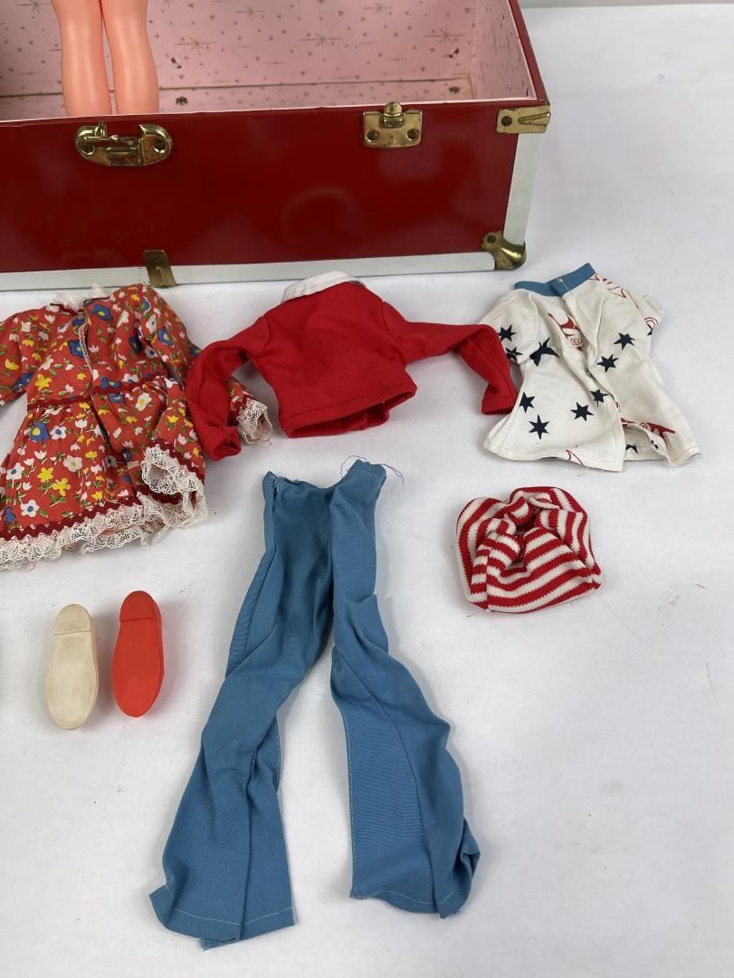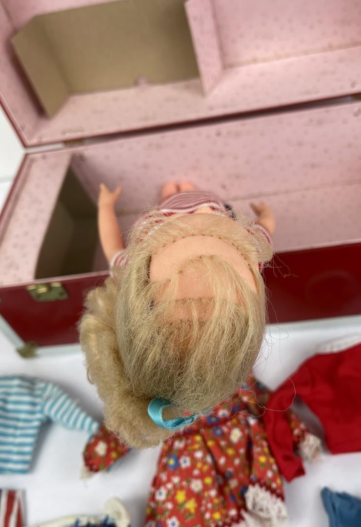 Nice doll with clothes in red steamer trunk. Some hair loss.