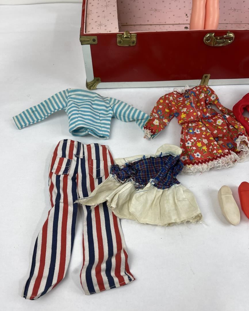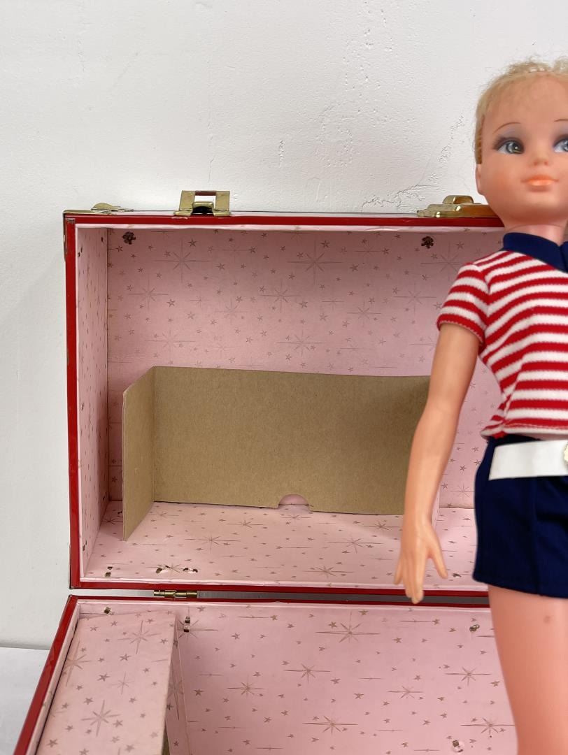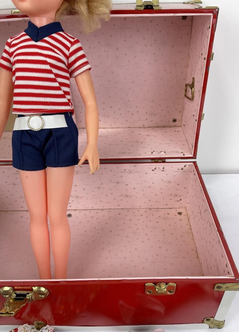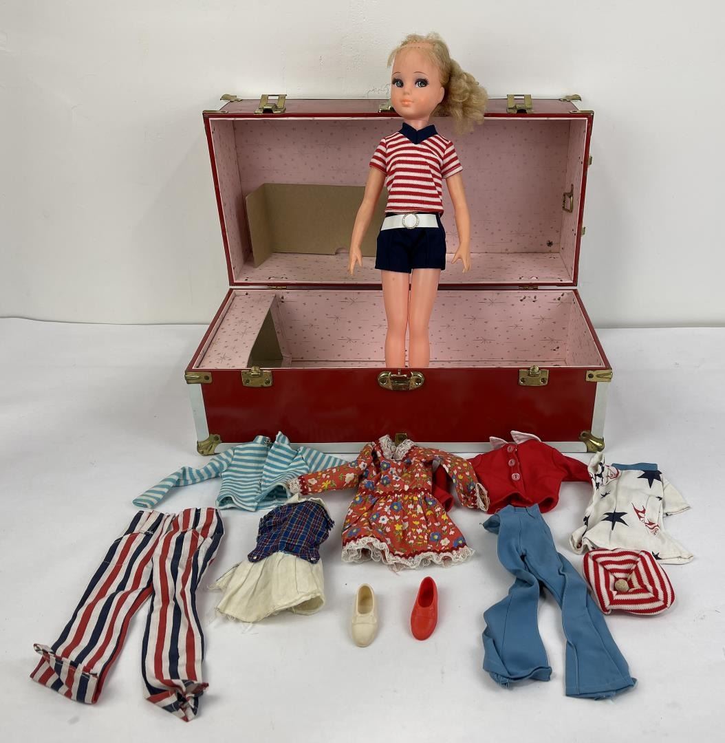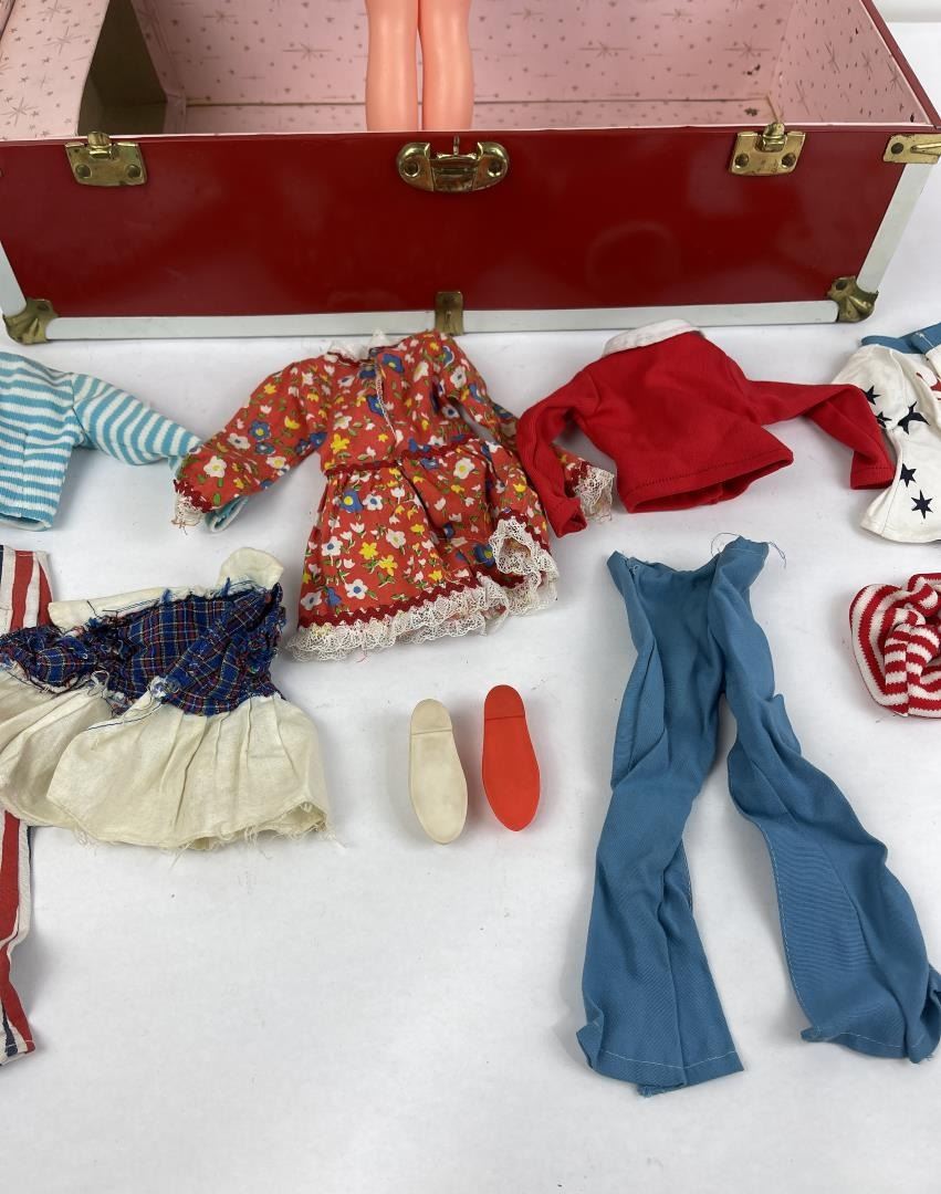 Nice doll with clothes in red steamer trunk. Some hair loss.