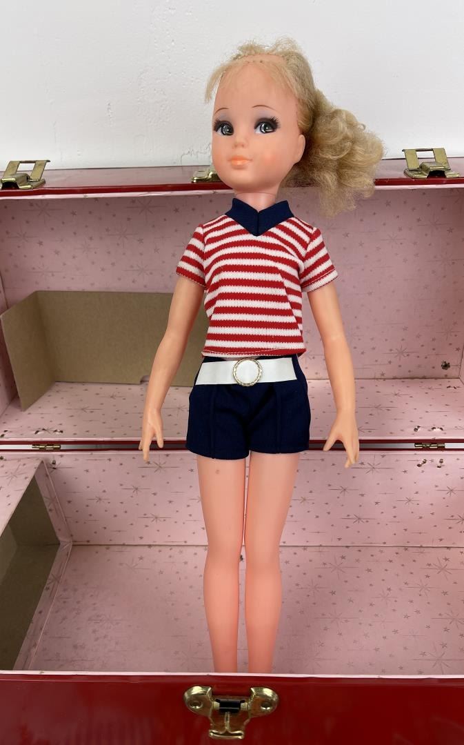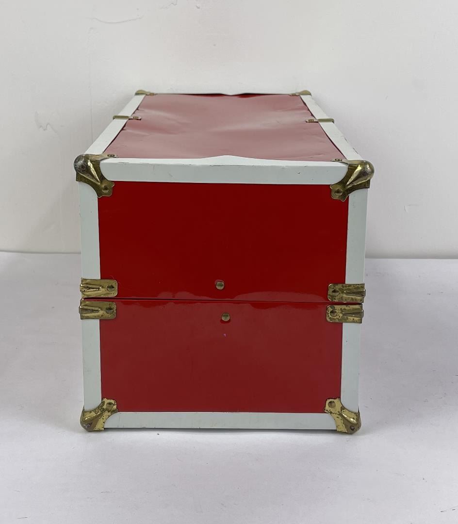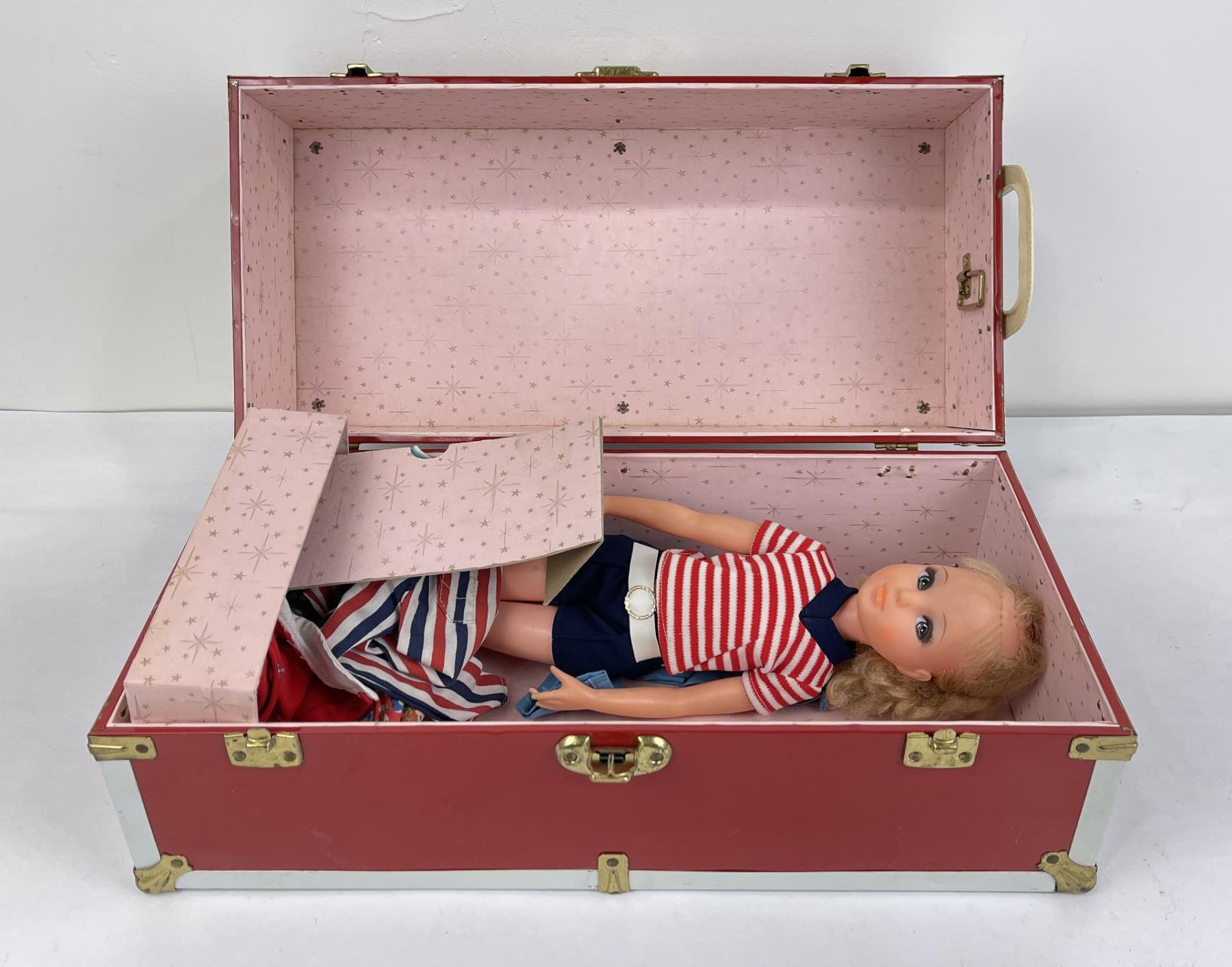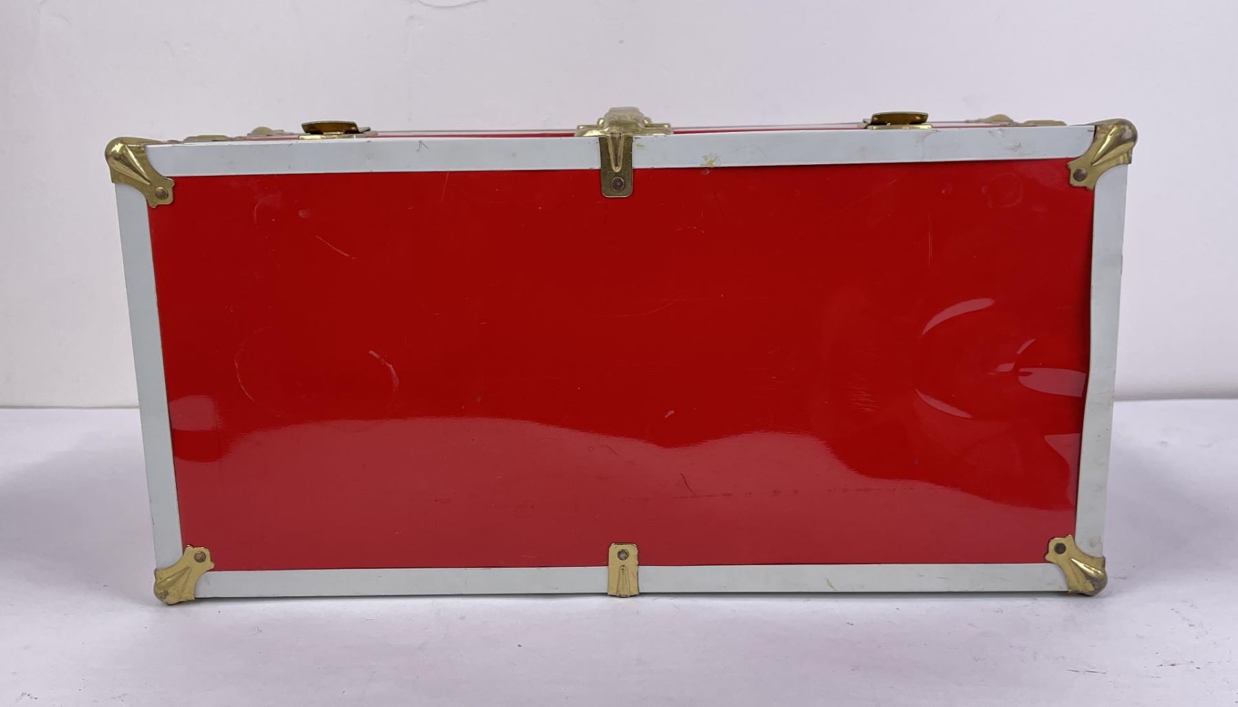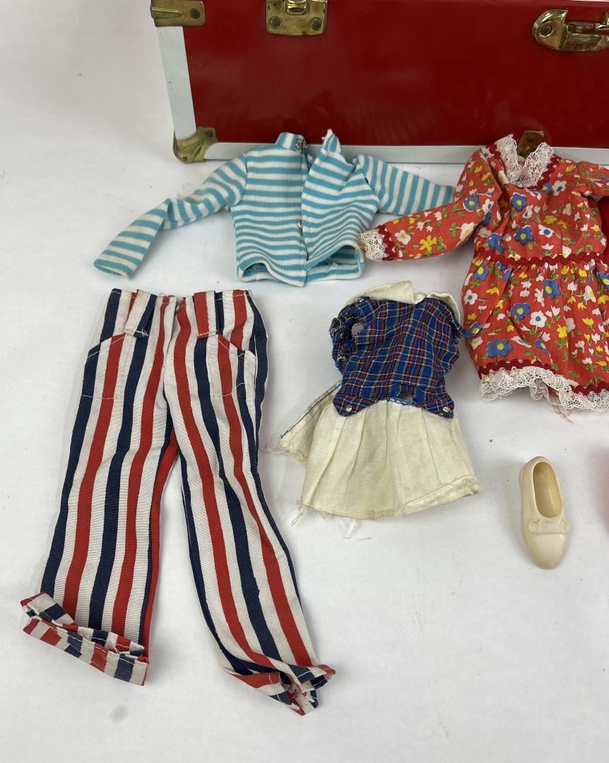 Nice doll with clothes in red steamer trunk. Some hair loss.