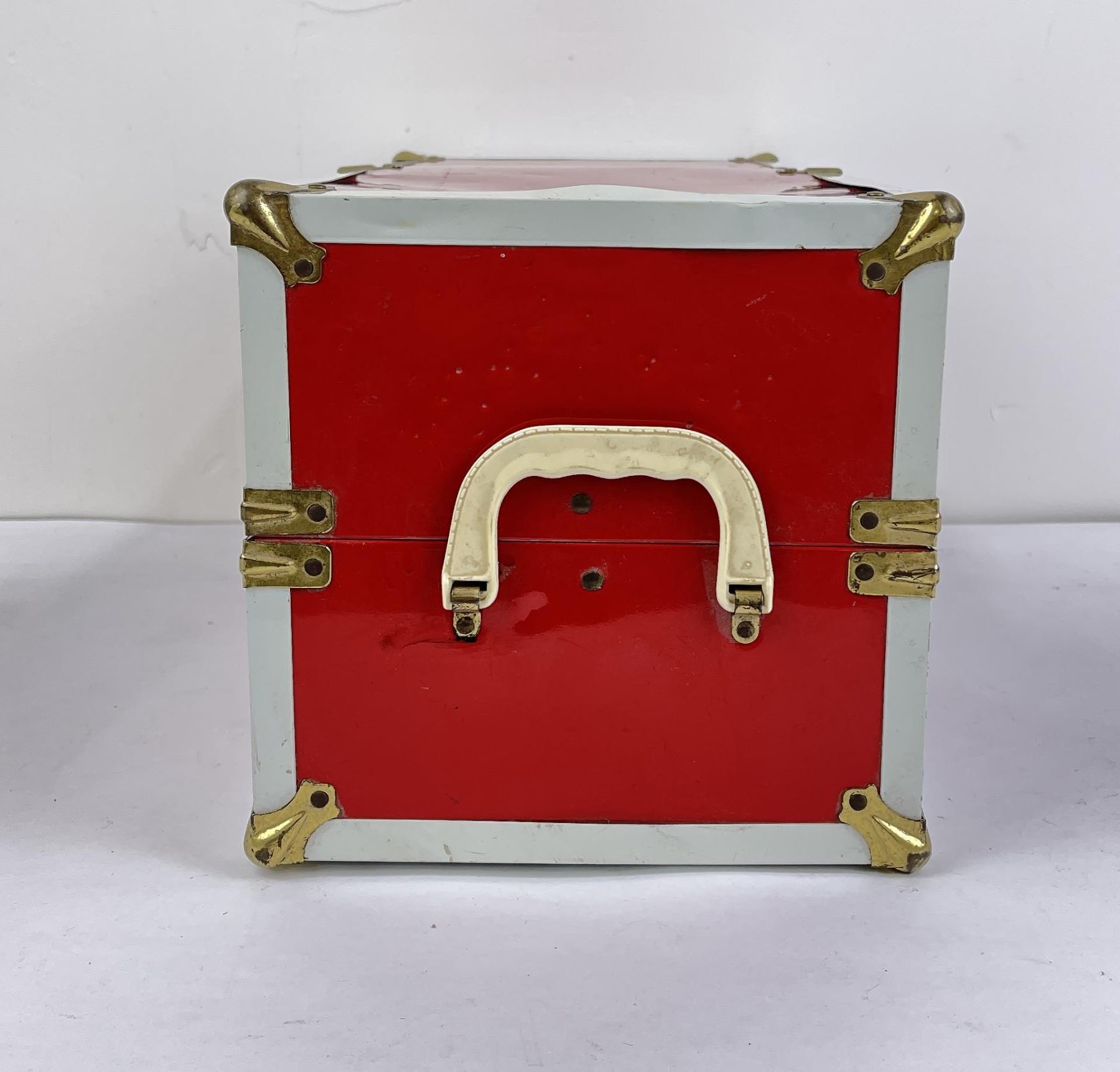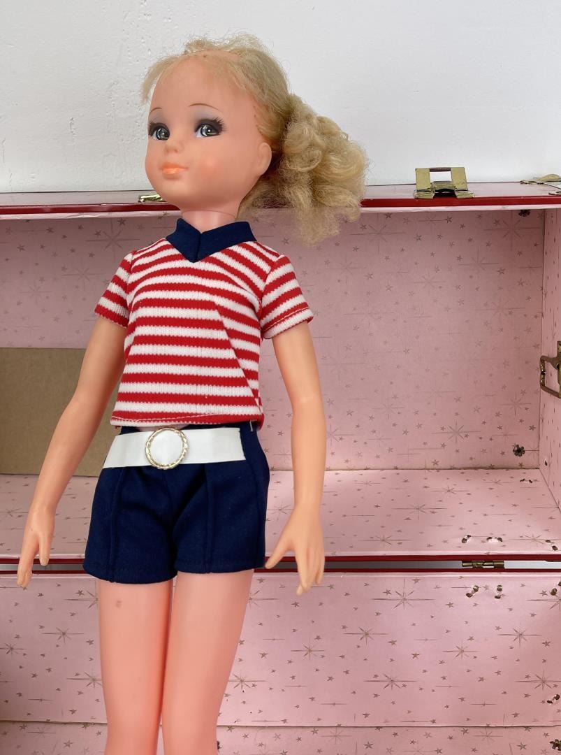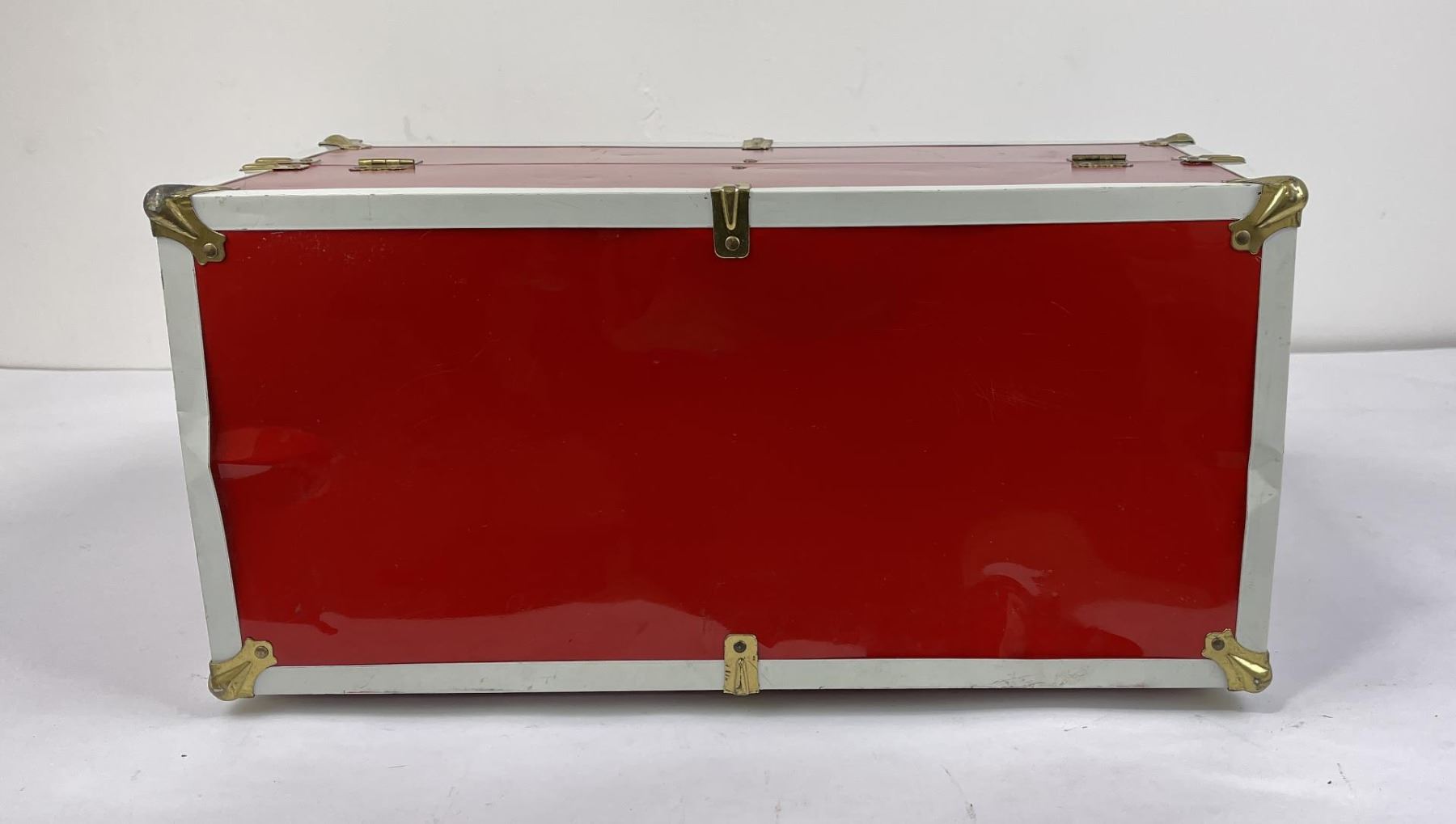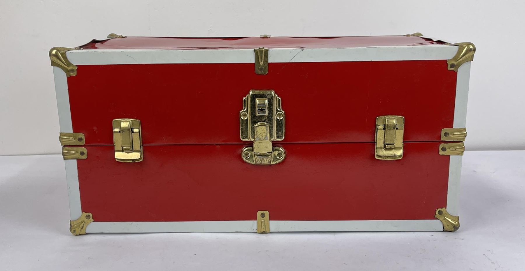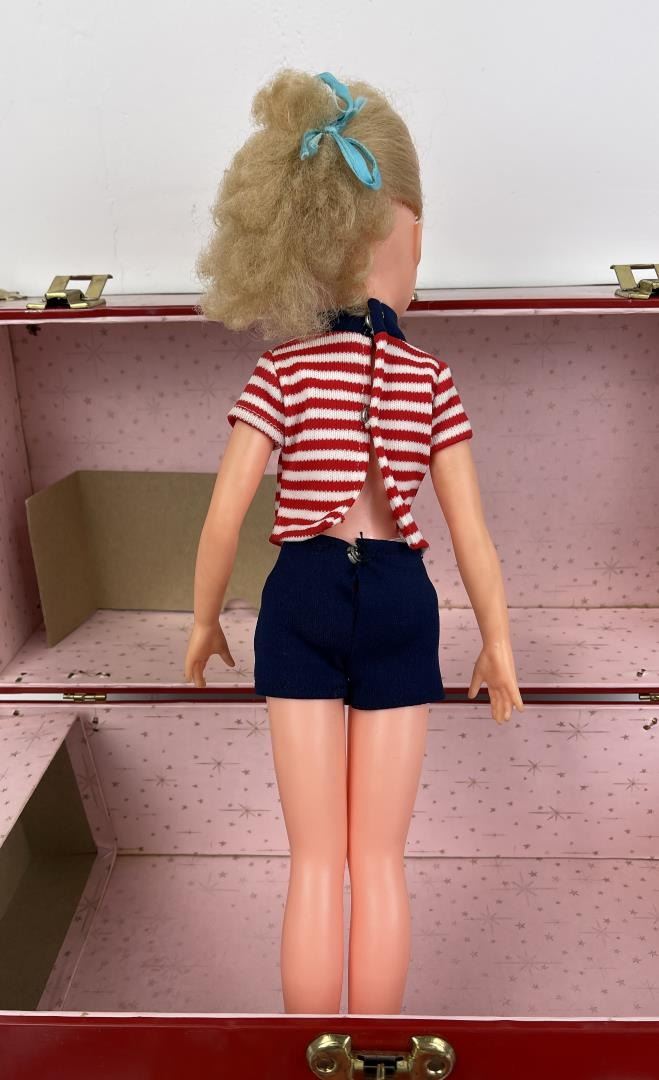 Nice doll with clothes in red steamer trunk. Some hair loss.