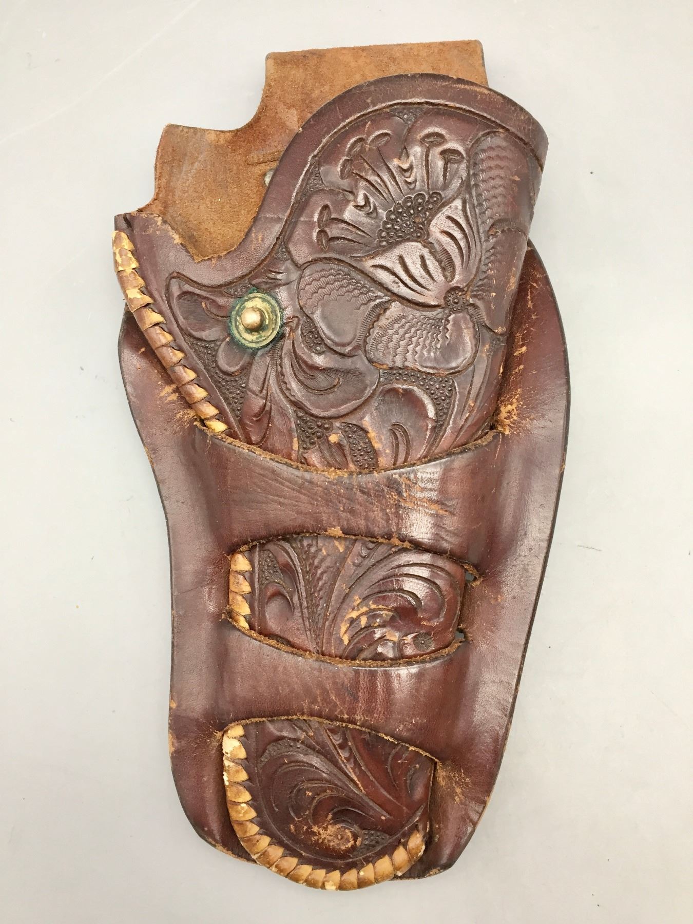 Description: Offered for sale in this lot is a very nice, vintage, double loop holster featuring hand tooled designs, all created by Herman H. Heiser. Maker: HH Heiser, Denver, CO. Herman H. Heiser. Approx. Age: Early 1900s. Size: 5-1/2”w x 10-1/4” long. Condition: Good for its age, normal wear expected. Please look closely at the pictures - they are an important part of our description. Shipping: There will be a $5 handling / packaging fee for shipping this lot. The actual cost of postage will be added on top of that.