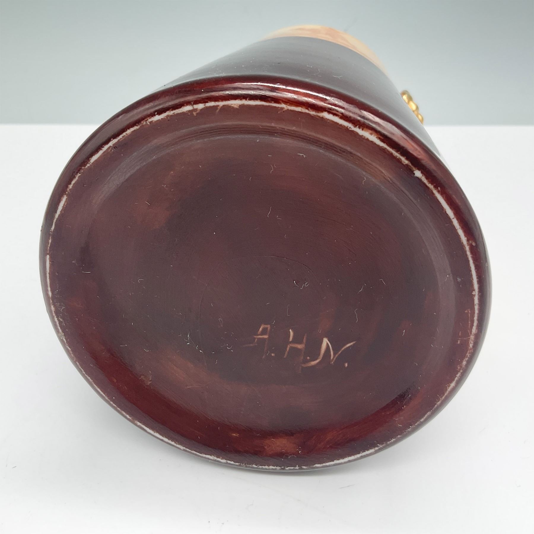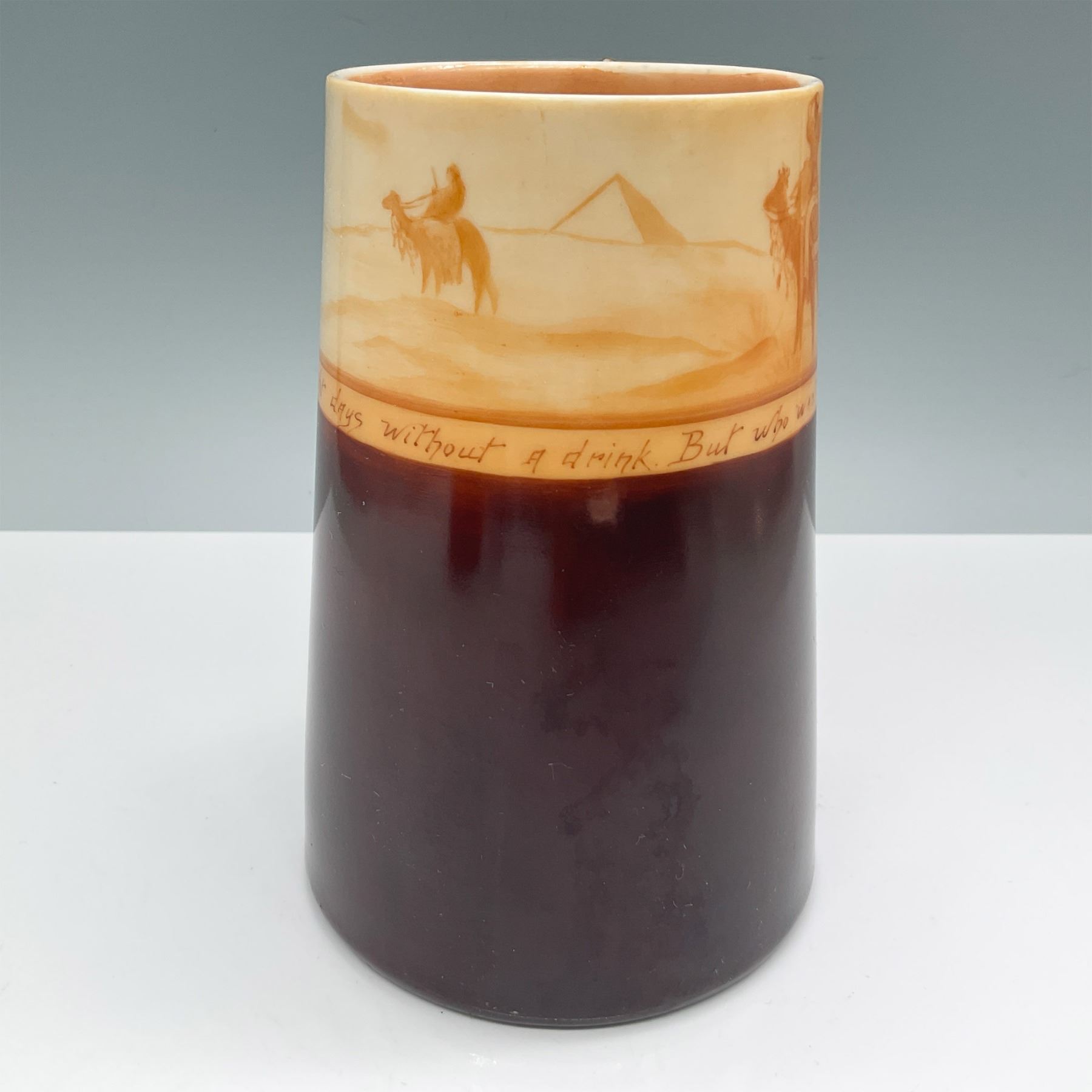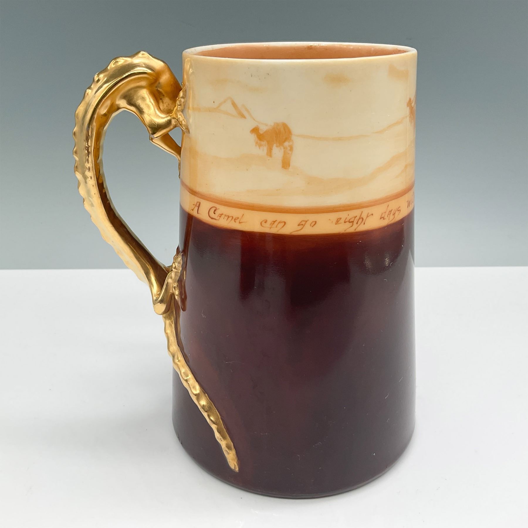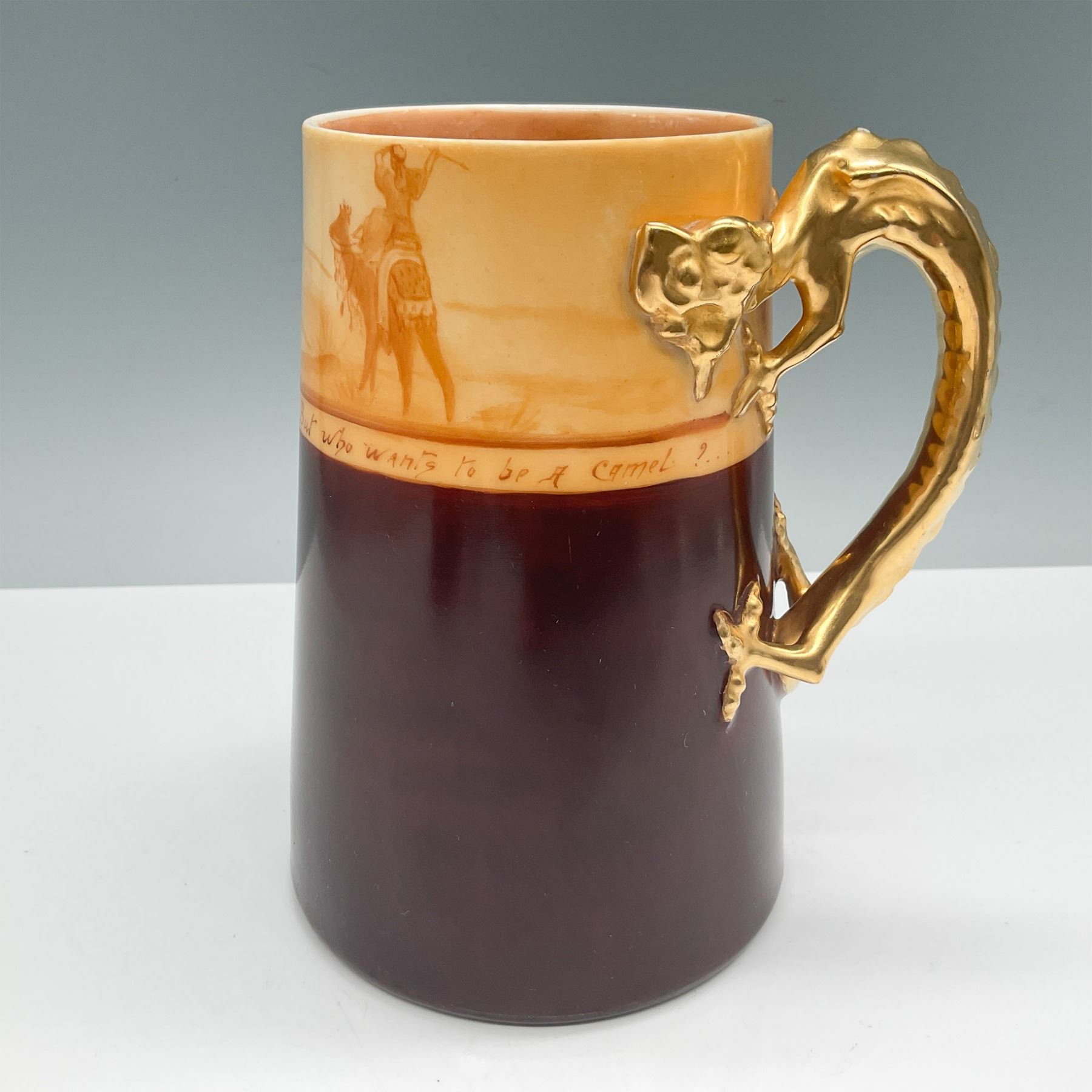A vintage ceramic mug featuring a unique dragon-shaped gold handle, adorned with blackberry-themed artwork. The hand-painted design depicts desert camels and pyramids in warm tones, with an inscription that reads, "A Camel can go eight days without a drink. But who wants to be a camel?" Signed at the base with the initials A.H.W. Measures 5.5"H. A charming collectible piece showcasing detailed craftsmanship and whimsical design.