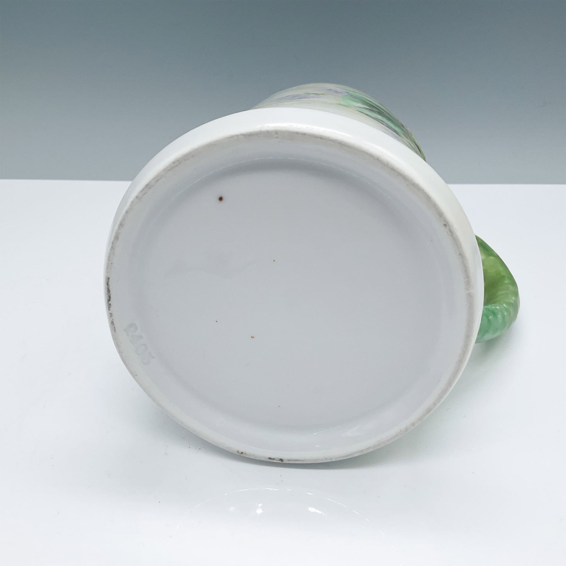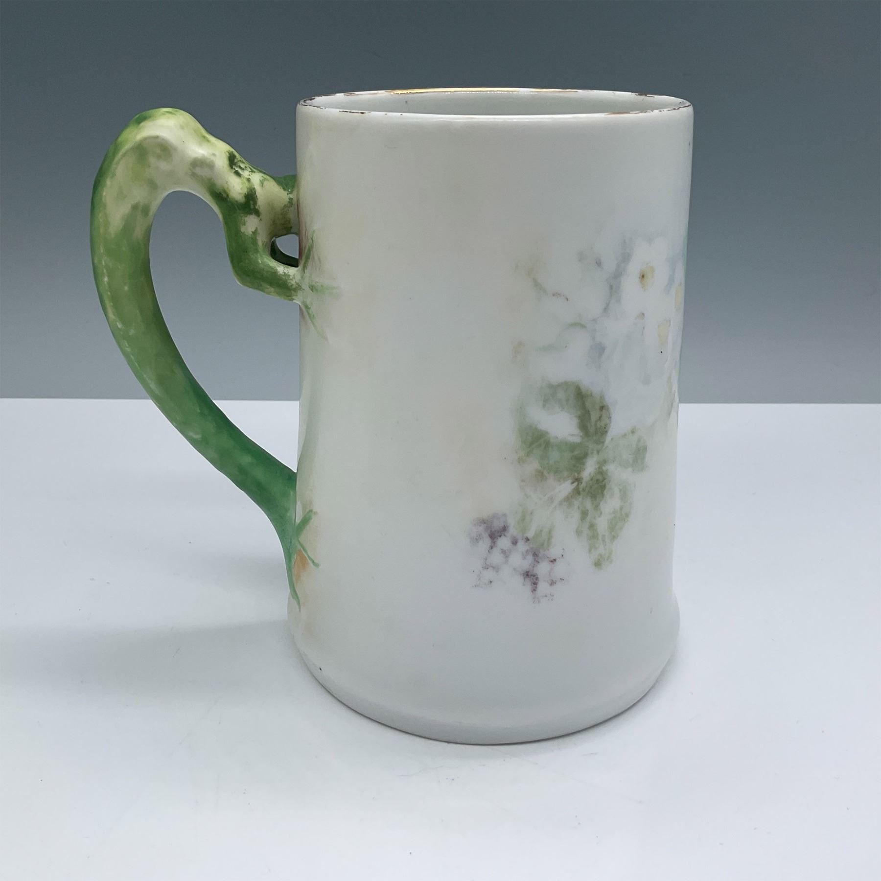 A vintage hand-painted china mug featuring a distinctive dragon-shaped handle and a charming blackberry and foliage motif. The design showcases soft green and purple hues with intricate detailing, making it a unique and collectible piece. Measuring 5.5"H, this mug is perfect for collectors or those who appreciate whimsical and artistic craftsmanship.