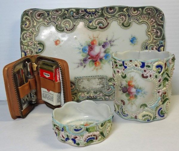 Cup was broken and glued back together,. Travel Razor set is in excellent condition.