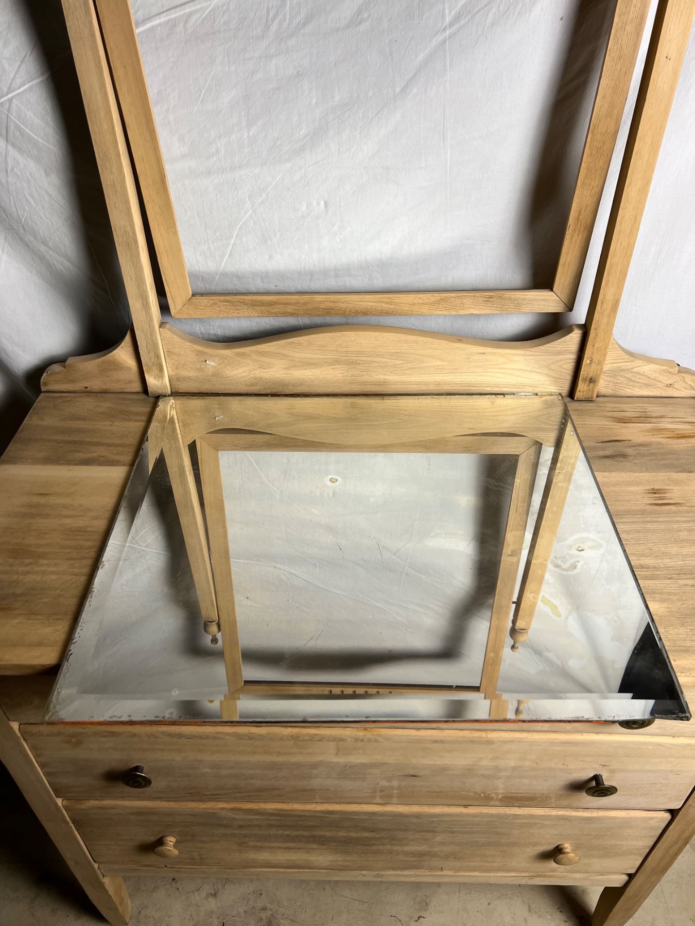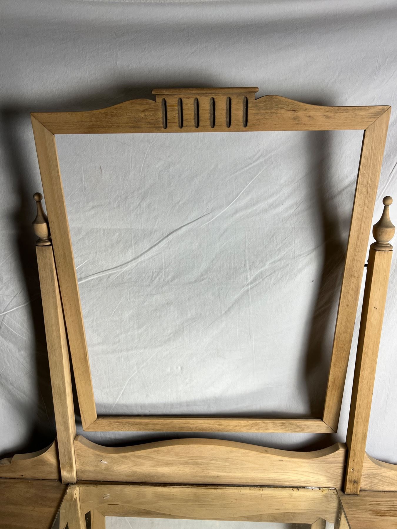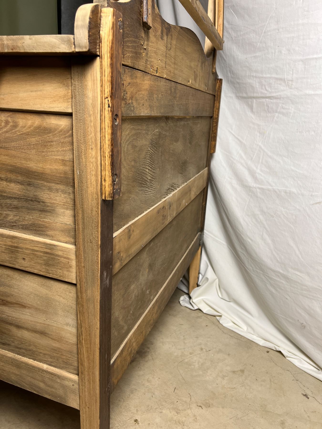 Mirror is not attached but is measured to be correct fit. Oxidation to mirror. Some loss of colour to wood and metal repair patch on rear leg. Measures 68" tall by 38" wide and 19" deep.