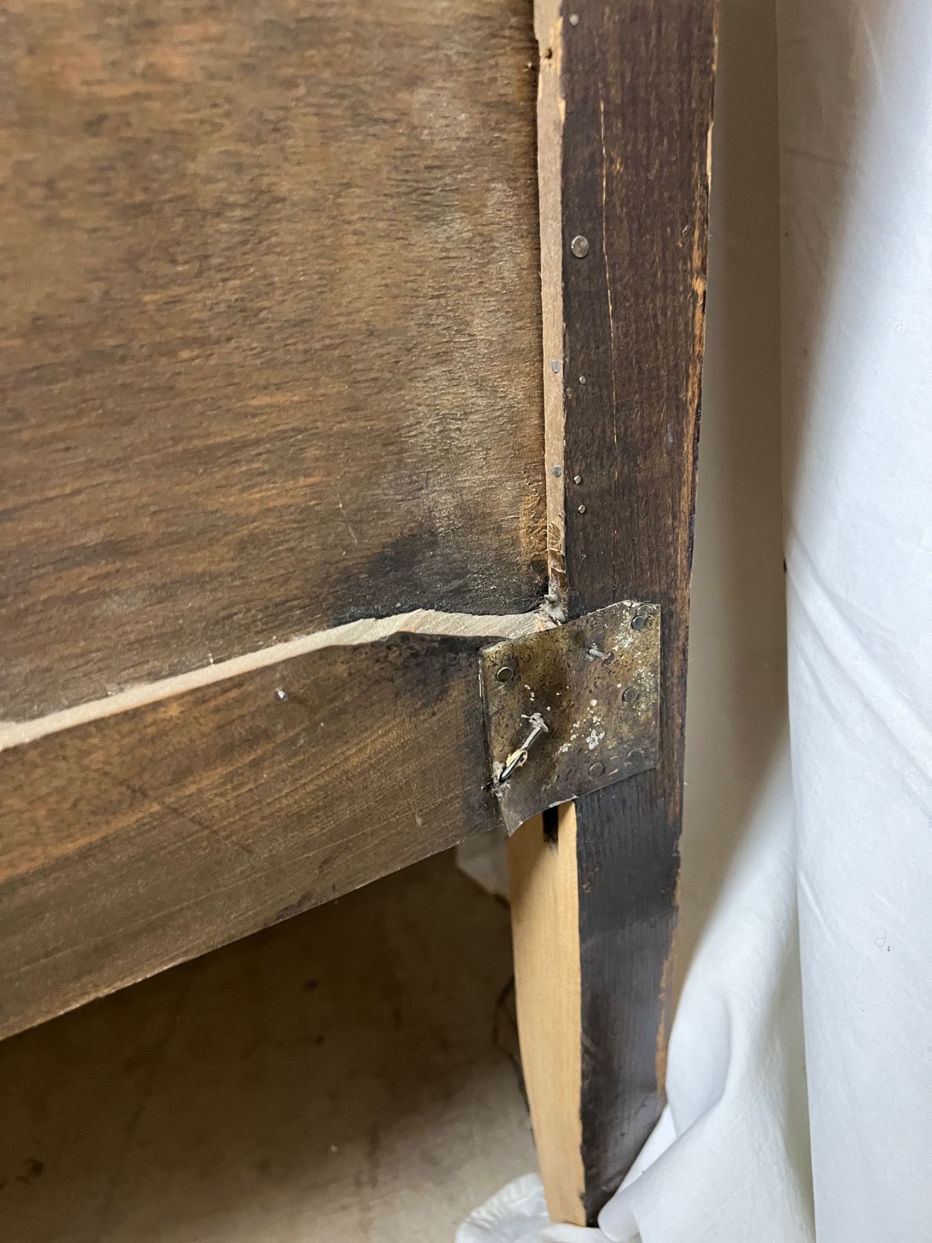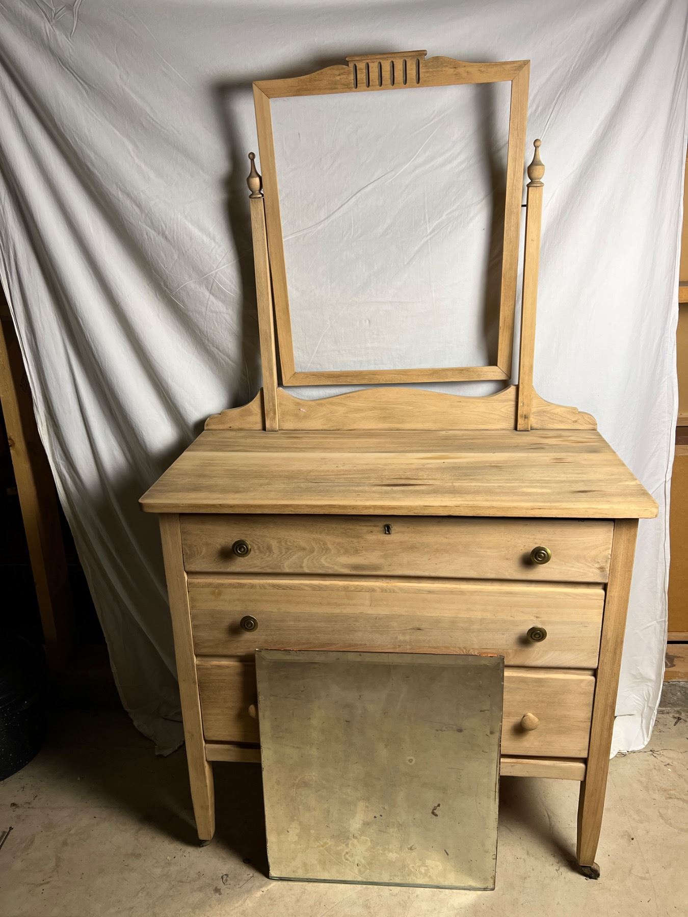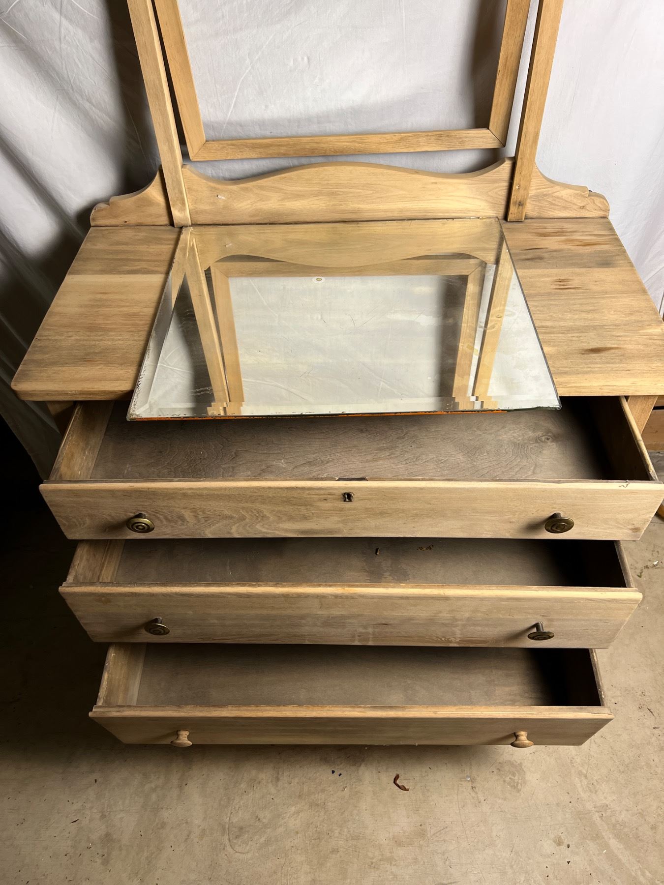 Mirror is not attached but is measured to be correct fit. Oxidation to mirror. Some loss of colour to wood and metal repair patch on rear leg. Measures 68" tall by 38" wide and 19" deep.