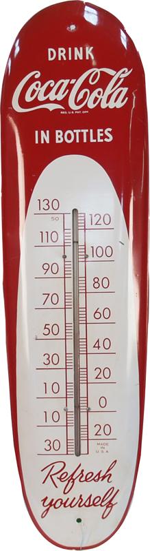 Vintage Drink Coca Cola In Bottles Tin Thermometer Sign c1950's "Refresh Yourself" - 8" x 30"