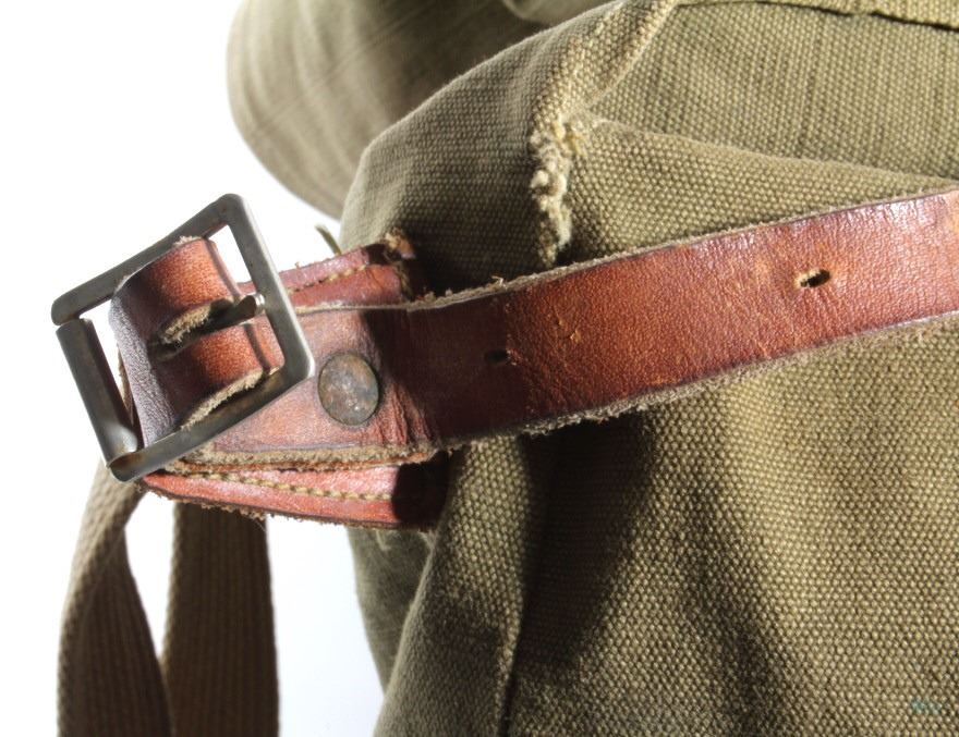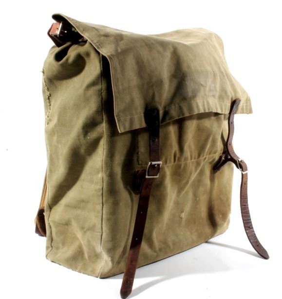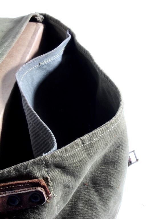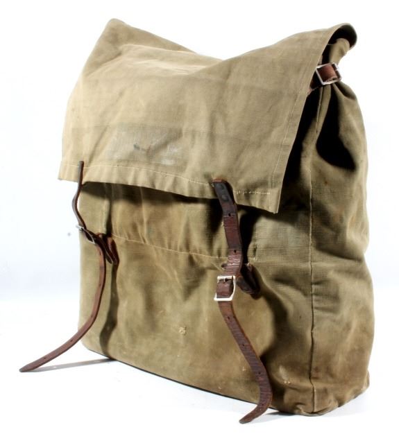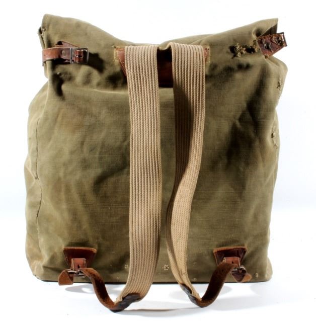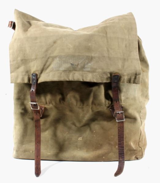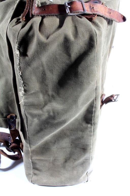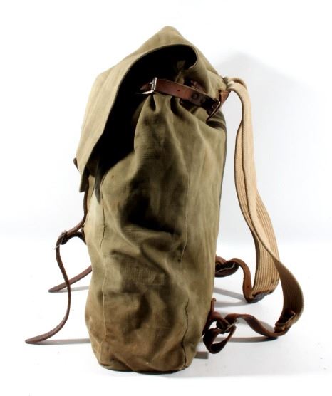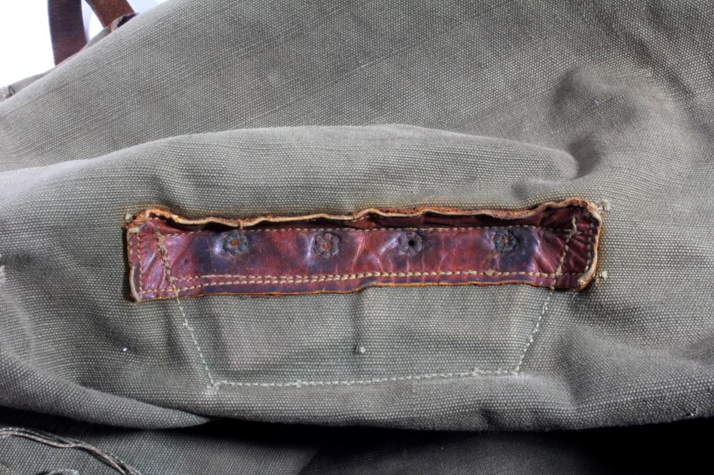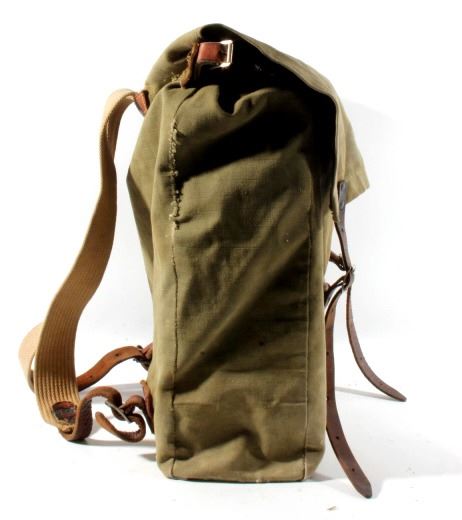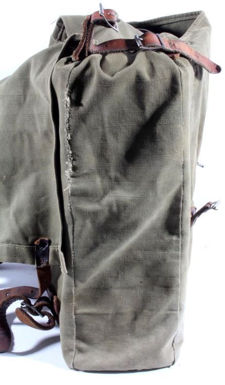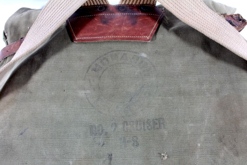 This is a vintage Duluth Pack No. 2 Cruiser. The pack is marked "No. 2 Cruiser and is believed to be made by Duluth Pack in Minnesota. According to Wikipedia, the No. 2 Cruiser Pack was developed in the 1940's and 1950's for people needing a durable pack they could take into the woods with them that would be narrow enough as not to snag on branches. The No. 2 Cruiser pack is more narrow than the larger canoe packs. The pack features a box shape, webbed cotton shoulder straps, a slash pocket on the inside, and is secured with adjustable leather straps with nickel roller buckles. The pack is in good, but well-used condition. It measures about 19" t x 16.75" w and is 5.5" deep.