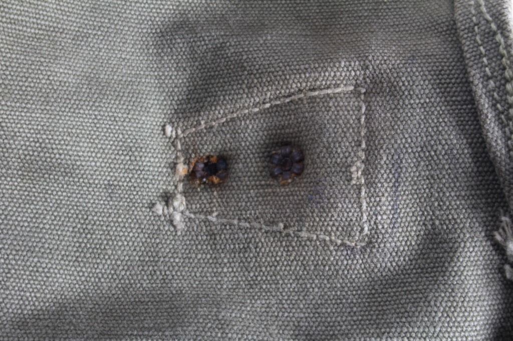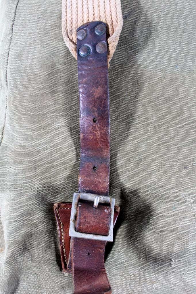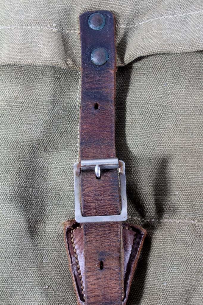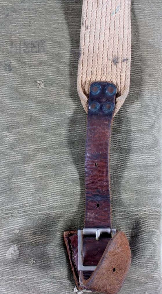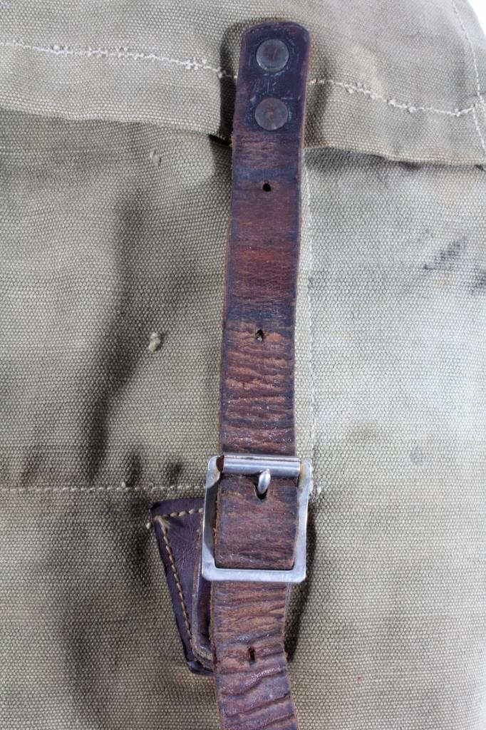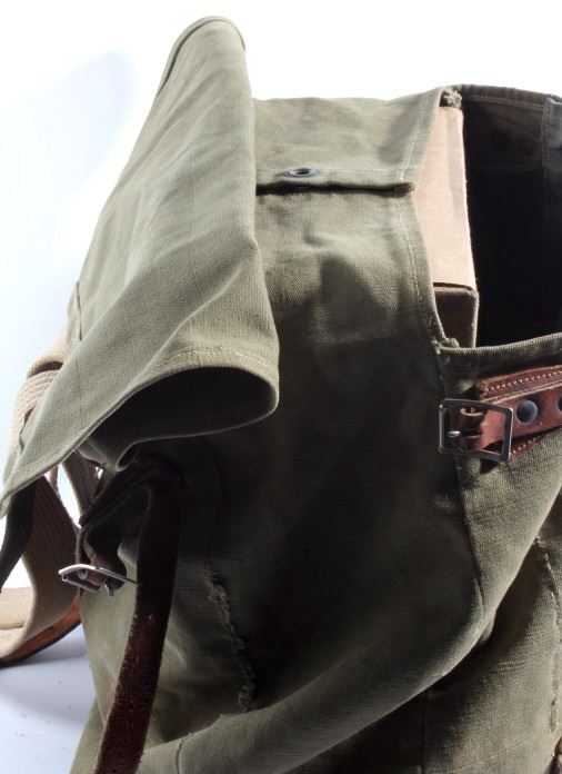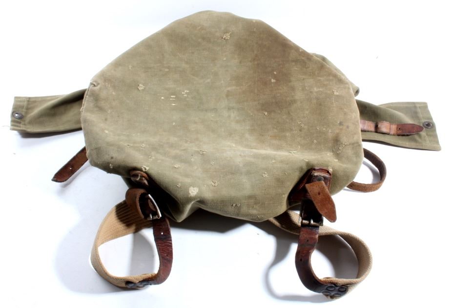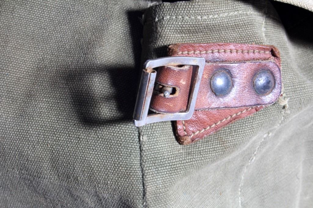 This is a vintage Duluth Pack No. 2 Cruiser. The pack is marked "No. 2 Cruiser and is believed to be made by Duluth Pack in Minnesota. According to Wikipedia, the No. 2 Cruiser Pack was developed in the 1940's and 1950's for people needing a durable pack they could take into the woods with them that would be narrow enough as not to snag on branches. The No. 2 Cruiser pack is more narrow than the larger canoe packs. The pack features a box shape, webbed cotton shoulder straps, a slash pocket on the inside, and is secured with adjustable leather straps with nickel roller buckles. The pack is in good, but well-used condition. It measures about 19" t x 16.75" w and is 5.5" deep.
