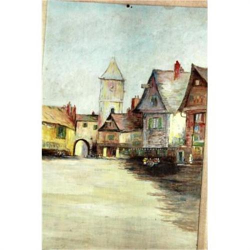 </font></strong>Vintage oil painting of an old European village scene. It is signed at the bottom C.H.J. <p> I assume that it is somewhere in the Netherlands due to the style of the roof tops. Plus I got this at a sale that had several painting of Dutch origin. Please see the other paintings I have listed. <p> <p> The measurement of the painting alone is 10 1/4" x 15 1/2". The ornate wood frame with fabric inset is 18 1/2" x 13" <p> It is a pretty painting but it does have some problems. There is a nail hole up the top. The whole surface is a bit dirty. There is an smudge of grime at the top. Then there is a blip next to the tower. It look like blob of uneven paint that crackle a little. I have arrows pointing the these flaws. The nails holes will be hidden with a more appropriate frame. The blip or blob does not really show up that much. <p> I have not been able to find any information on this artist. </font>