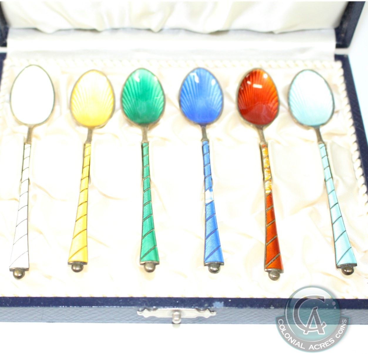 Vintage ELA Denmark Sterling Enamel Demitasse Spoon set with Original Case. Each spoon measures 3 3/4" with a fully enameled handle and bowl in 6 different vibrant colours. Spoons are in wonderful condition with the exception of some enamel loss on the Deep Blue and Red Spoons. Total weight of the spoons are 49.75 grams.