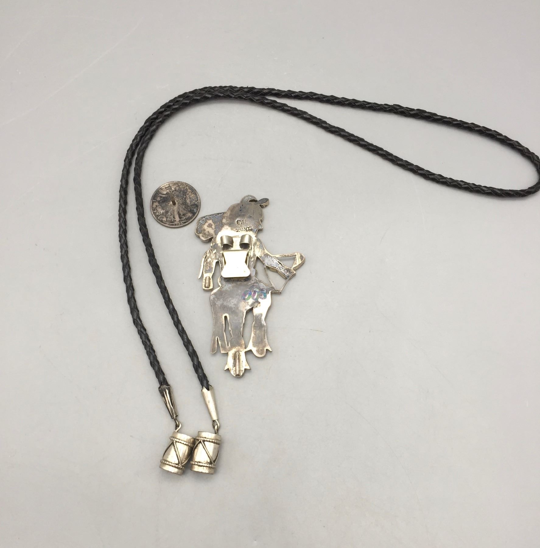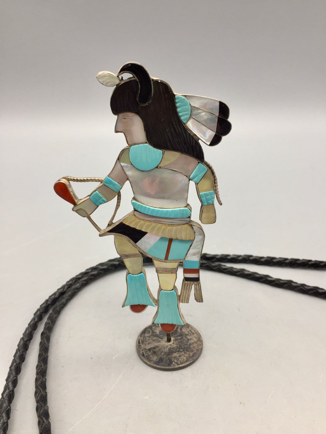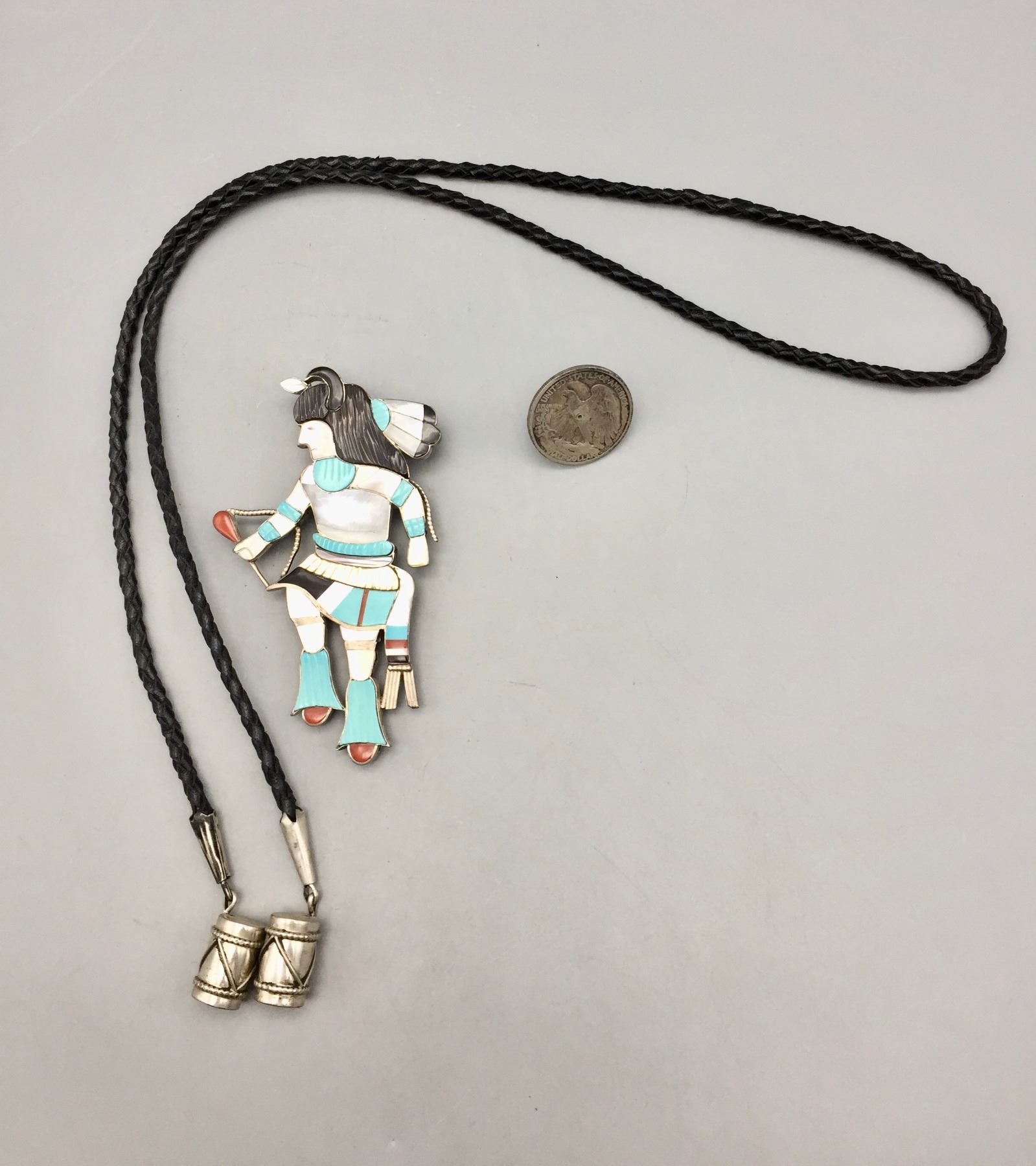 Description: Presented for sale in this lot is a very nice, highly collectible, bolo by the master Zuni artist, Eddie Beyuka. It has a black leather cord with custom sterling silver tips, shaped as drums. The slide features a large inlay design featuring coral, shell, turquoise, mother of pearl, black onyx and the rare tortoise shell. It also comes with a stand. Tested as sterling silver. Please note that the cord is not attached to the slide as it was taken off to display on the little stand that came with it. Maker: Hallmarked EAB, Zuni. Edward Beyuka, Zuni, (1921 - 2002) Approx. Age: Vintage. Size: Slide measures 4-3/4” tall and 2-1/2”w. Fits a 44” neck. Weighs 83 grams. Condition: Good for its age, normal wear expected. Please look closely at the pictures - they are an important part of our description. Shipping: There will be a $5 handling / packaging fee for shipping this lot. The actual cost of postage will be added on top of that.