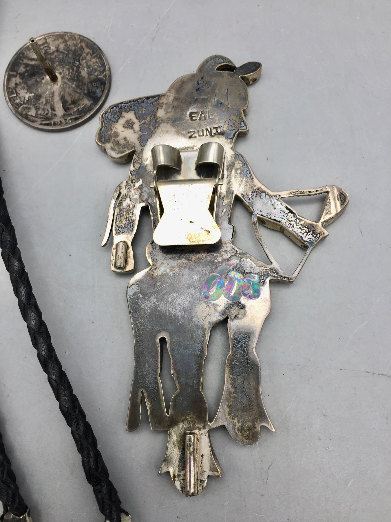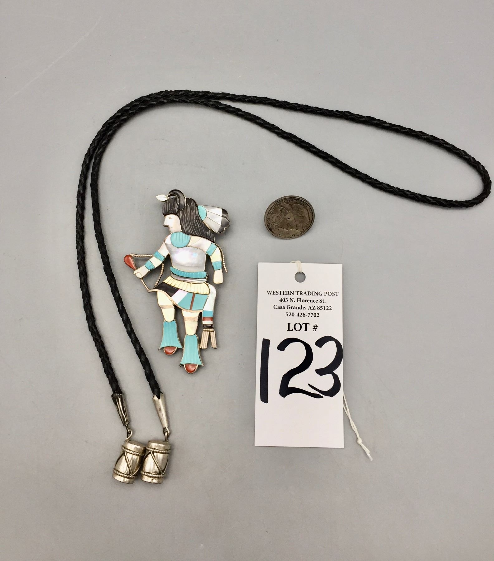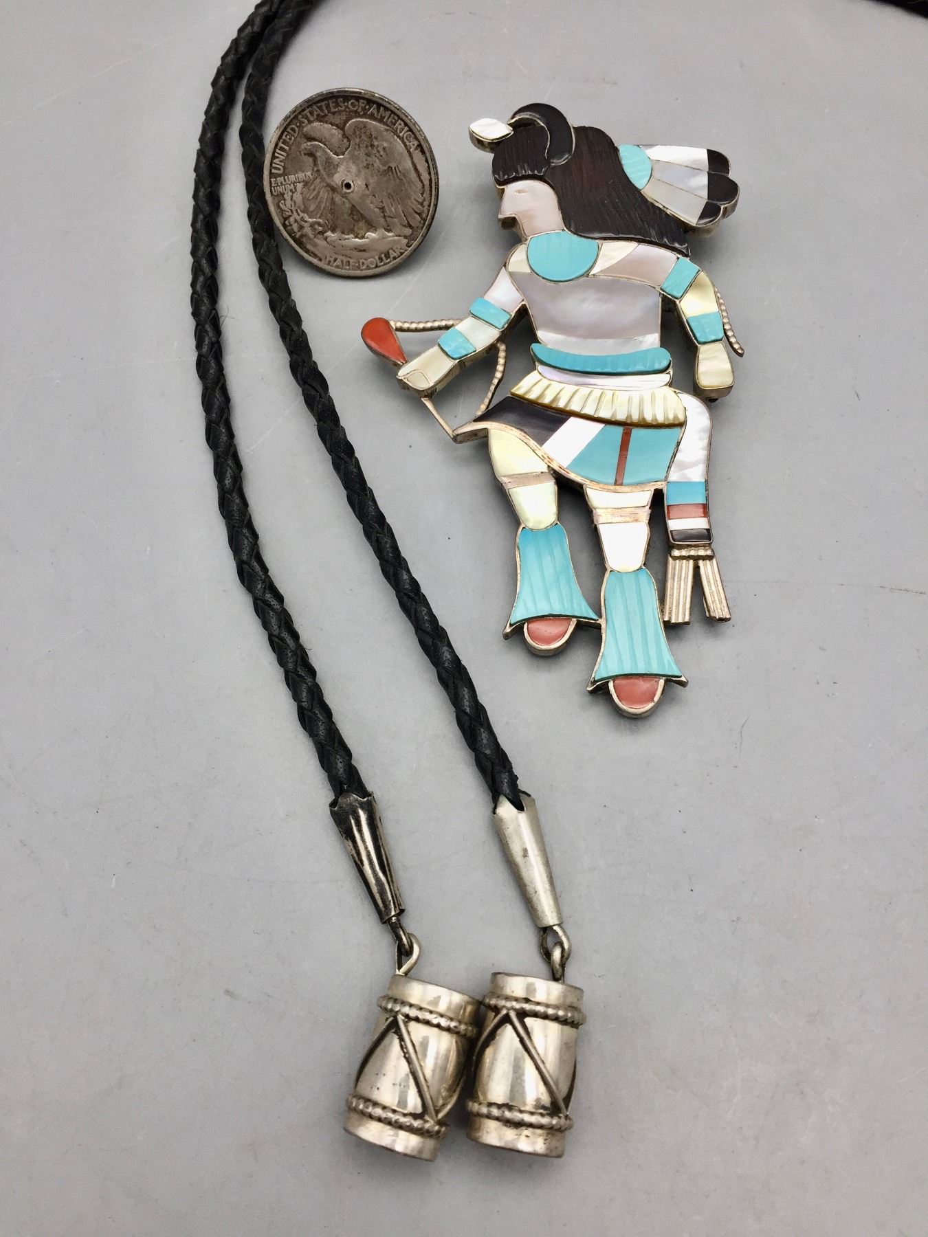 Description: Presented for sale in this lot is a very nice, highly collectible, bolo by the master Zuni artist, Eddie Beyuka. It has a black leather cord with custom sterling silver tips, shaped as drums. The slide features a large inlay design featuring coral, shell, turquoise, mother of pearl, black onyx and the rare tortoise shell. It also comes with a stand. Tested as sterling silver. Please note that the cord is not attached to the slide as it was taken off to display on the little stand that came with it. Maker: Hallmarked EAB, Zuni. Edward Beyuka, Zuni, (1921 - 2002) Approx. Age: Vintage. Size: Slide measures 4-3/4” tall and 2-1/2”w. Fits a 44” neck. Weighs 83 grams. Condition: Good for its age, normal wear expected. Please look closely at the pictures - they are an important part of our description. Shipping: There will be a $5 handling / packaging fee for shipping this lot. The actual cost of postage will be added on top of that.