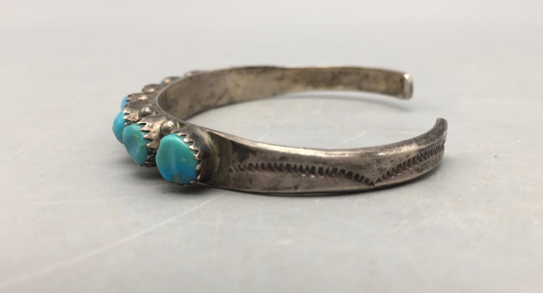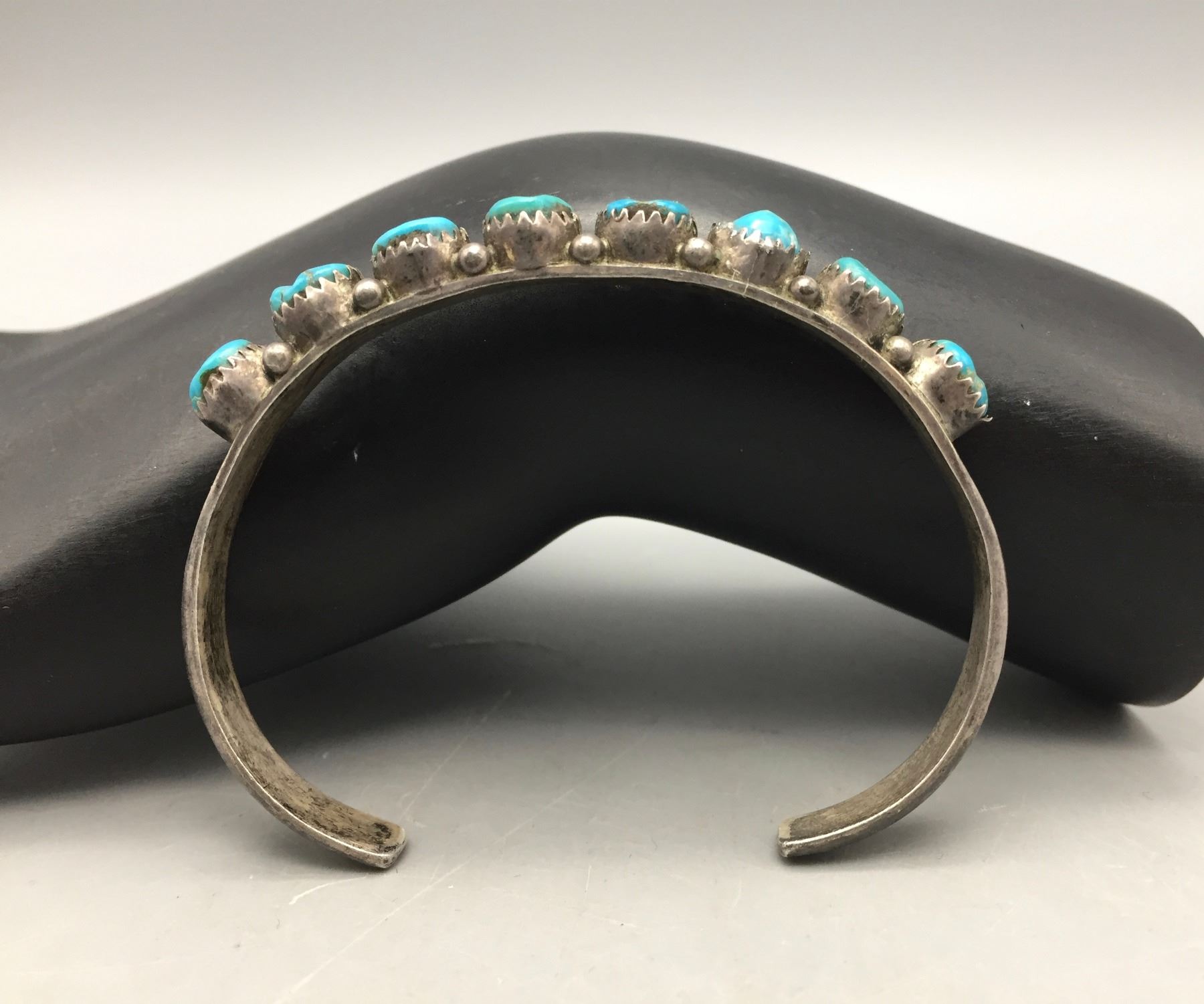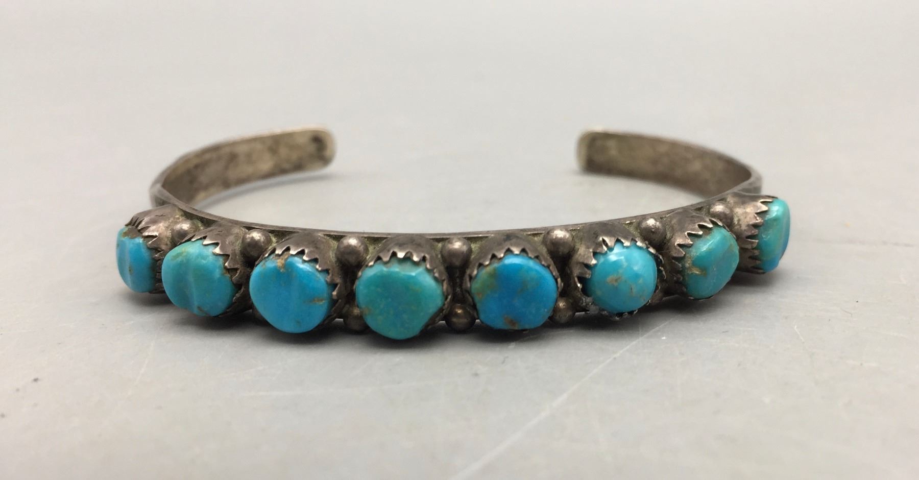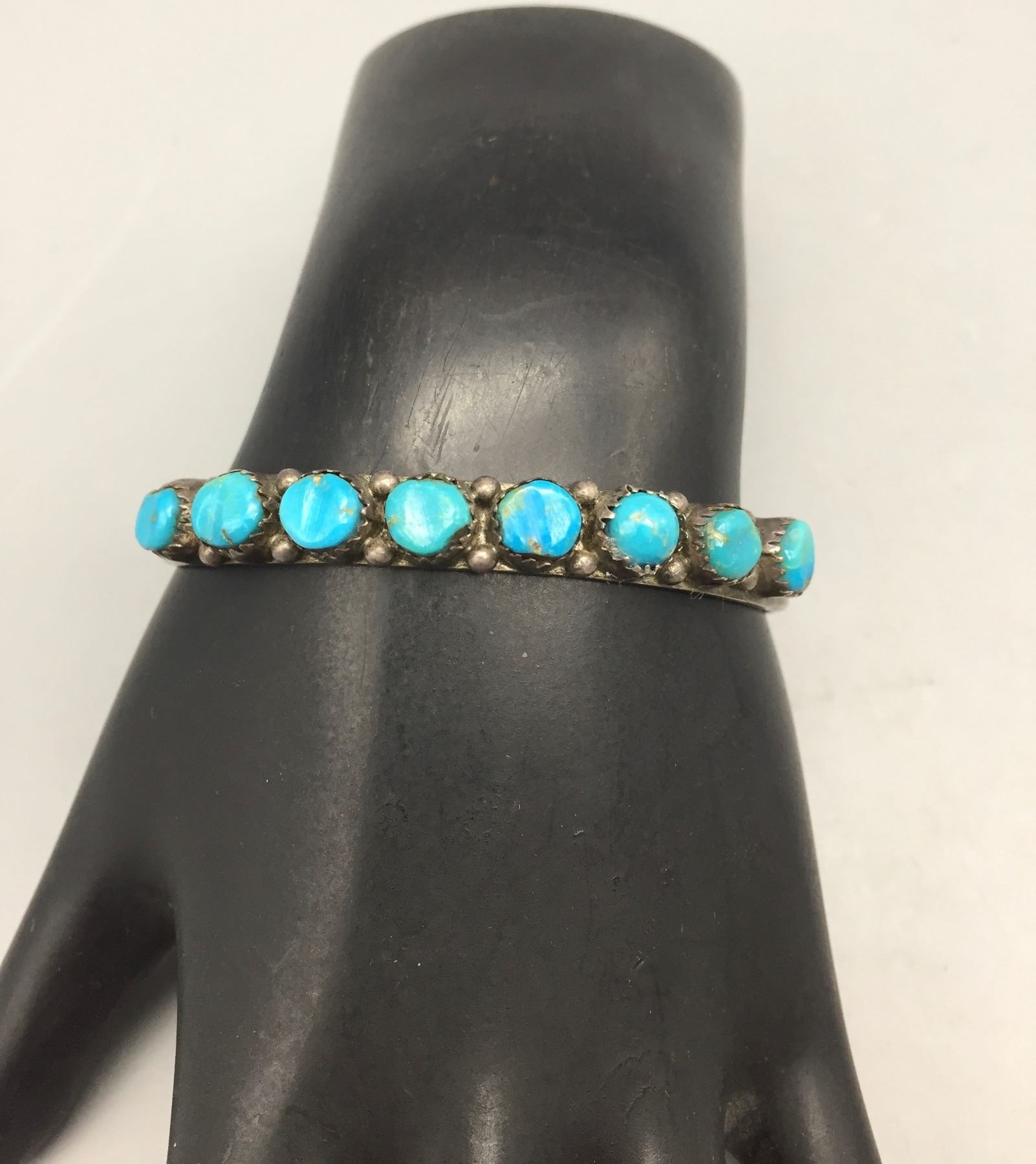 Description: For your consideration we offer this vintage, eight stone, carved turquoise and sterling silver cuff bracelet.