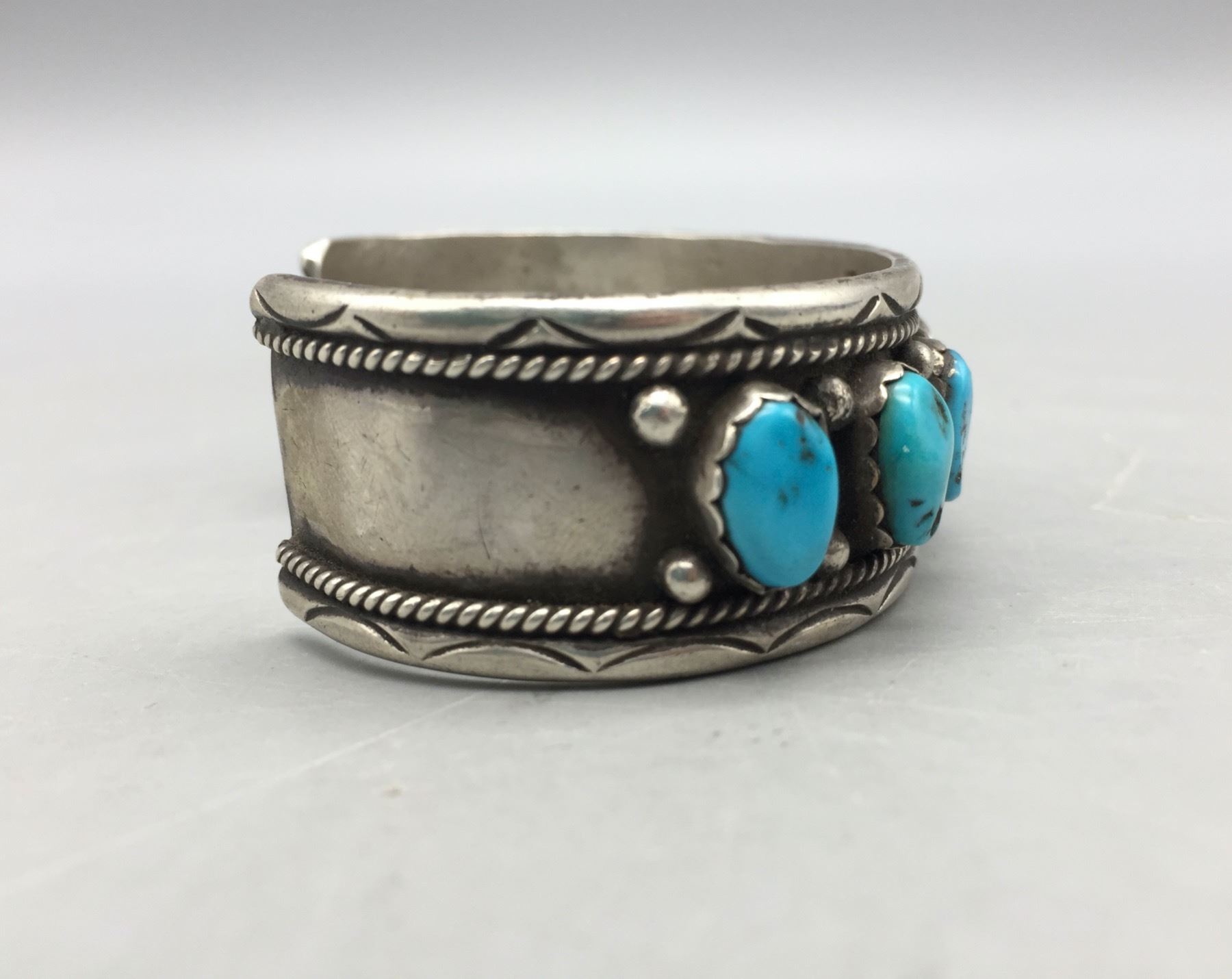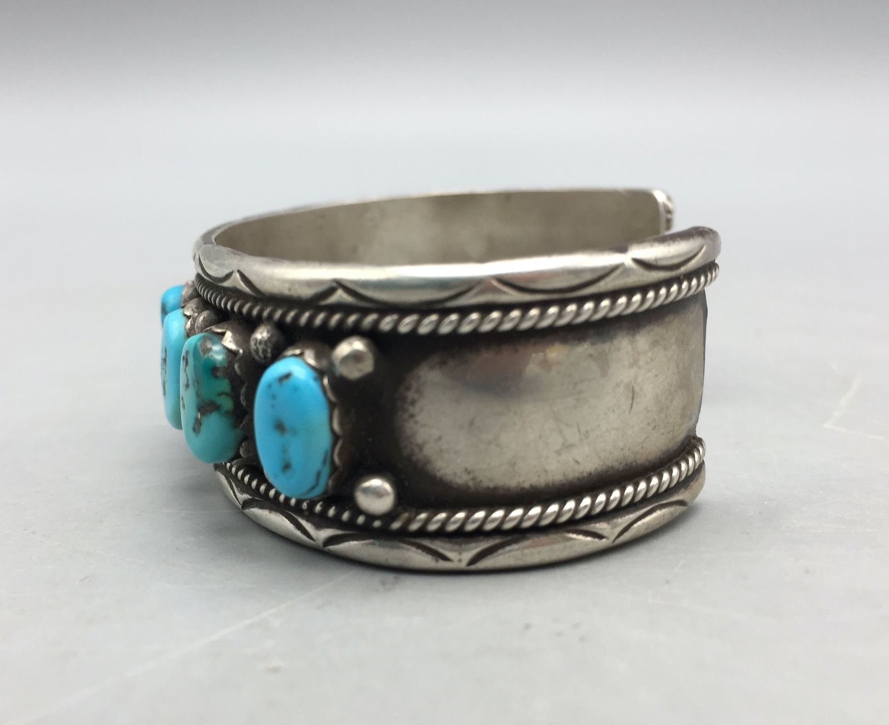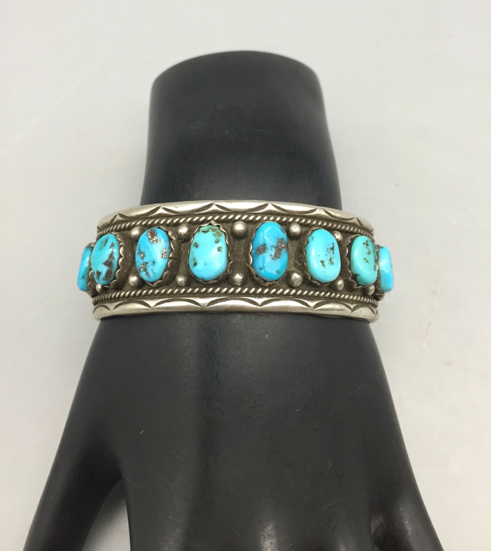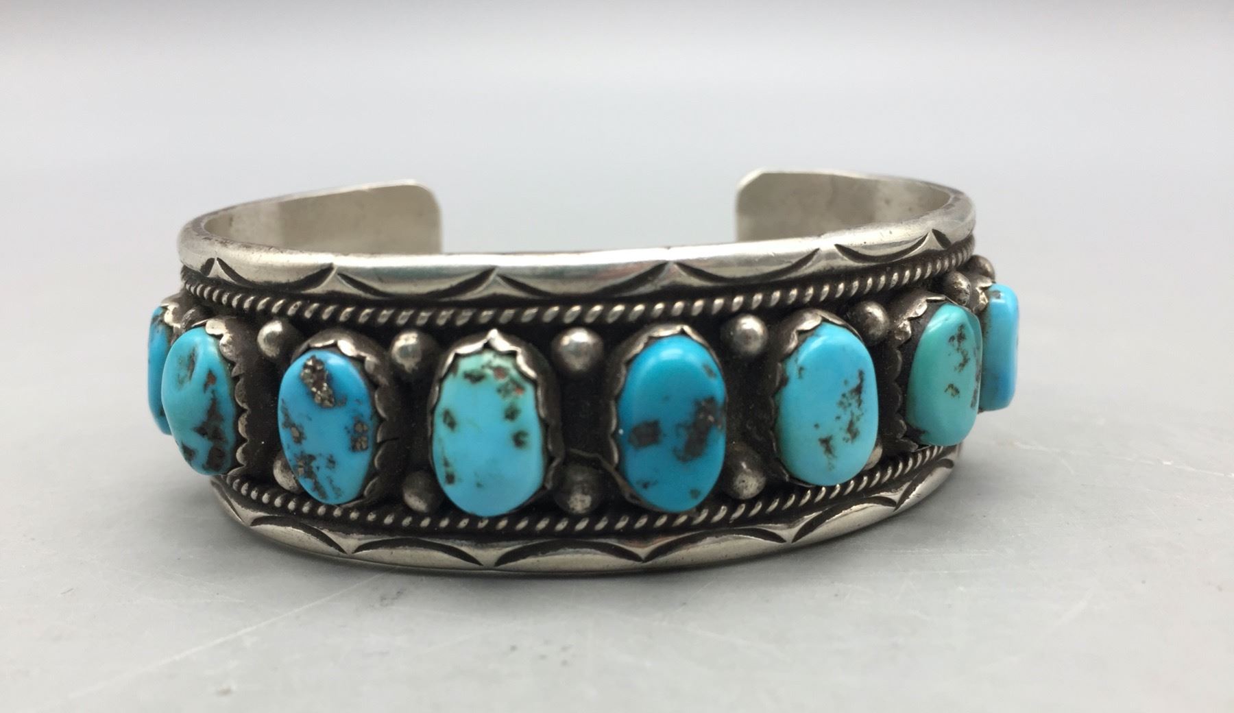 Description: For sale in this lot we have a great eight-stone turquoise bracelet. This is a pretty bracelet with silver dot accents and it is sterling silver. Maker: Hallmarked FJ. Approx. Age: Vintage. Size: Inside circumference measures 5-1/2â€. Opening is an additional 1-1/8â€, fitting a 6-5/8†wrist. Width is 7/8â€. Weighs 38.9 grams. Condition: Good for its age, normal wear expected. Please look closely at the pictures - they are an important part of our description. Shipping: There will be a $5 handling / packaging fee for shipping this lot. The actual cost of postage will be added on top of that.