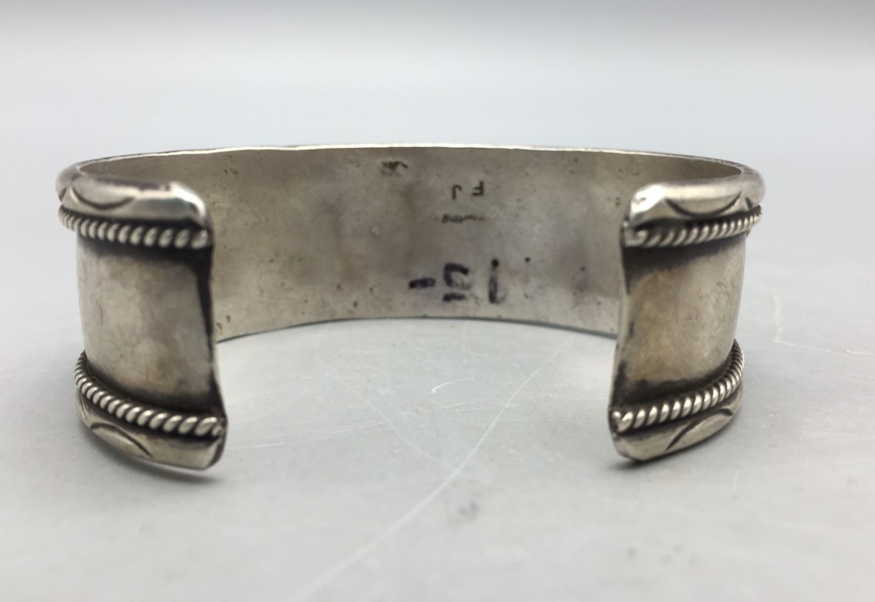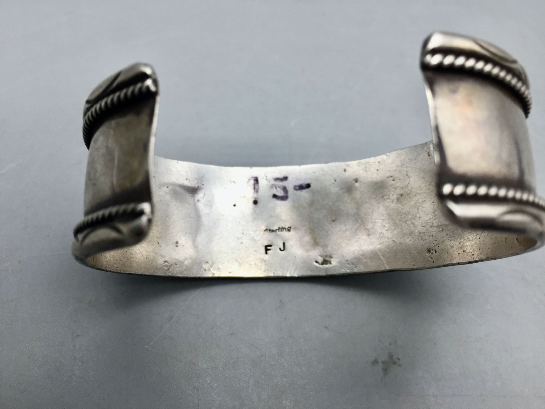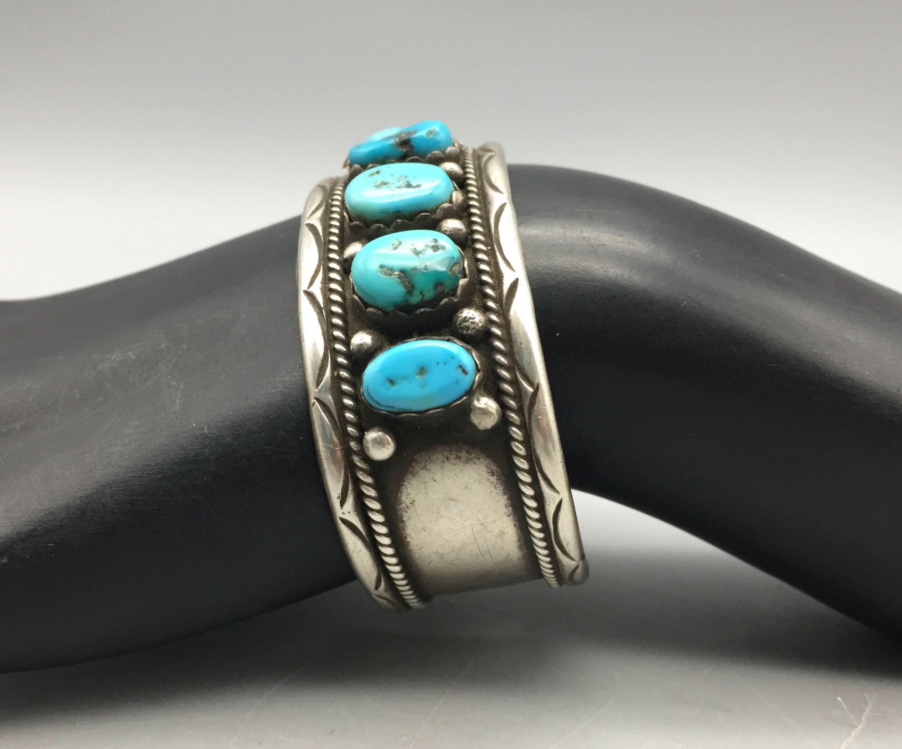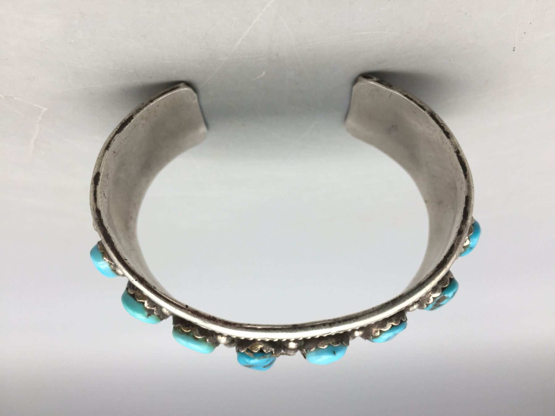 Description: For sale in this lot we have a great eight-stone turquoise bracelet. This is a pretty bracelet with silver dot accents and it is sterling silver. Maker: Hallmarked FJ. Approx. Age: Vintage. Size: Inside circumference measures 5-1/2â€. Opening is an additional 1-1/8â€, fitting a 6-5/8†wrist. Width is 7/8â€. Weighs 38.9 grams. Condition: Good for its age, normal wear expected. Please look closely at the pictures - they are an important part of our description. Shipping: There will be a $5 handling / packaging fee for shipping this lot. The actual cost of postage will be added on top of that.