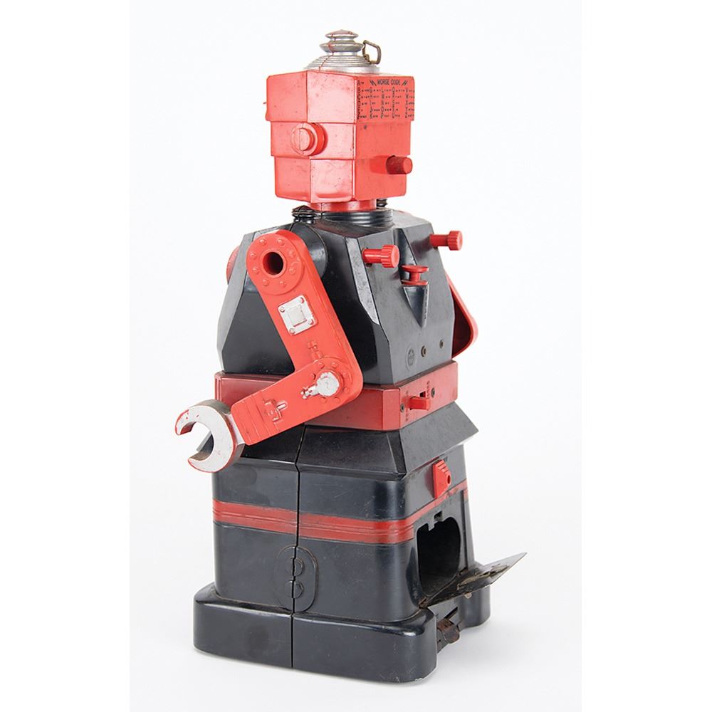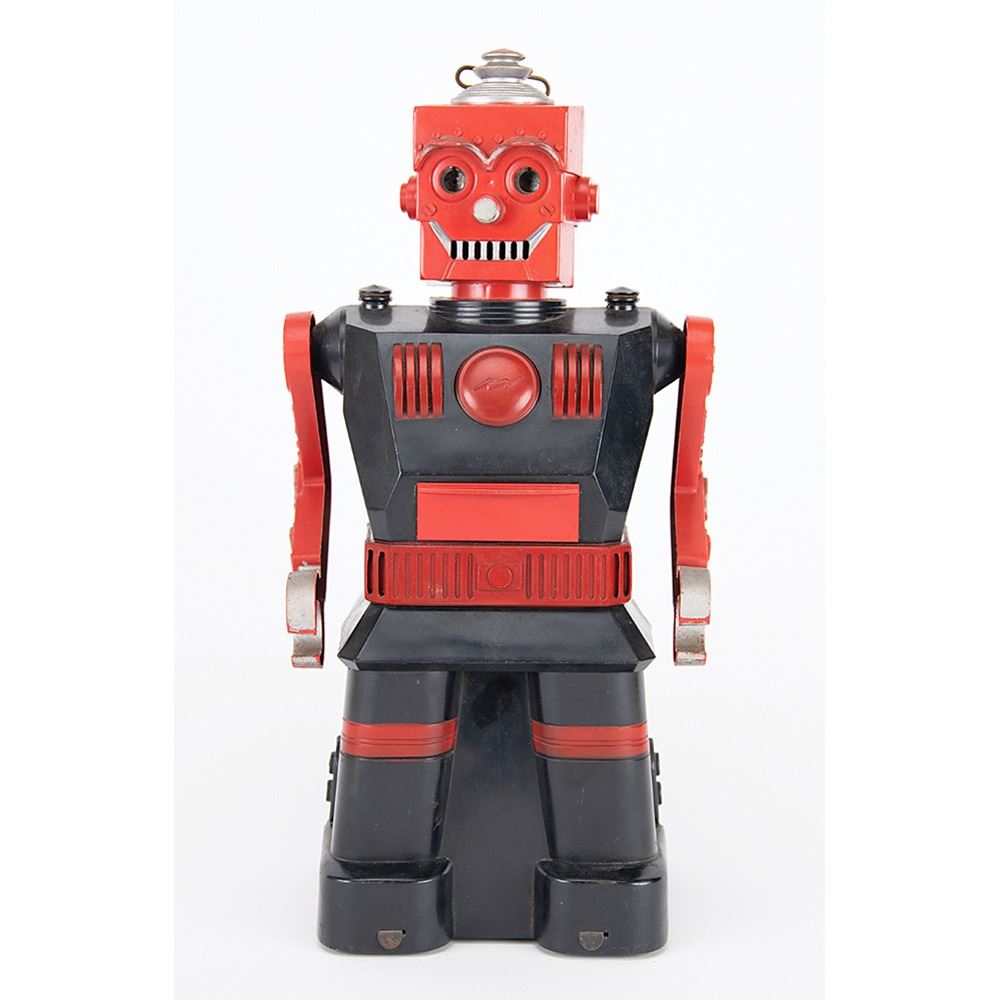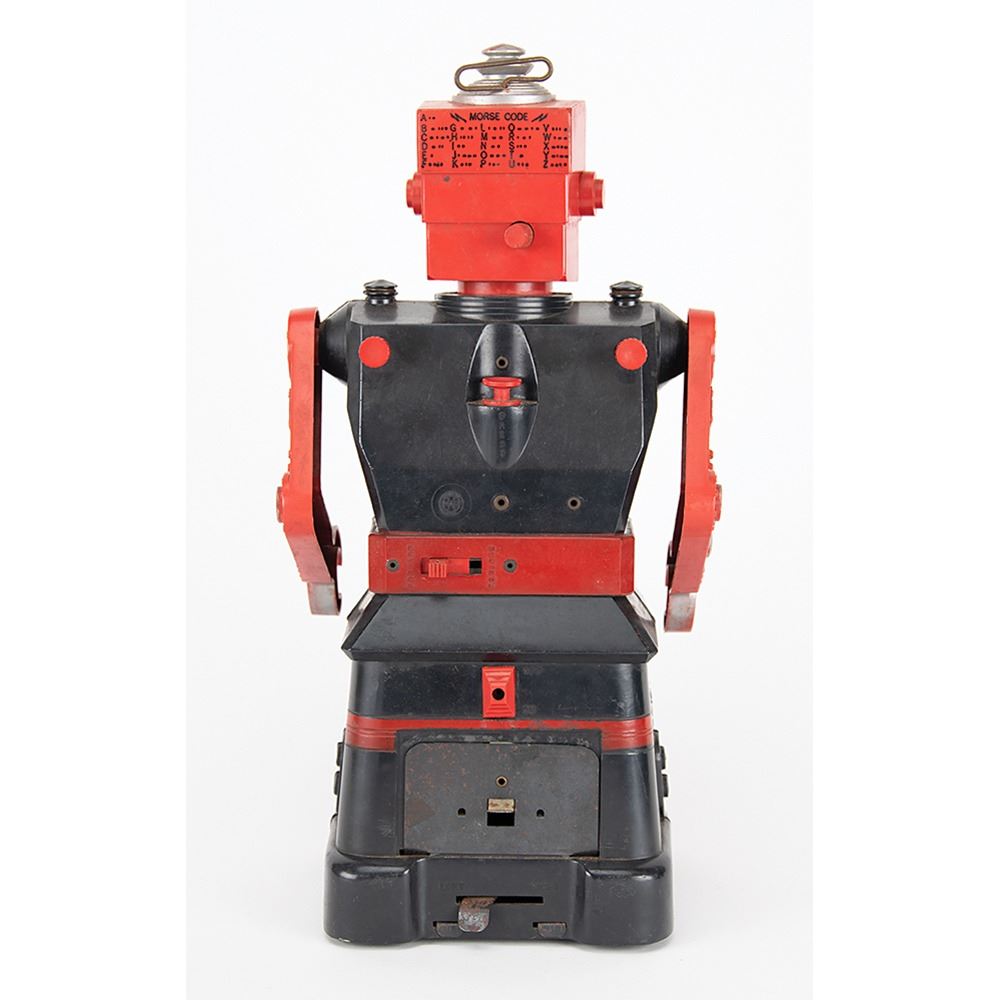 Vintage circa late 1950s battery-operated "Electric Robot" toy robot from the "Electric Robot and Son" set, made in the U.S.A. by Marx, standing at 14.5Àù tall. The black-and-red plastic robot boasts a wide grin, drawer in its chest, and Morse code key with button on the back of its head; it is missing its eye bulbs, miniature tools, and "Son" figure.