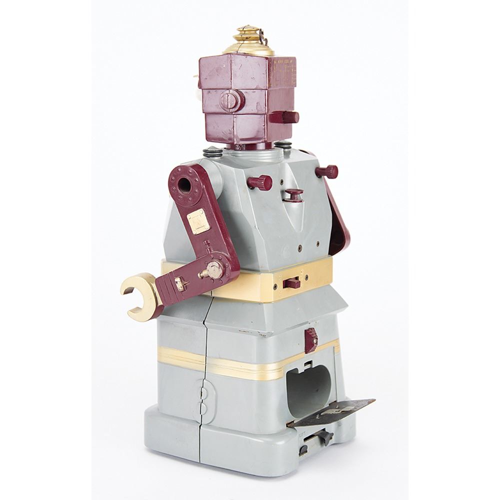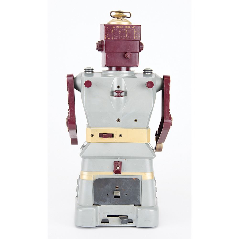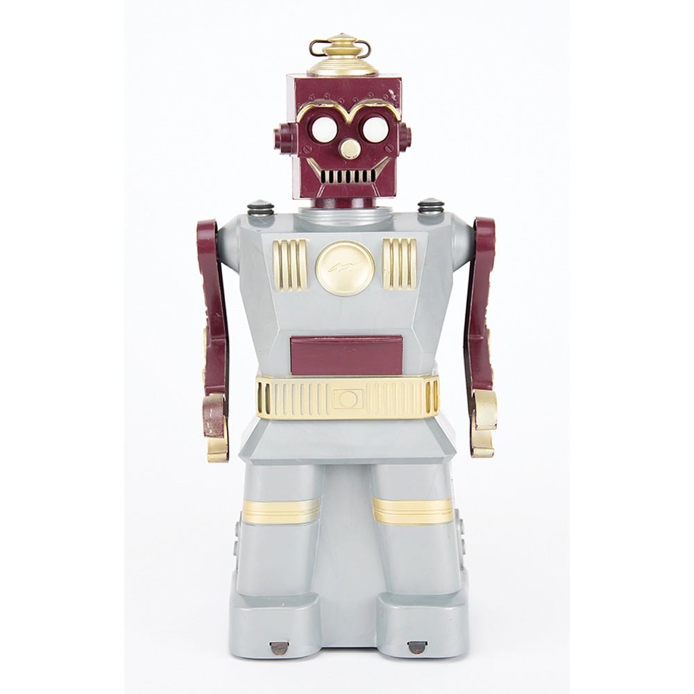 Vintage circa late 1950s battery-operated "Electric Robot" toy robot from the "Electric Robot and Son" set, made in the U.S.A. by Marx, standing at 14.5Àù tall. The silver-and-burgundy plastic robot boasts a wide grin, drawer in its chest, and Morse code key with button on the back of its head; it is missing its miniature tools and "Son" figure.