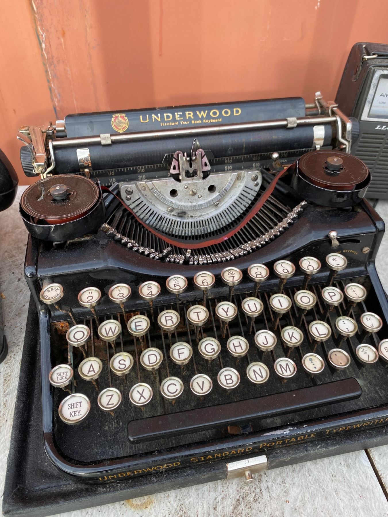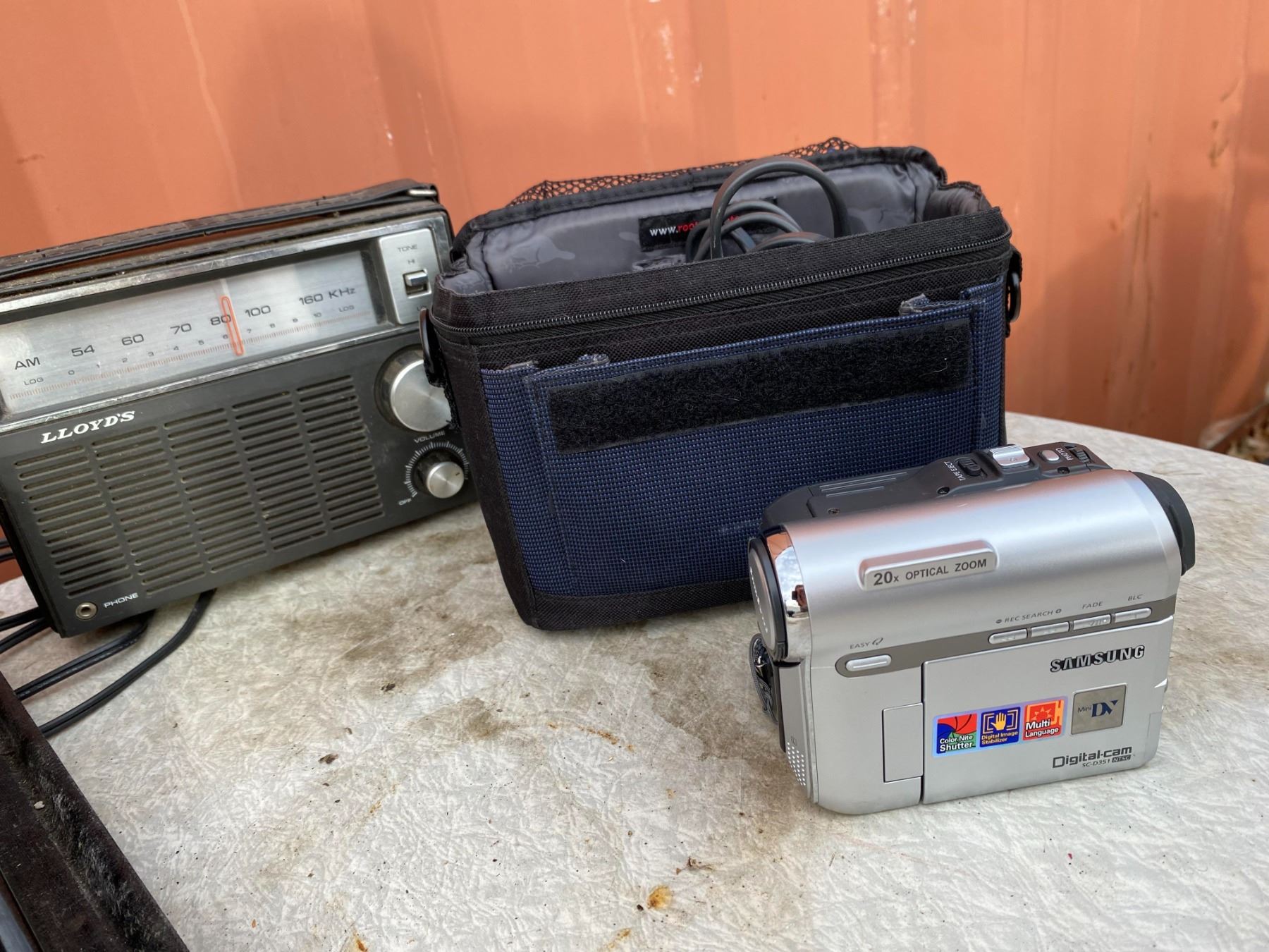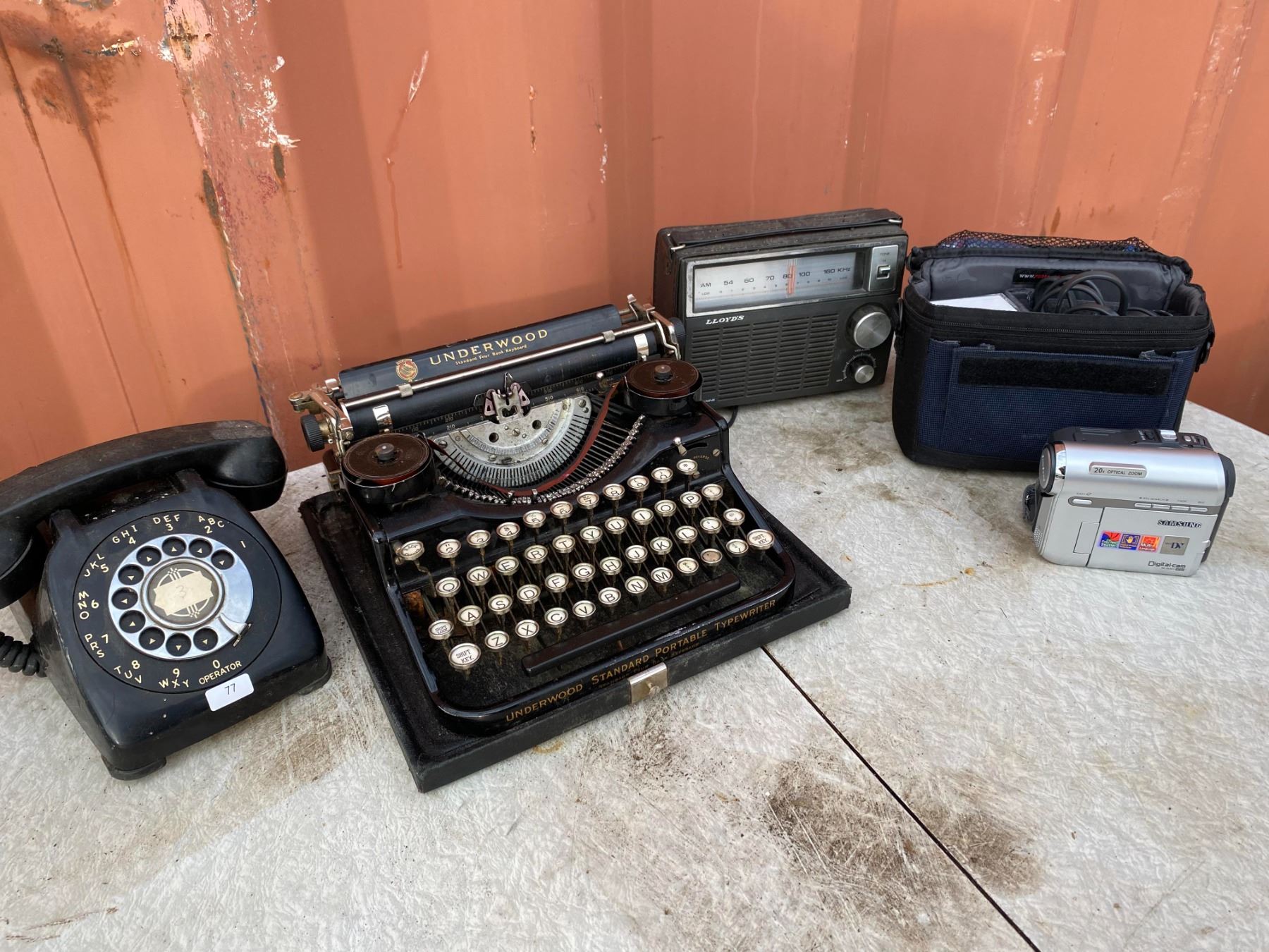 Lot includes Underwood typewriter, rotary dial telephone, Lloyds radio, camcorder, and accessories. Items appear untested and show age wear excellent for display or restoration.