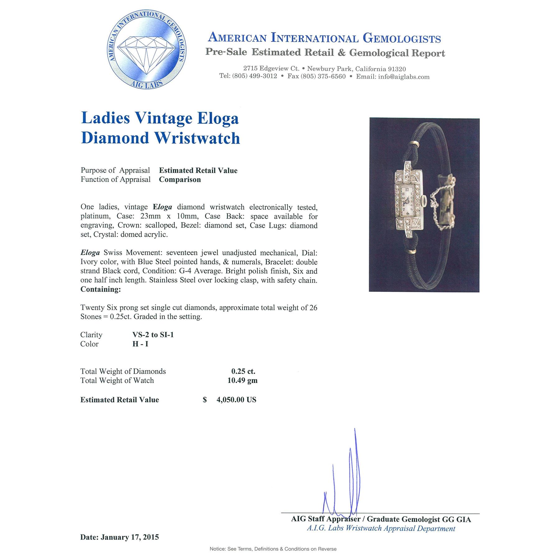 One ladies, vintage Eloga diamond wristwatch electronically tested, platinum, Case: 23mm x 10mm, Case Back: space available for engraving, Crown: scalloped, Bezel: diamond set, Case Lugs: diamond set, Crystal: domed acrylic. Eloga Swiss Movement: seventeen jewel unadjusted mechanical, Dial: Ivory color, with Blue Steel pointed hands, & numerals, Bracelet: double strand Black cord, Condition: G-4 Average. Bright polish finish, Six and one half inch length. Stainless Steel over locking clasp, with safety chain. Containing: Twenty Six prong set single cut diamonds, approximate. Total Weight of 26 Stones = 0.25ct. Graded in the setting. Clarity: VS-2 to SI-1. Color: H - I. Total Weight of Diamonds 0.25ct. Total Weight of Watch 10.49 grams. AIG Appraised at $4,050.00.
