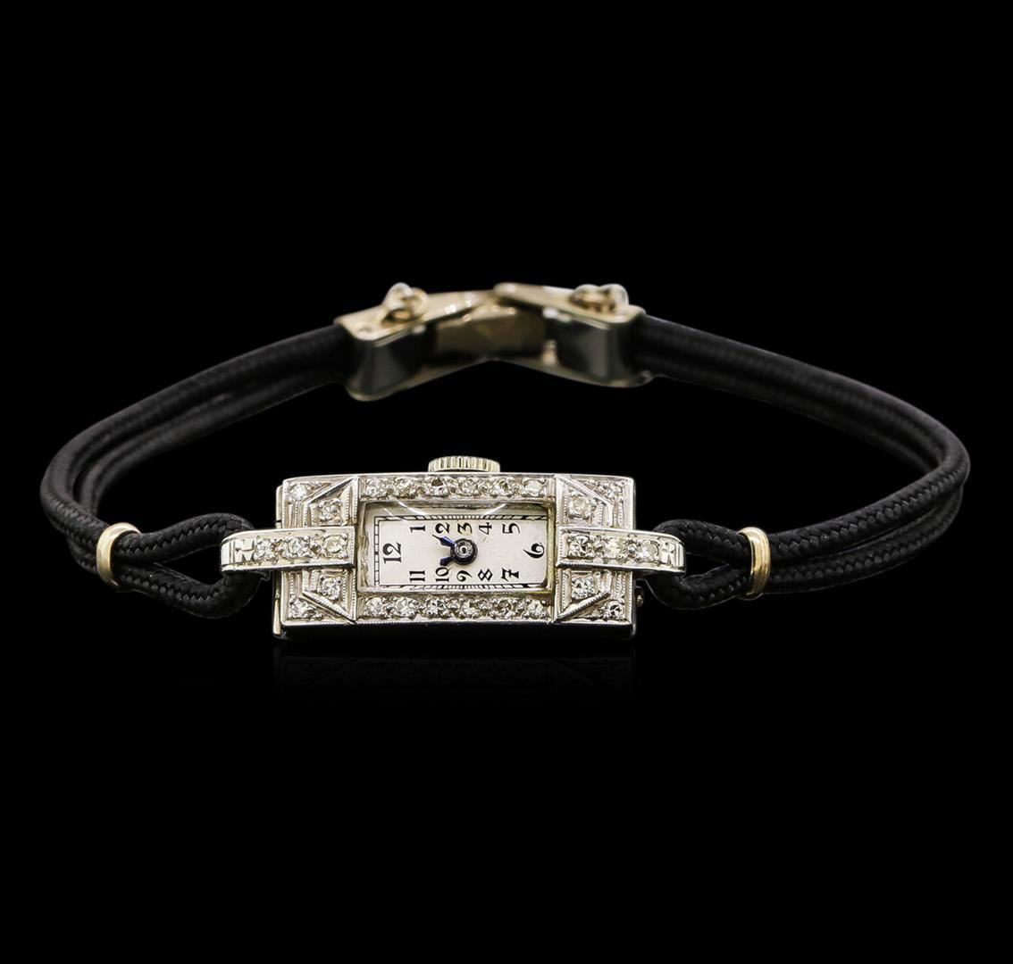 One ladies, vintage Eloga diamond wristwatch electronically tested, platinum, Case: 23mm x 10mm, Case Back: space available for engraving, Crown: scalloped, Bezel: diamond set, Case Lugs: diamond set, Crystal: domed acrylic. Eloga Swiss Movement: seventeen jewel unadjusted mechanical, Dial: Ivory color, with Blue Steel pointed hands, & numerals, Bracelet: double strand Black cord, Condition: G-4 Average. Bright polish finish, Six and one half inch length. Stainless Steel over locking clasp, with safety chain. Containing: Twenty Six prong set single cut diamonds, approximate. Total Weight of 26 Stones = 0.25ct. Graded in the setting. Clarity: VS-2 to SI-1. Color: H - I. Total Weight of Diamonds 0.25ct. Total Weight of Watch 10.49 grams. AIG Appraised.