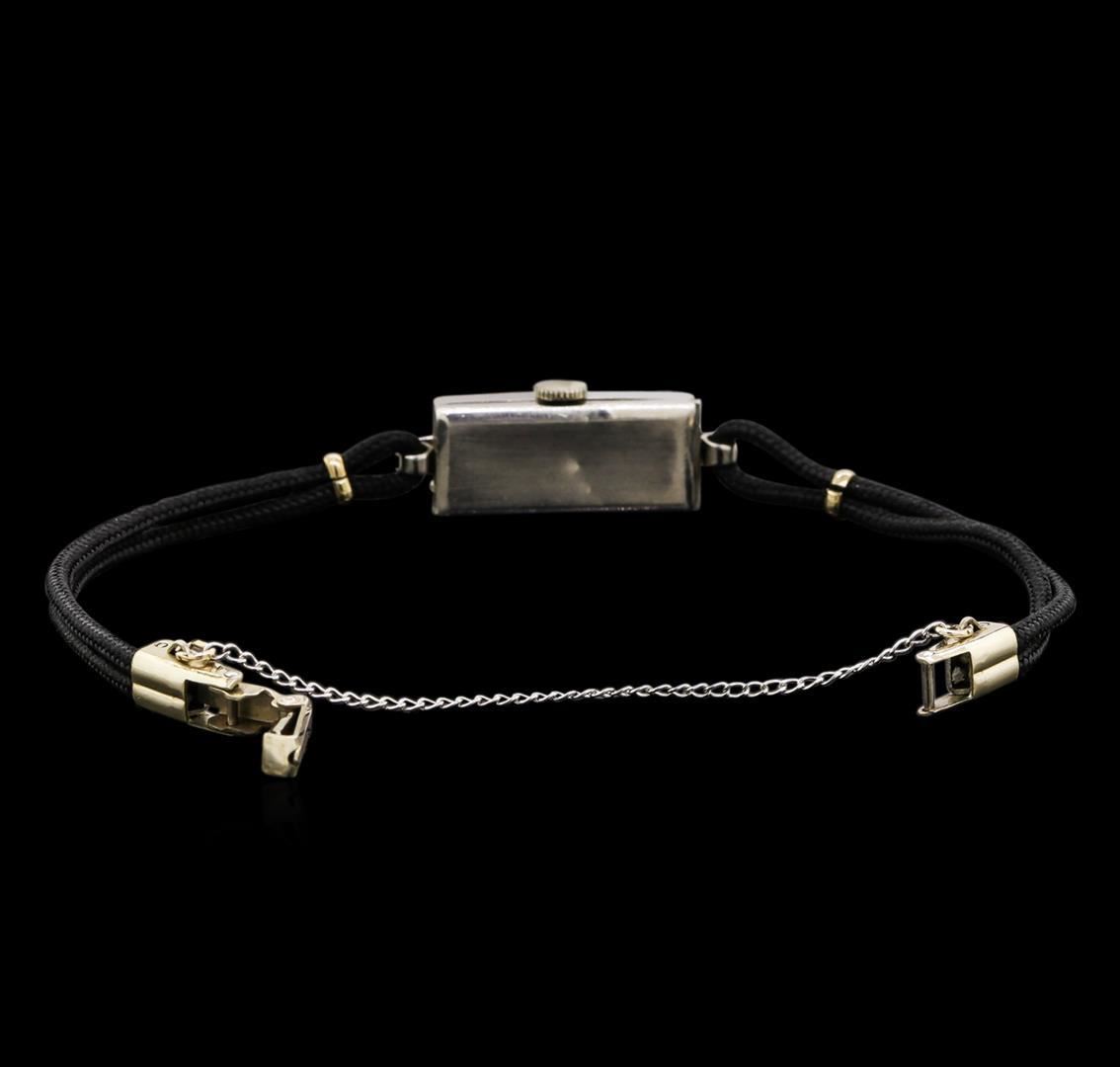 One ladies, vintage Eloga diamond wristwatch electronically tested, platinum, Case: 23mm x 10mm, Case Back: space available for engraving, Crown: scalloped, Bezel: diamond set, Case Lugs: diamond set, Crystal: domed acrylic. Eloga Swiss Movement: seventeen jewel unadjusted mechanical, Dial: Ivory color, with Blue Steel pointed hands, & numerals, Bracelet: double strand Black cord, Condition: G-4 Average. Bright polish finish, Six and one half inch length. Stainless Steel over locking clasp, with safety chain. Containing: Twenty Six prong set single cut diamonds, approximate. Total Weight of 26 Stones = 0.25ct. Graded in the setting. Clarity: VS-2 to SI-1. Color: H - I. Total Weight of Diamonds 0.25ct. Total Weight of Watch 10.49 grams. AIG Appraised.