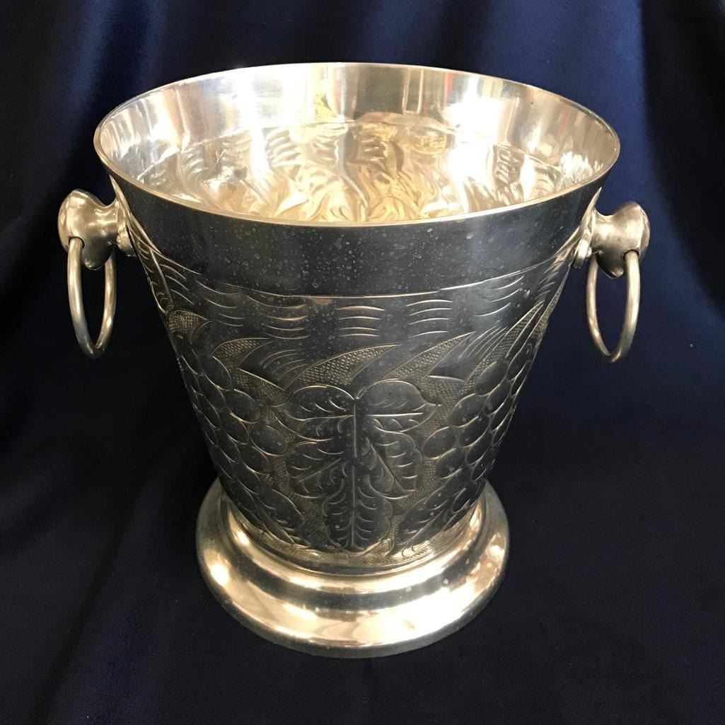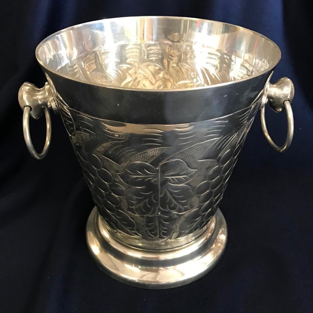 Lovely & rare, vintage embossed grapes motif, handled silver metal champagne ice bucket. Made in India. 9"H X 10"W X 8" D.